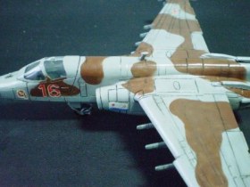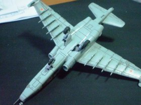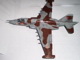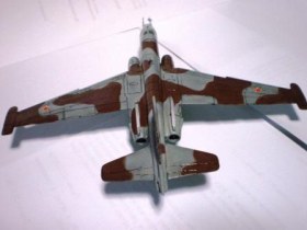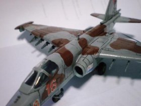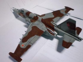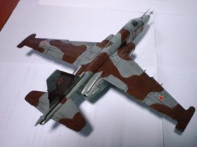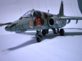 В своей работе я очень хотел изобразить Су – 25 160 УАП, г. Борисоглебск, ранее данный ЛА базировался на аЭродроме Оленегорск, Мурманская область. Доработок при сборке не делал за исключением резиновых колёс от «Экипажа» и трубок на основных стойках шасси из медной проволоки от преждевременно ушедшего трансформатора. Во время сборки активно применялась шпаклёвка и разного рода напильники. Окраска модели акрилом «Тамия», готовые цвета (высветлял какой-то примочкой от Хобби колор) XF-23 «Светло голубой», XF-25 «Морской светло-серый»,XF-52 «Flatearth», лак «Мотип» (мне кажеться зря), футура. Маски накладывал при помощи малярной ленты «Тамия» и вражеского пластелина «Blutack».