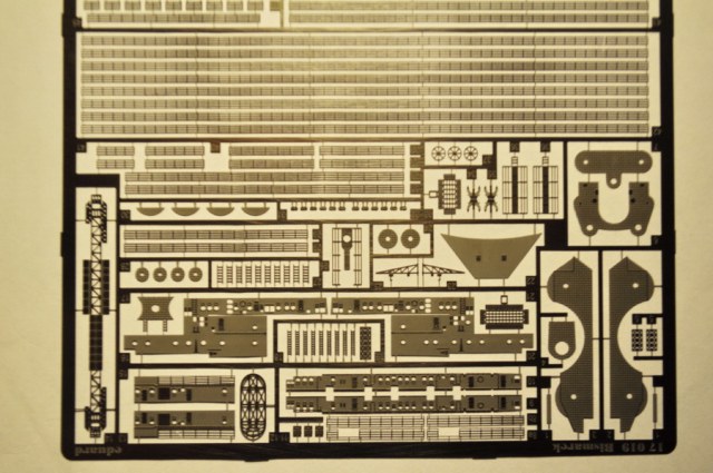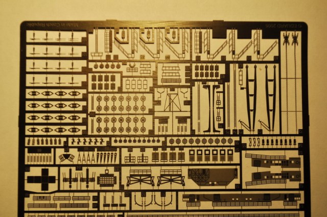 На фото вы можете увидеть леера, лестницы, цепи с якорями, краны, катушки двух типов, зенитки самые мелкие, зенитки двуствольные, двери, решетки на сигнальные прожектора (пардон, не знаю как правильно все называется), решетки на палубу, решетки на низ корпуса, двери для главных орудий и не только, радары, винты на самолеты, короб для главной мачты, верхняя часть мачты, кильблоки, катапульта, верх трубы, боковые и верхние части надстроек и прочее.
