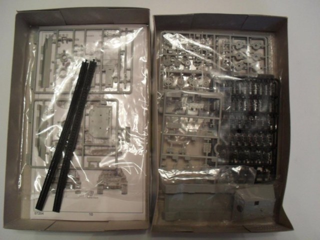 В стандартной картонной коробке размером 255х160х45 находятся 4 литника с деталям, а также рубка и ванна корпуса, в отдельных пакетиках. Гусеничная лента имеется в двух вариантах на выбор гибкая пластиковая(хорошо детализированная с обоих сторон) и наборная с прямыми участками, выполненными единой деталью.
