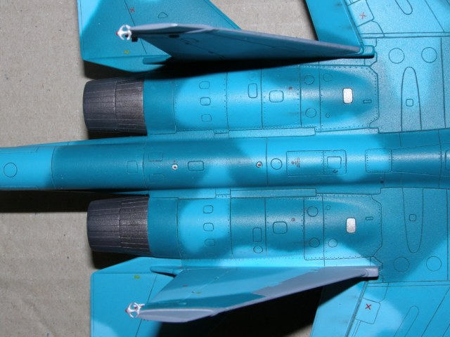 3. 3.Изменил форму законцовок килей, пригодился набор СУ-27 от Звезды (Накотне), добавил и разместил в правильном положении из проволоки и пластика на килях всяческие антенки и хвостовой АНО;