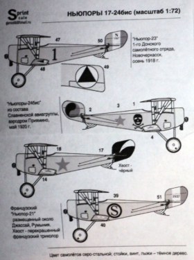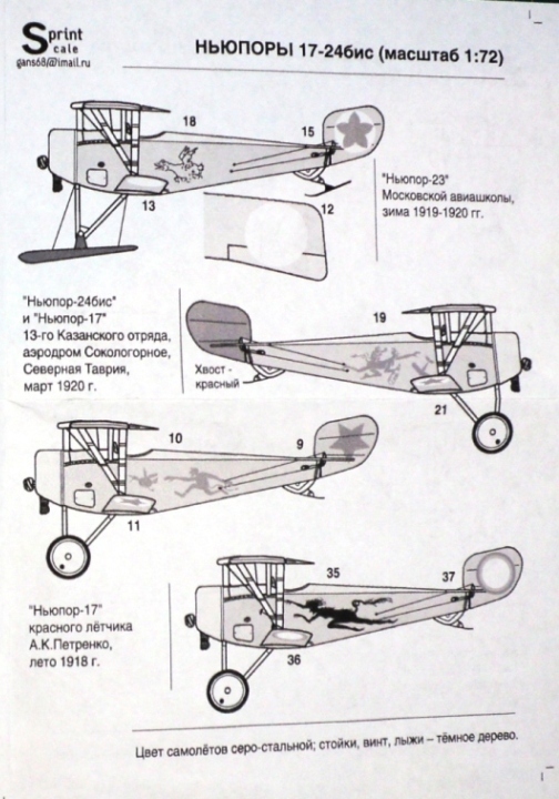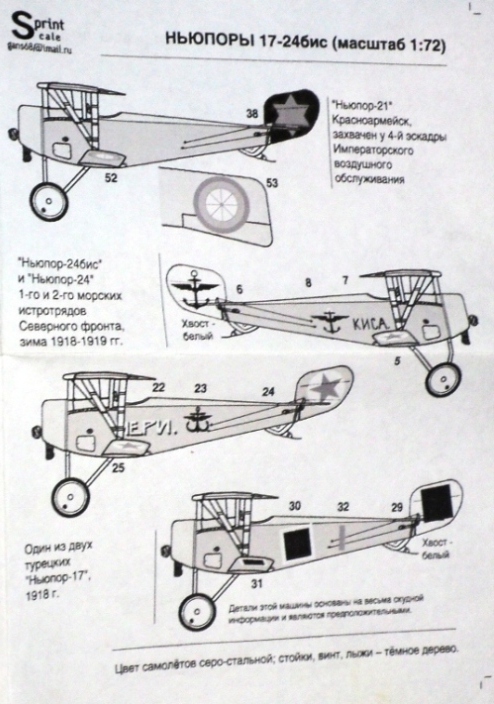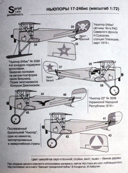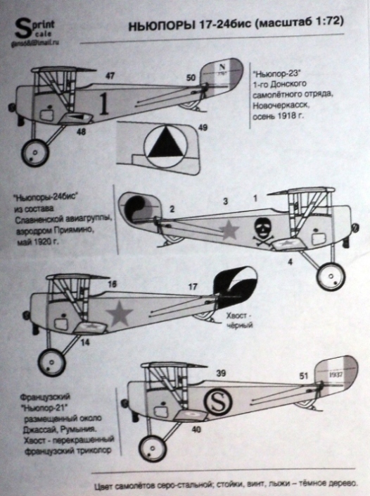 Специально для любителей тематики гражданской войны в России и не только, украинская фирма PrintScaleещё в прошлом году выпустила комплект декалей по этой тематике. Они предназначаются Ньюпоров 17, 21, 23, 24, 24бис. Не знаю как Ньюпор-21, но все остальные производят Роден и Эдуард.