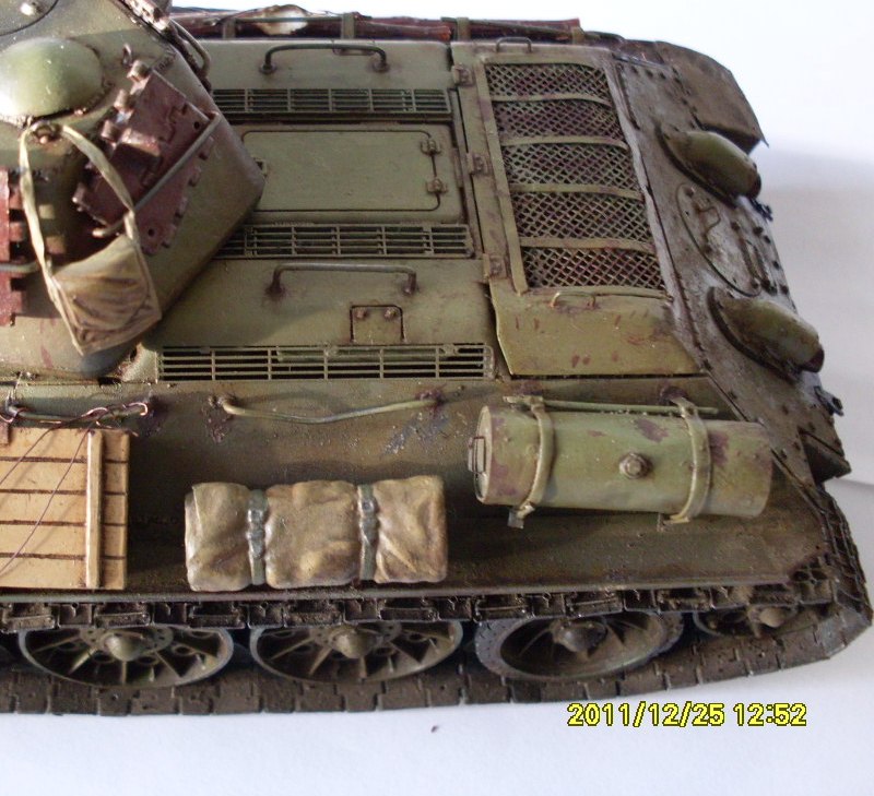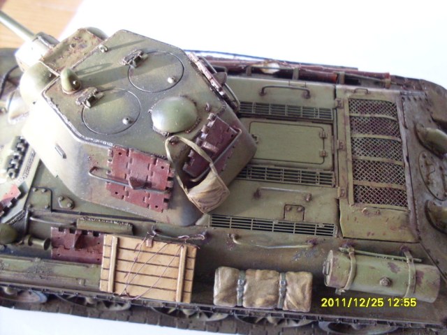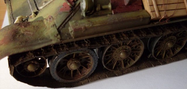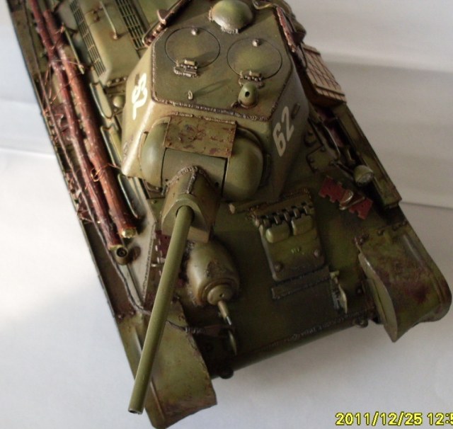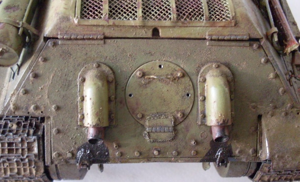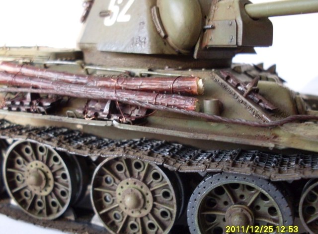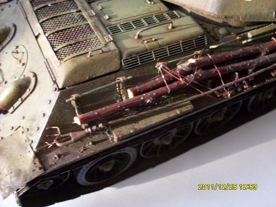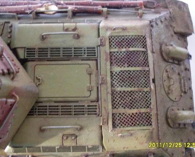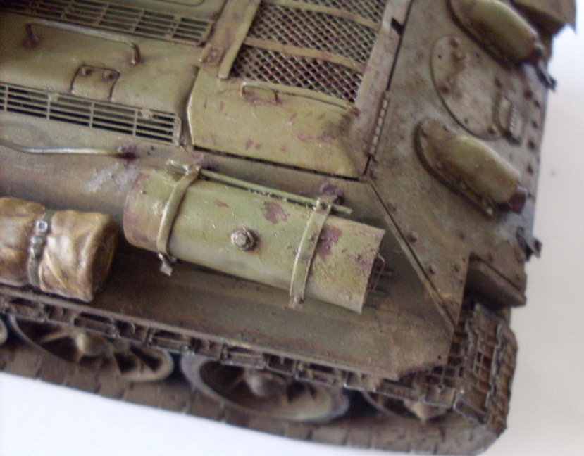 В целом хороший Т-34 получился. Бревна из тонких веточек не удачны, лучше убрать, на ремнях крепления брезента Вы немного отдохнули))), неудачно нанесен выхлоп - кажется, что из патрубков масло вылилось...