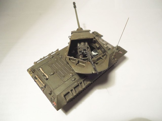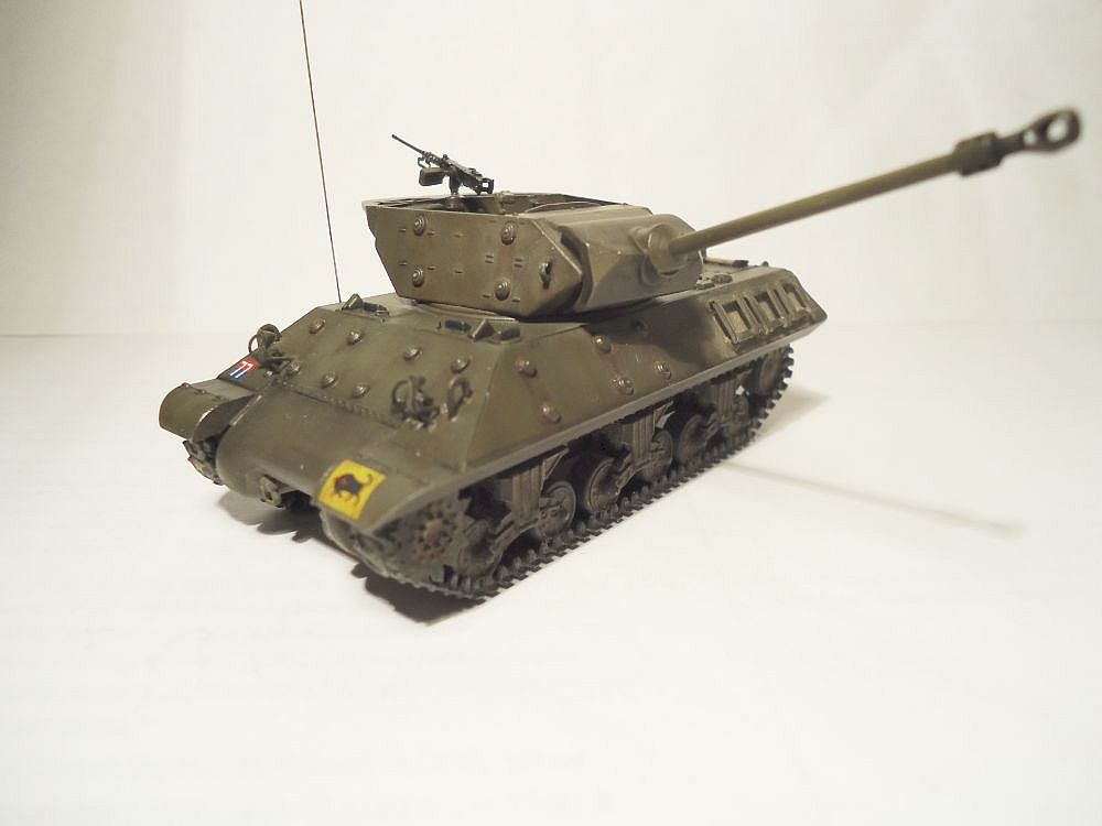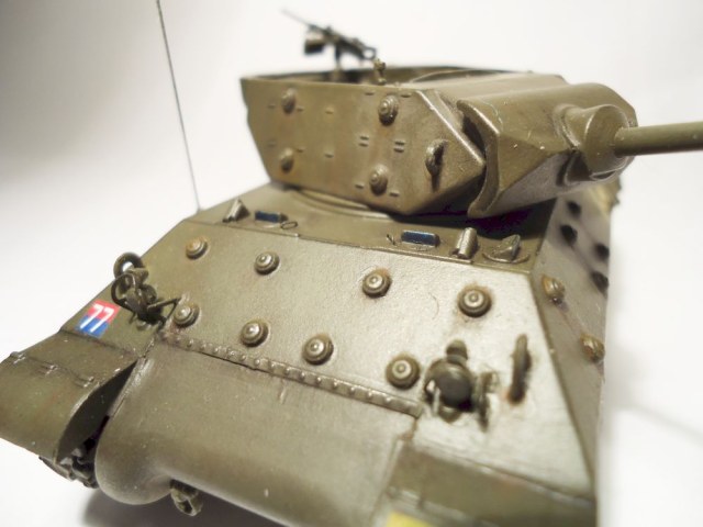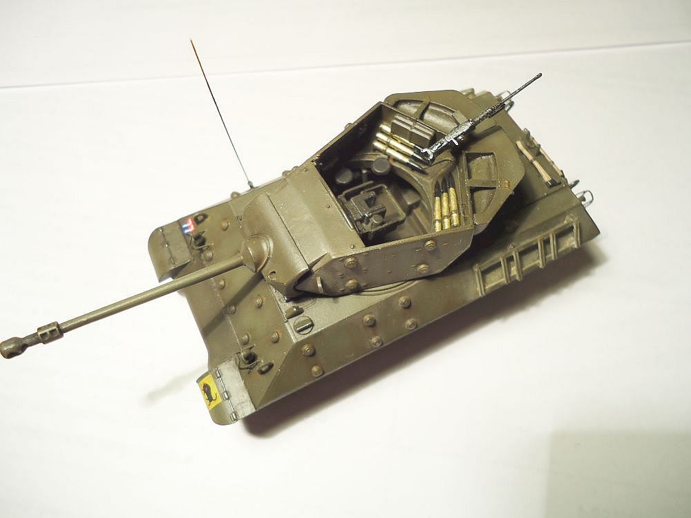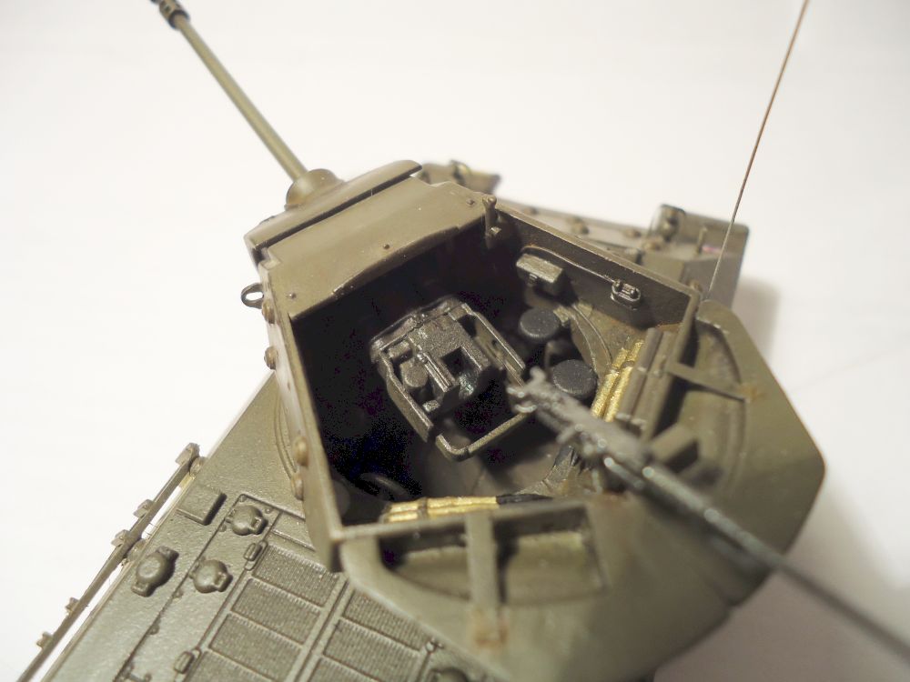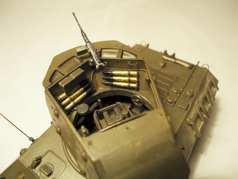 сделал небольшие доработки - антенна из струны, проводка в башне из проволки, одно из задних ограждений фар так же из проволки, так как родное потерял. добавлен пулемет от драгоновского шермана, ручки на люки - остатки травления того же шермана.
