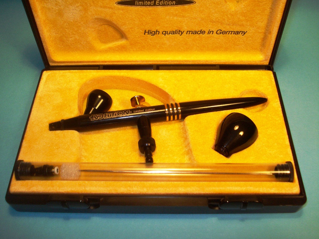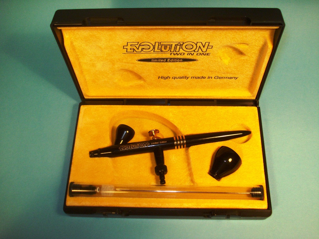 Укомплектовка как и у нормального EVOLUTION Two in One. То есть 0,2 и 0,4 мм сопло. 2 и 5 мл бочонки для краски.