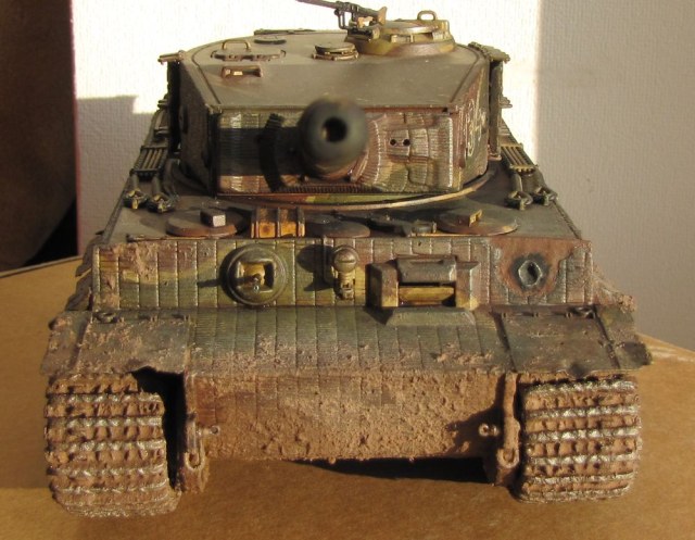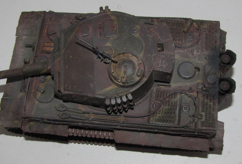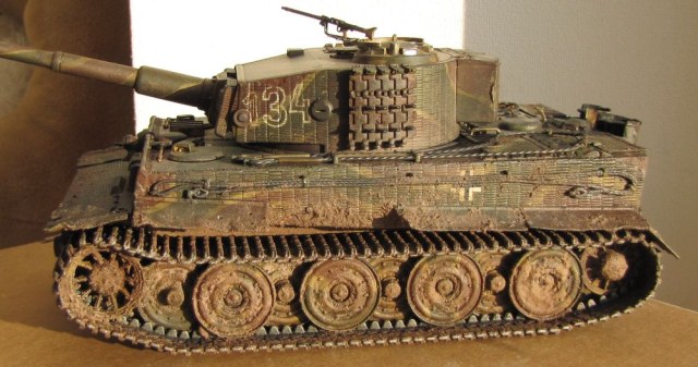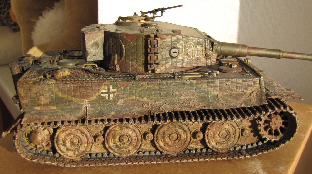 Здравствуйте Коропчане! Выношу на Ваш Суд очередную свою модель танка "ТИГР". Камуфляж 1-я рота 102-го тяжёлого танкового батальона СС. Will Fey. Нормандия. Июнь 1944. Пробовал с,имитировать попадание снаряда+грязь. Из доработок: сетки на МТО, ручки из проволоки, подводка к фаре, триплексы CD. Красил акрилом от "Звезды" кистью, фильтр масло+уайтспирит, пылил пастелью, грязь-натертая пастель, сода, акрил, клей ПВА. Номера рисованные, кресты-декали. Еще раз спасибо всем за советы. Смотрите, оценивайте, предлагайте и всех с наступающим новым годом!