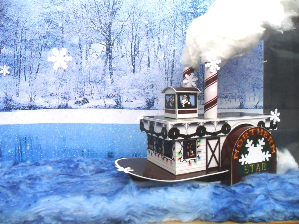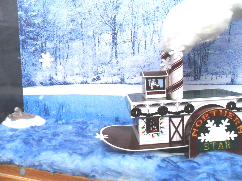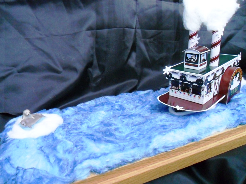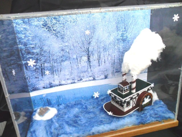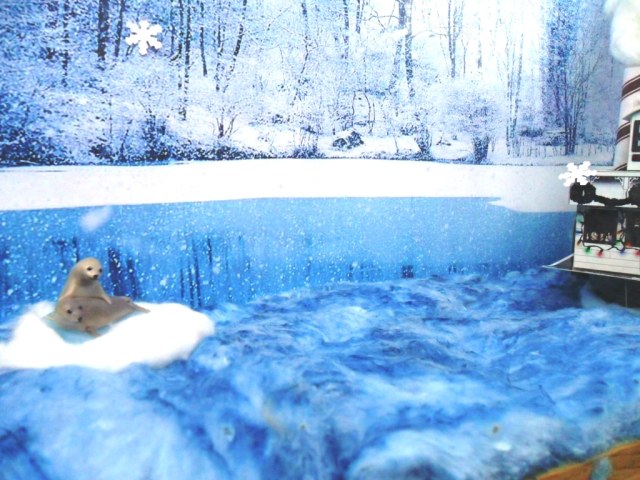 Сам футляр для диорамы уже как 1,5 года валялся на шкафу без надобности. Не долго думая, распечатал на принтере бумажные выкройки парохода деда Мороза и задний фон зимнего леса с речкой, кот. нашел в интернете. Морские котики, из "Киндерсюрприза" попали в сюжет случайно, валялись на полу.