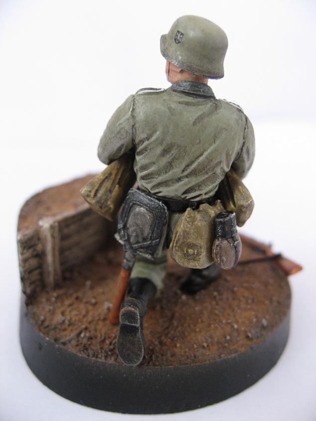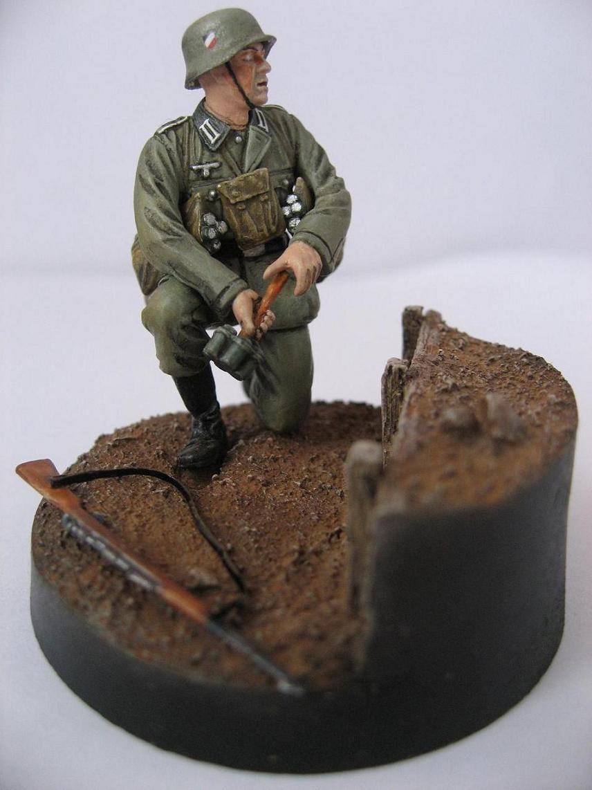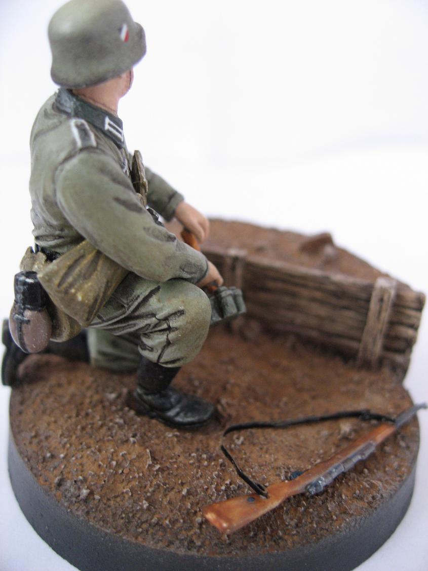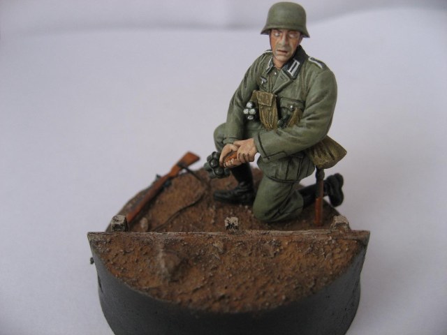 Говорят под конец войны солдатам вермахта какие-то амфетамины выдавали,могли трое суток воевать без передышки,правда потом появлялась жесткая депрессия и апатия,видимо этот солдат что-то такое и глотнул(как версия).А фигурка очень понравилась!