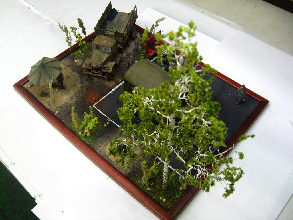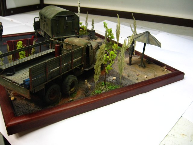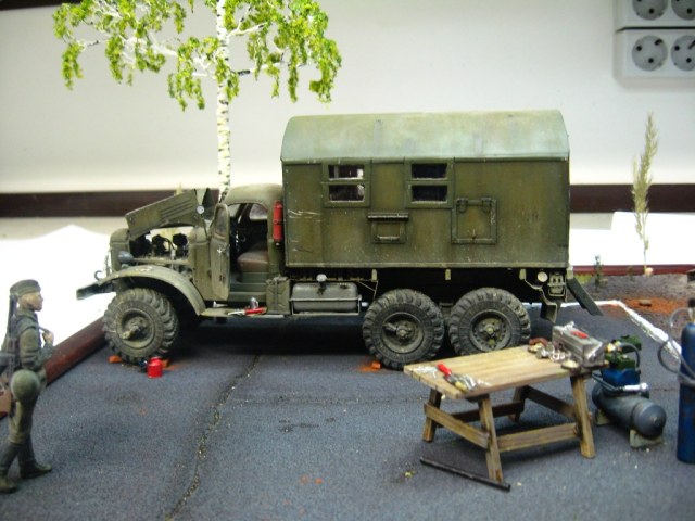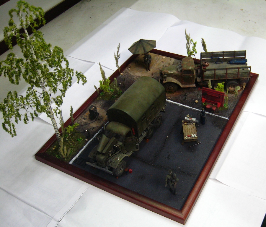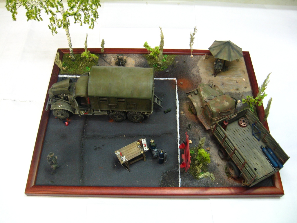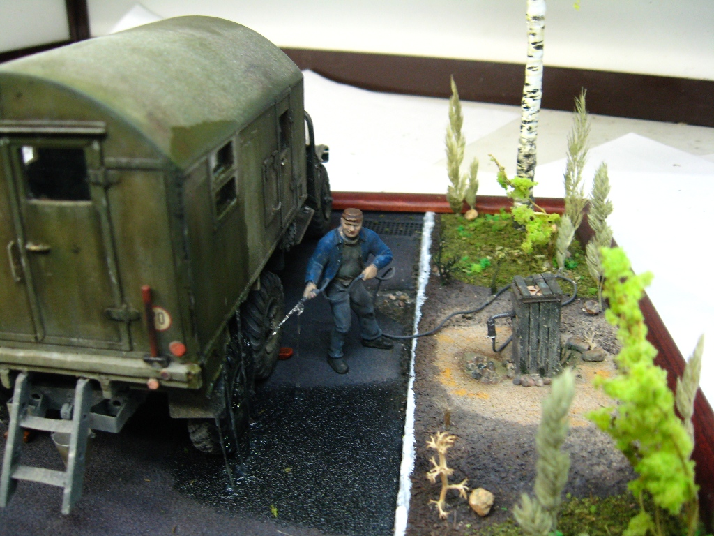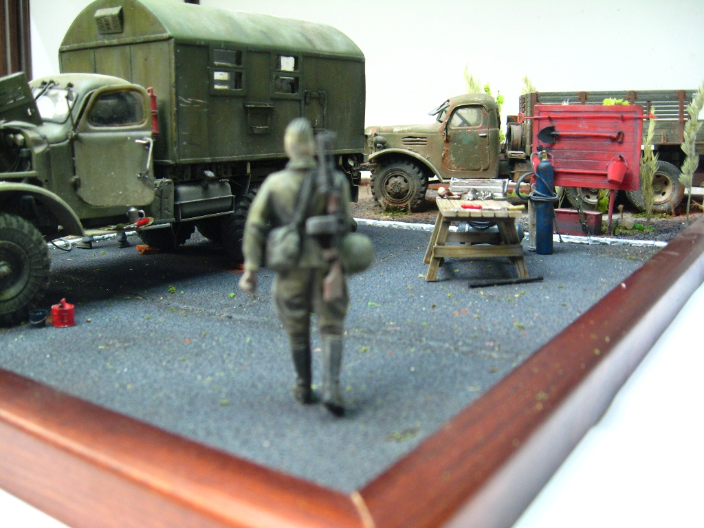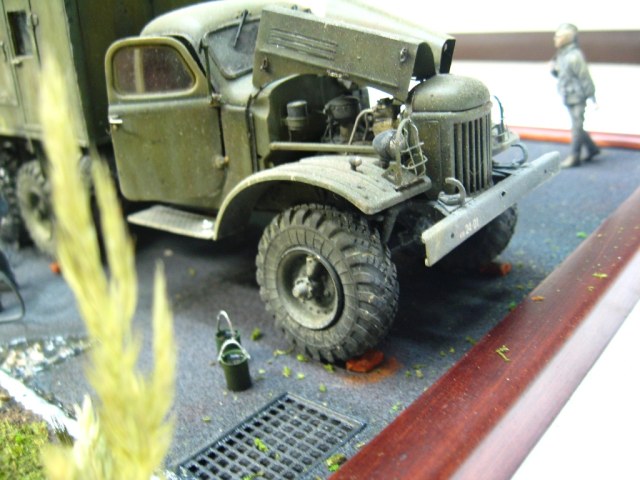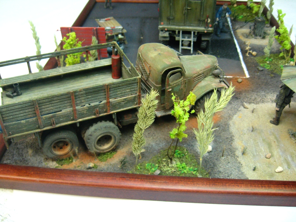 Конвертированный панцершоповским кунгом трамповский ЗиЛ-157. Перекоряженный звездовский ЗиС-151. Конвертанутая прейзеровская гражданская фигура. Две фигуры от капитана. Инструменты и рем оборудование -Верлинден. Красилось всем подряд. Превалирует в основном эмали тамия. Вода - гели валеджио. Пигменты- тамия и мастер пигмент. Растительность и материалы - масштаб