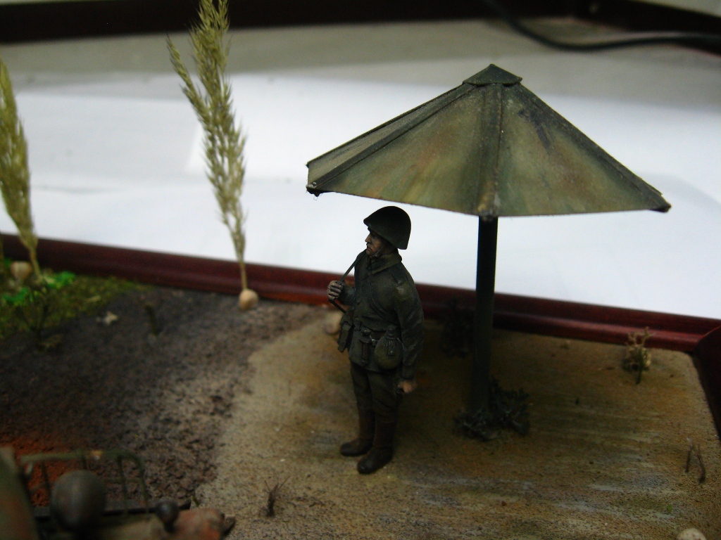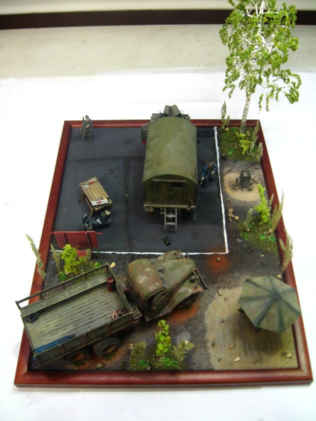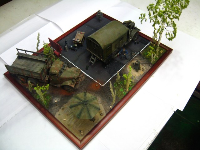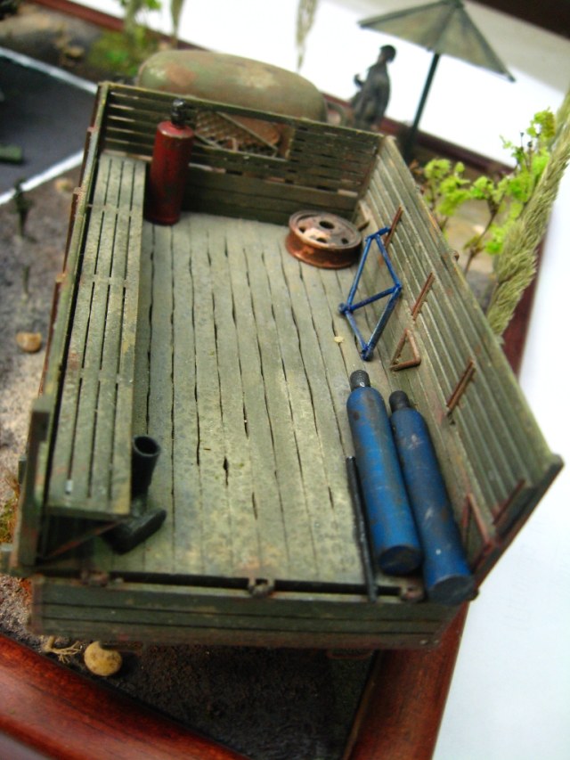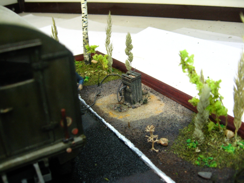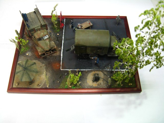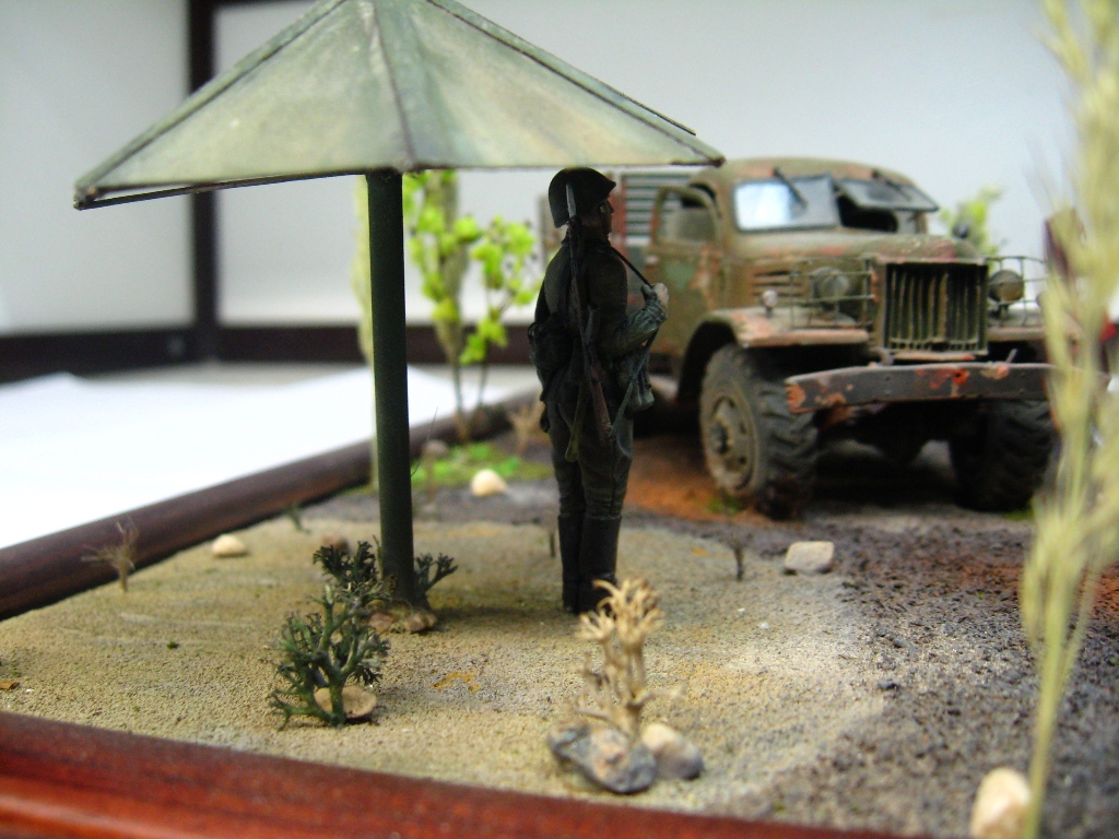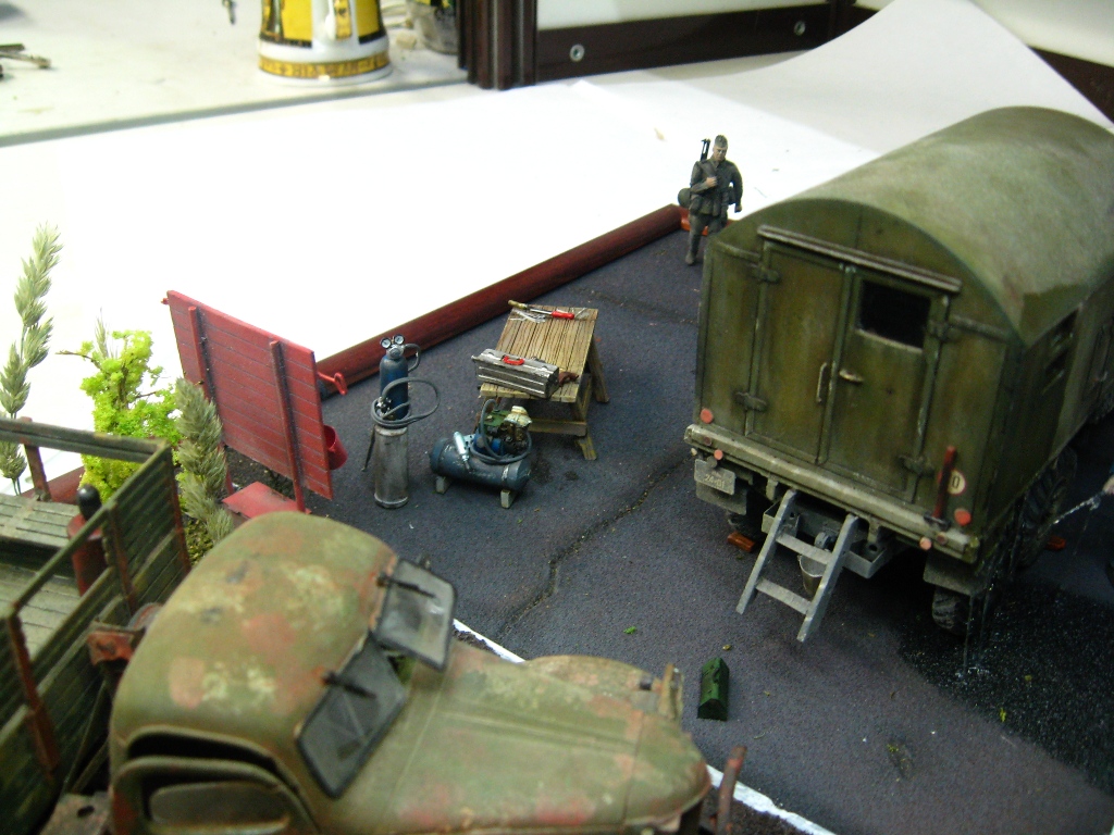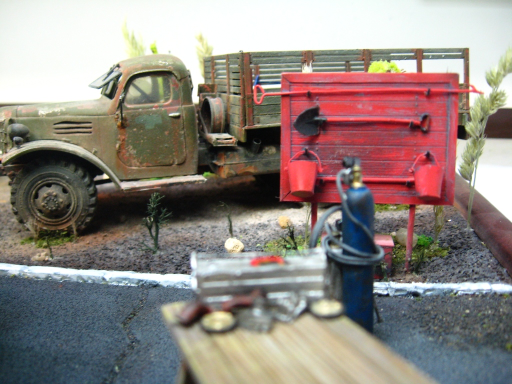 Конвертированный панцершоповским кунгом трамповский ЗиЛ-157. Перекоряженный звездовский ЗиС-151. Конвертанутая прейзеровская гражданская фигура. Две фигуры от капитана. Инструменты и рем оборудование -Верлинден. Красилось всем подряд. Превалирует в основном эмали тамия. Вода - гели валеджио. Пигменты- тамия и мастер пигмент. Растительность и материалы - масштаб