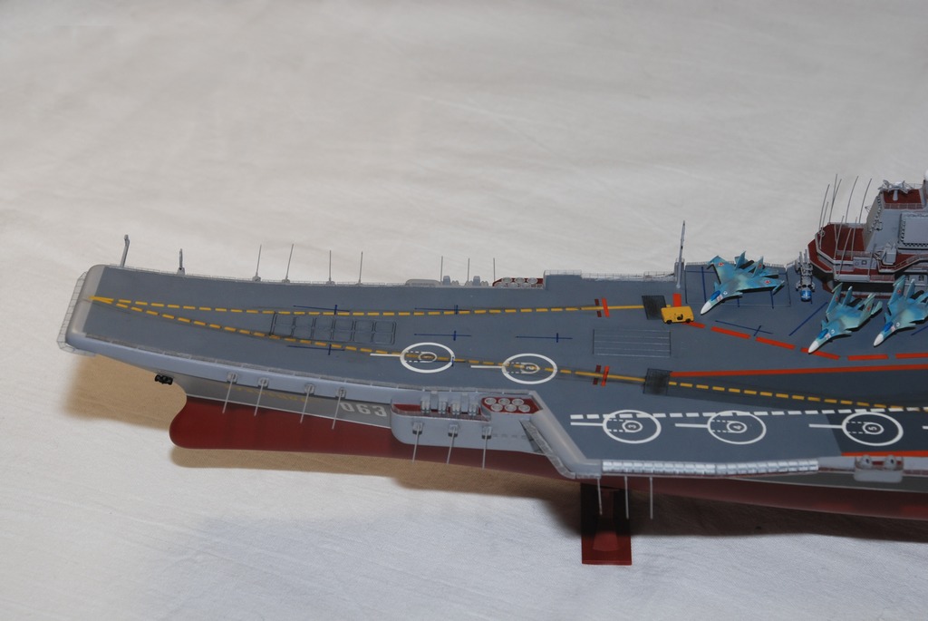 Это вторая моя модель, которую я собрал после длительного перерыва лет так в 15 в творчестве. Задумывалась она как легкая прогулка и отдых после сборки F/A-18E от Italeri, а получился долгий и нудный марафонский забег на 4 месяца – столько заняла работа по вечерам с кораблем и около 3-4 недель впоследствии – над авиагруппой. Были и перерывы в работе, вызванные семейными обстоятельствами, ремонтом, но в итоге корабль «вошел таки в строй». Представляю Вашему вниманию модель ТАВКР «Адмирал флота Советского союза Адмирал Кузнецов», Звезда, масштаб 1/720.