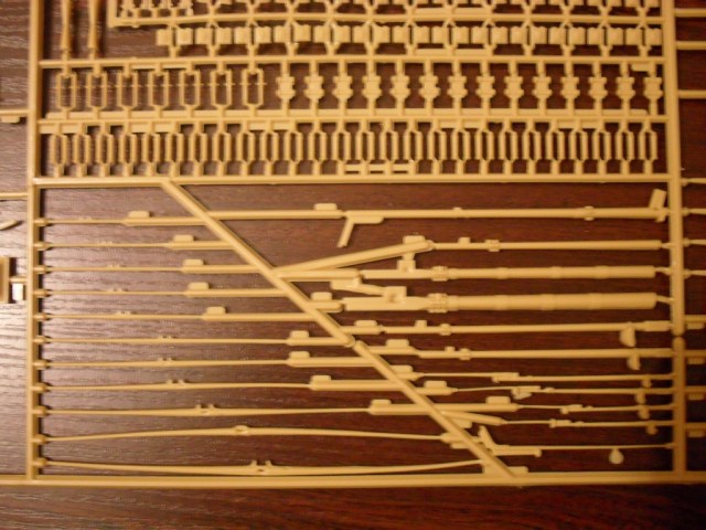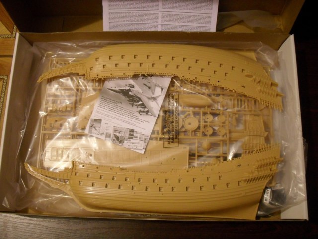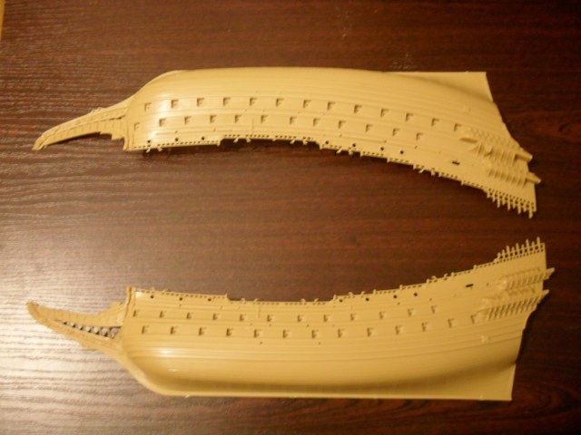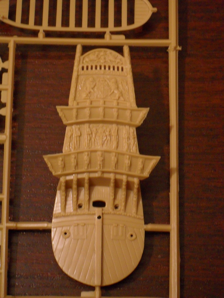 - Пластик цвета детской неожиданности, местами присутствует облой ( иногда в большом количестве). Половинки корпуса лежали отдельно. Две платы отливок : одна с палубой и мелочевкой другая с рангоутом и пушками. Пушки нижних ( закрытых деков) даны «гвоздиками», т.е. без лафетов, вставляется в пазы корпуса.