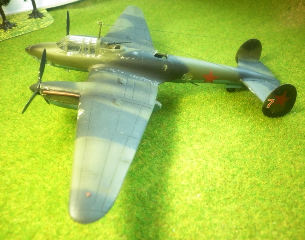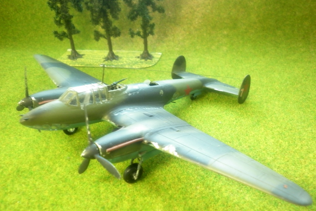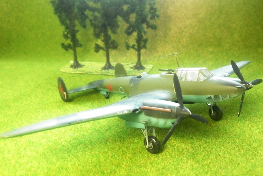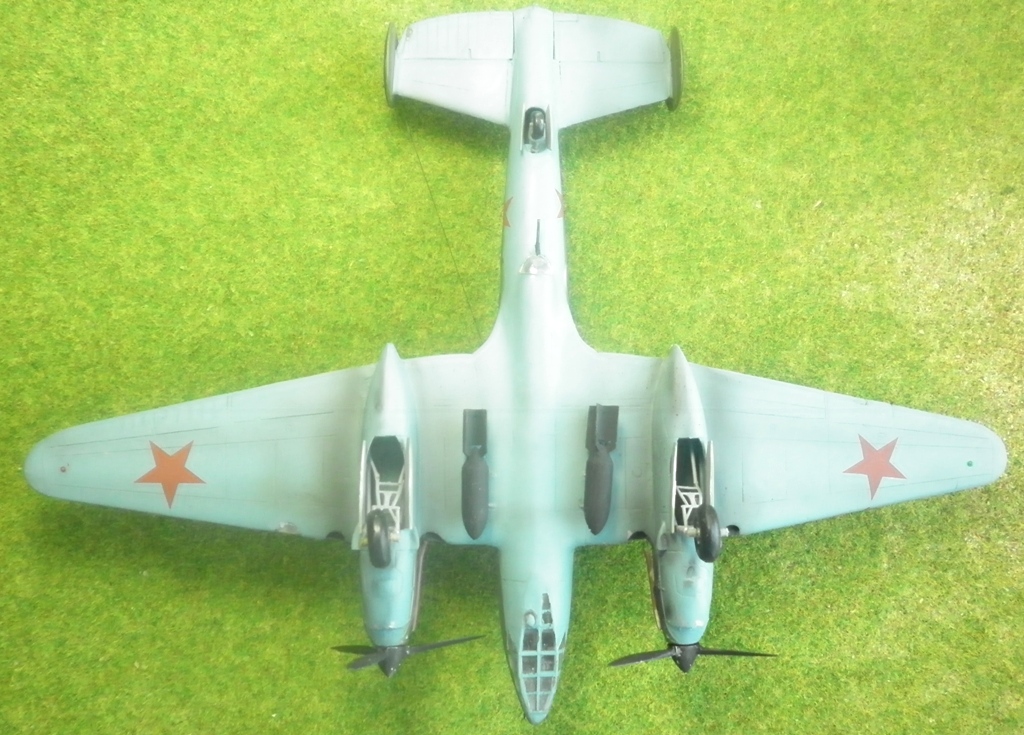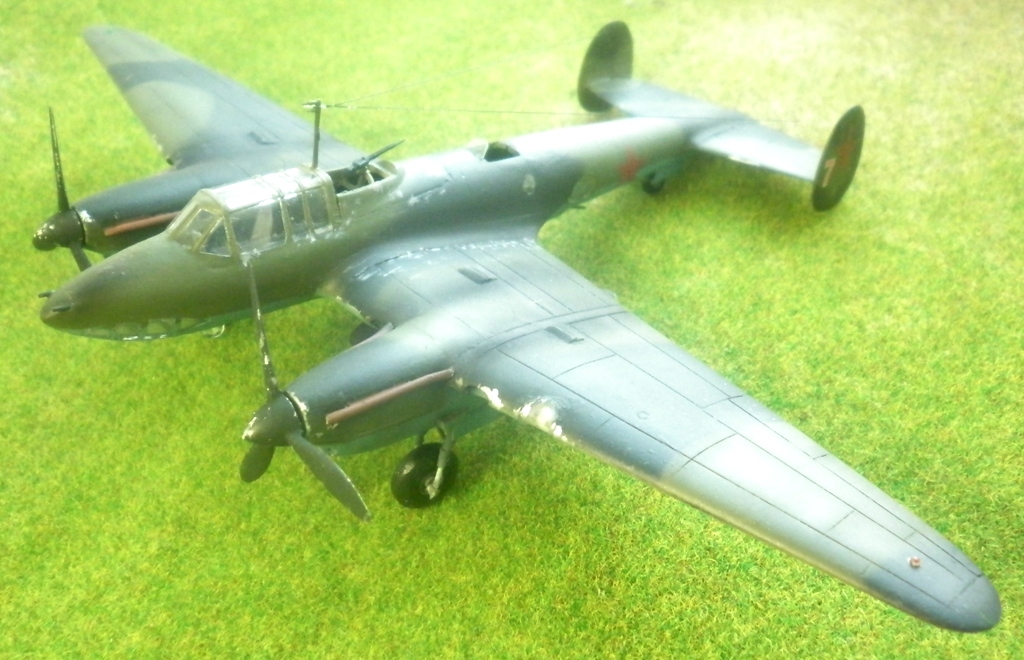 Собирая модель украинских производителей был приятно удивлен количеством неиспользованных деталей. И , посему, дабы добру не пропадать - решил воскресить Звездовское изделие с помощью этих деталей. Были использованы мотогандолы и остекление раннего варианта и декали от "Бегемота"- вариант без тормозных решеток. Экипаж - пилот И.Т. Ржевский ,штурман -Г.П. Бахвалов, стрелок-радист О.В. Тапханаев , сбивший не менее 2х немецких истребителей.