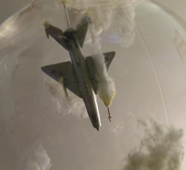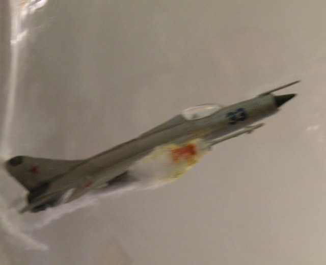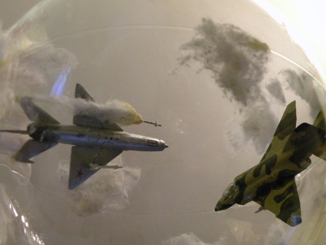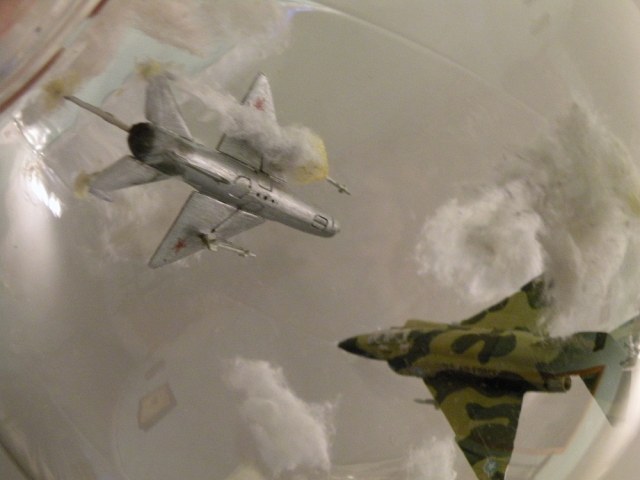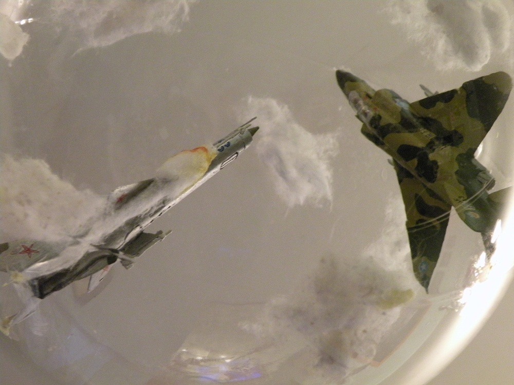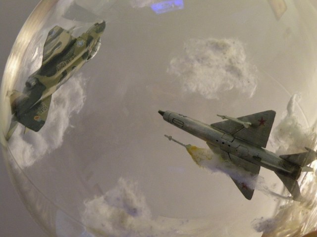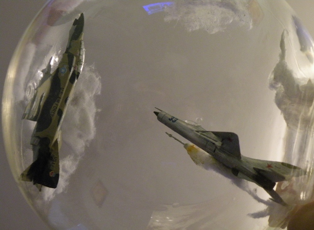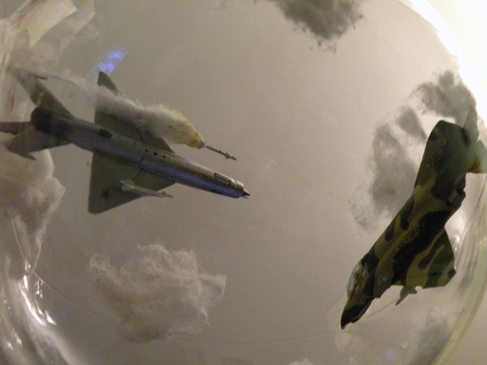 Задумка интересная. Но воплощение подкачало. Модели стоит задуть матовым лаком, а то на Фантоме разные цвета по-разному блестят. Да и где мог быть такой бой? На МиГе более логичными были бы вьетнамские ОЗ.