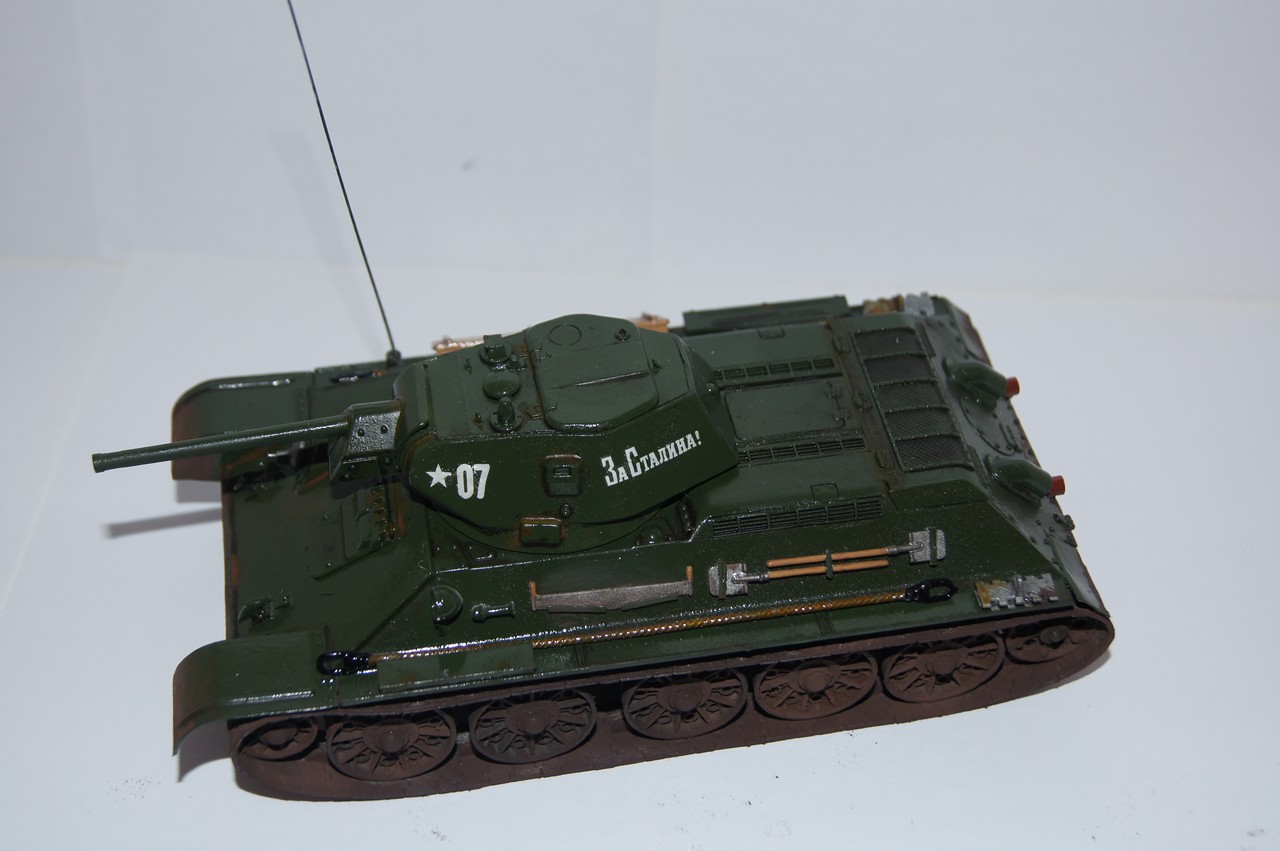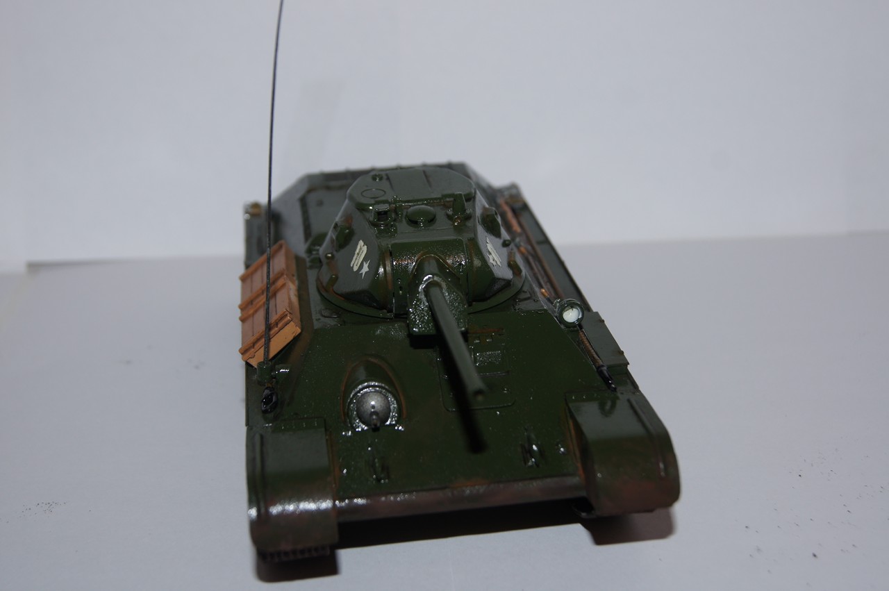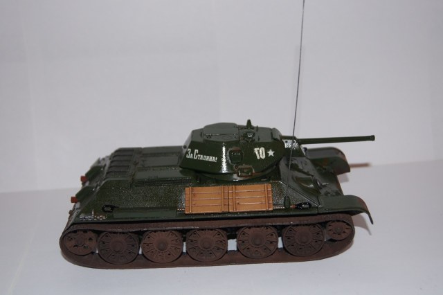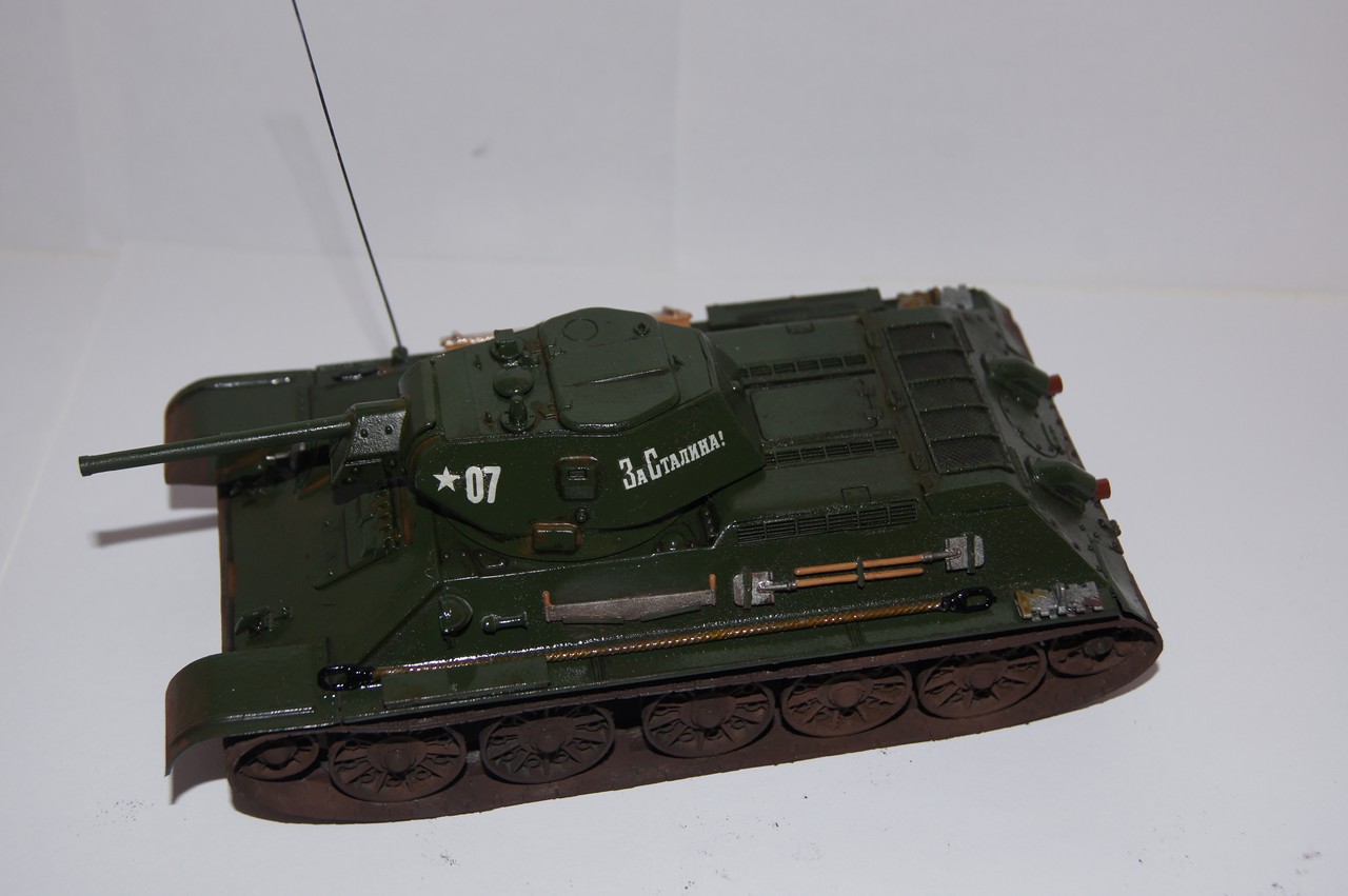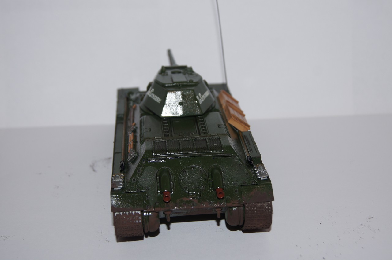 Итак,я вам уже говорил,что этот танк от Звезды не тот кит что бы соберать его из каробки.начнем по порядку:-Первое,что надо исправлять это уберать весь глянец,а то он у вас блестит,как пасхальное яйцо.Второе если вы делайте боевой танк,он должен быть в грязи и пыли,этот эффект достигается с помощью сухой кисти(обмакиваете кисть в краску небольшими движениями как бы вытераете ее об бумагу,а остатки краски наносите на модель.)получается эффект грязи.Третье виниловые гусеницы в помойку,есть бютжетный вариант наборных траков от Макета.Ну а заадно можно поменять и катки от того же Макета.Вот тогда ваша модель будет смотрется.примерно так: