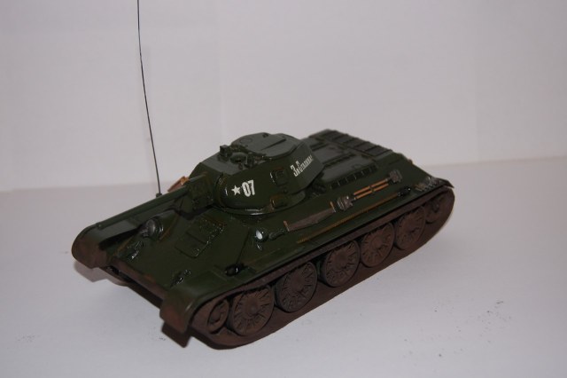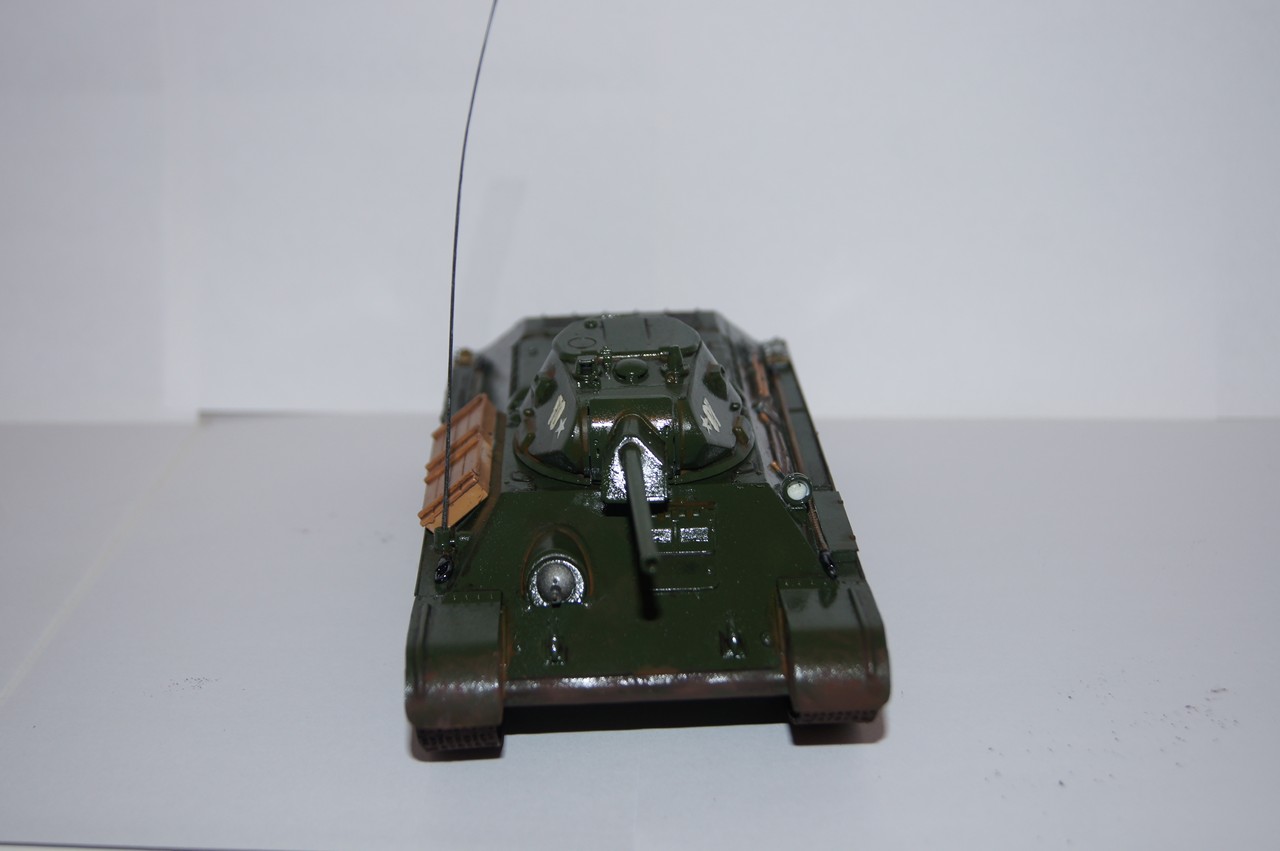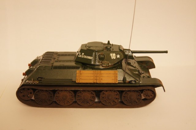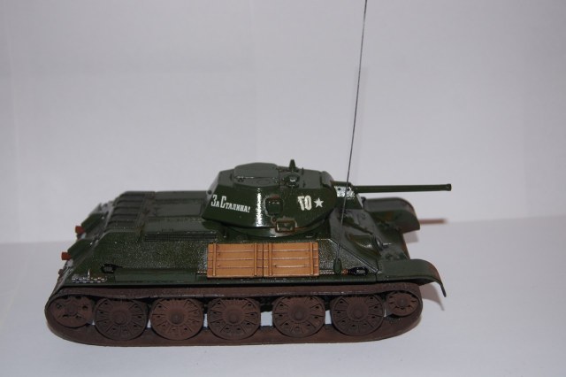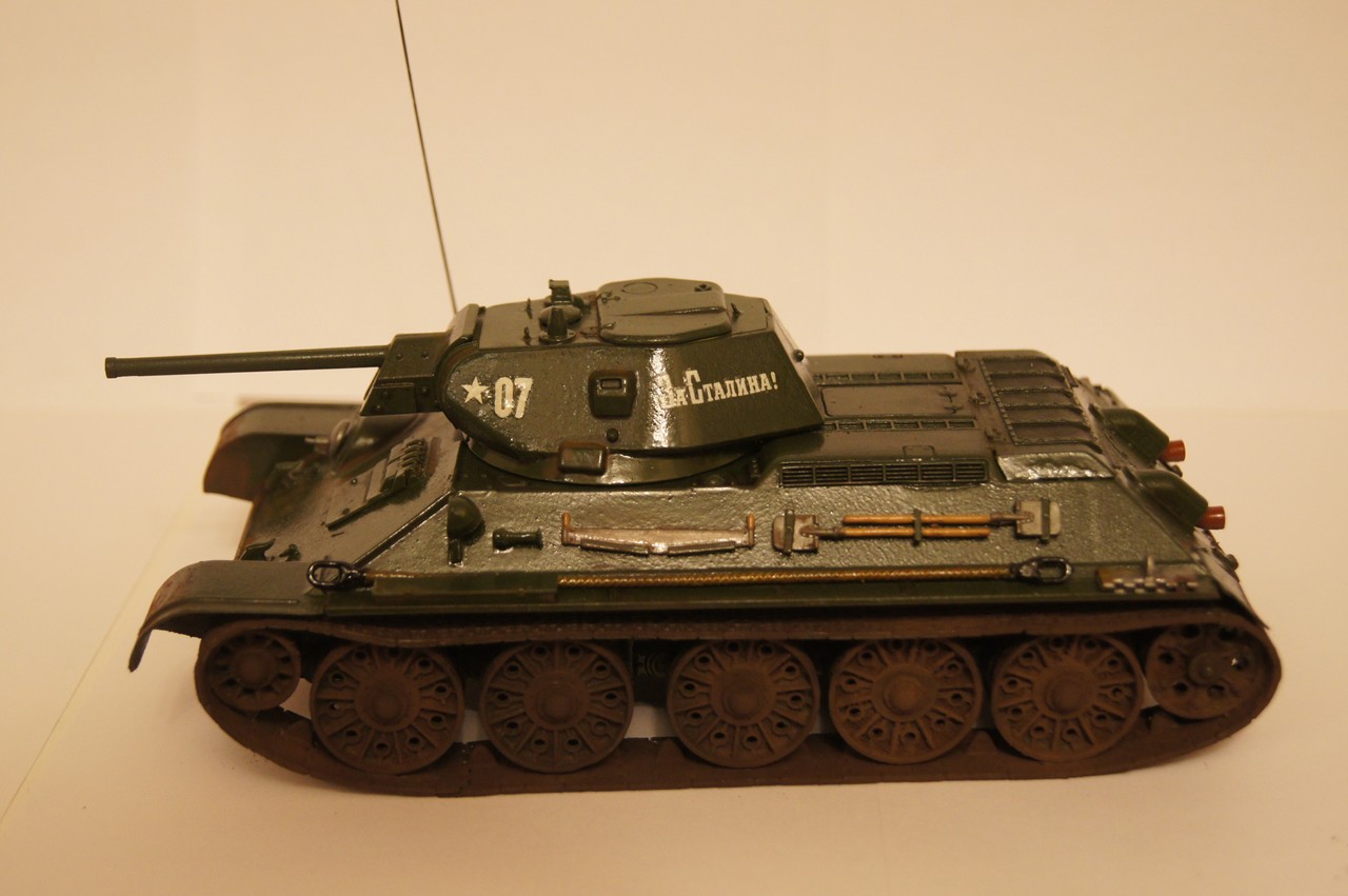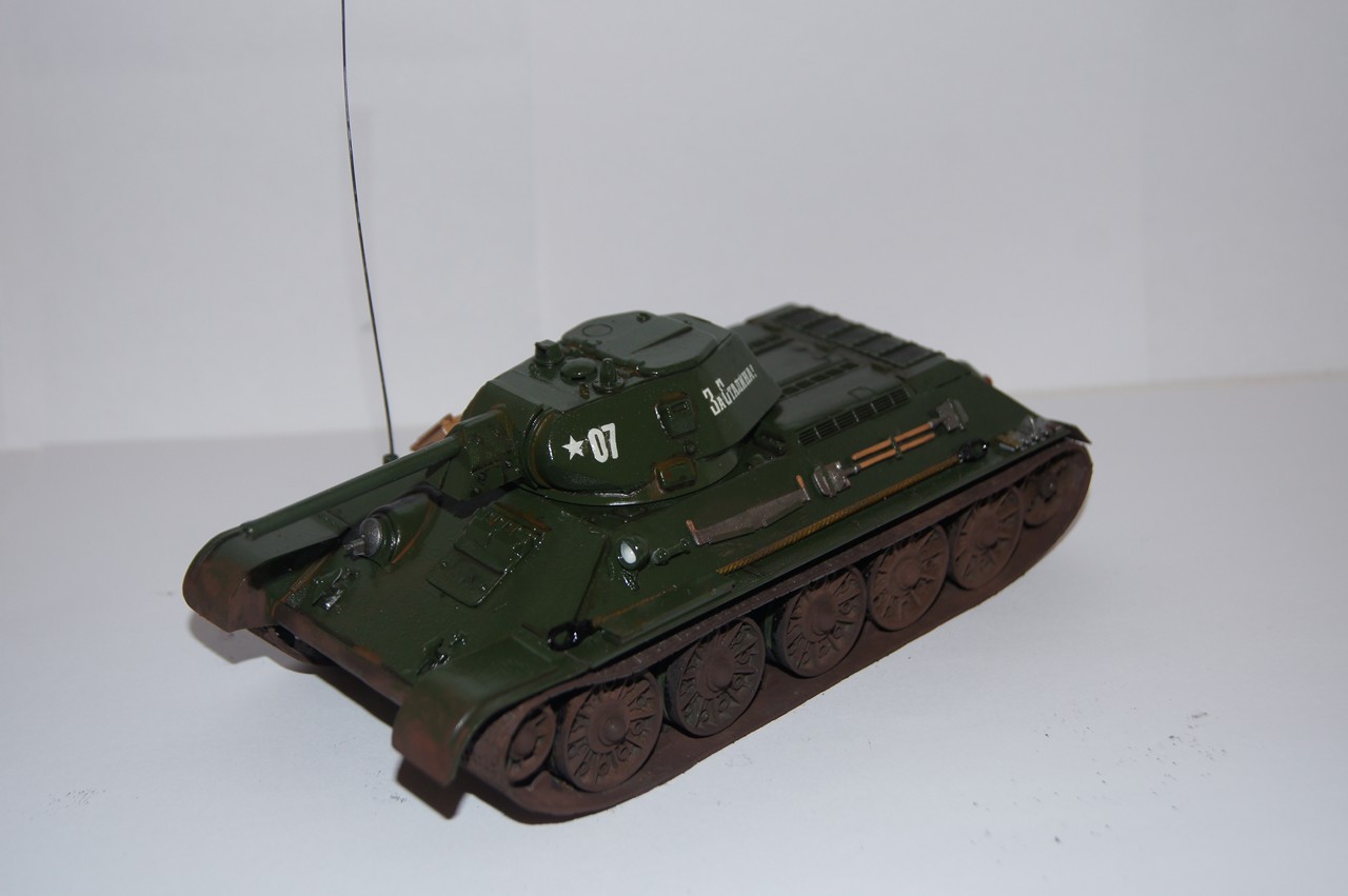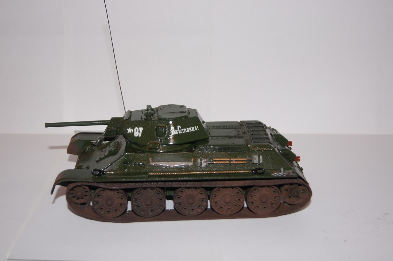 Итак,я вам уже говорил,что этот танк от Звезды не тот кит что бы соберать его из каробки.начнем по порядку:-Первое,что надо исправлять это уберать весь глянец,а то он у вас блестит,как пасхальное яйцо.Второе если вы делайте боевой танк,он должен быть в грязи и пыли,этот эффект достигается с помощью сухой кисти(обмакиваете кисть в краску небольшими движениями как бы вытераете ее об бумагу,а остатки краски наносите на модель.)получается эффект грязи.Третье виниловые гусеницы в помойку,есть бютжетный вариант наборных траков от Макета.Ну а заадно можно поменять и катки от того же Макета.Вот тогда ваша модель будет смотрется.примерно так: