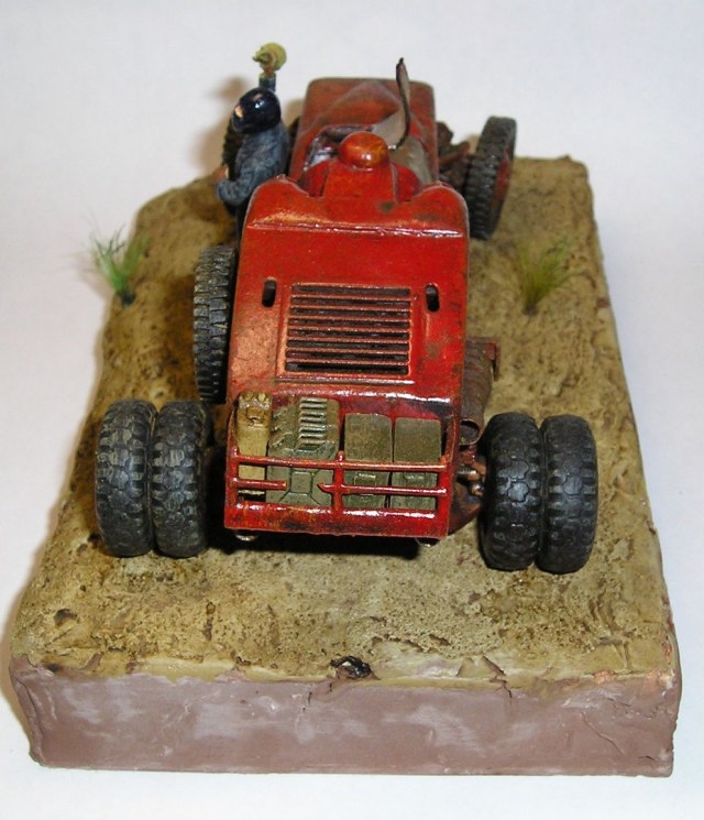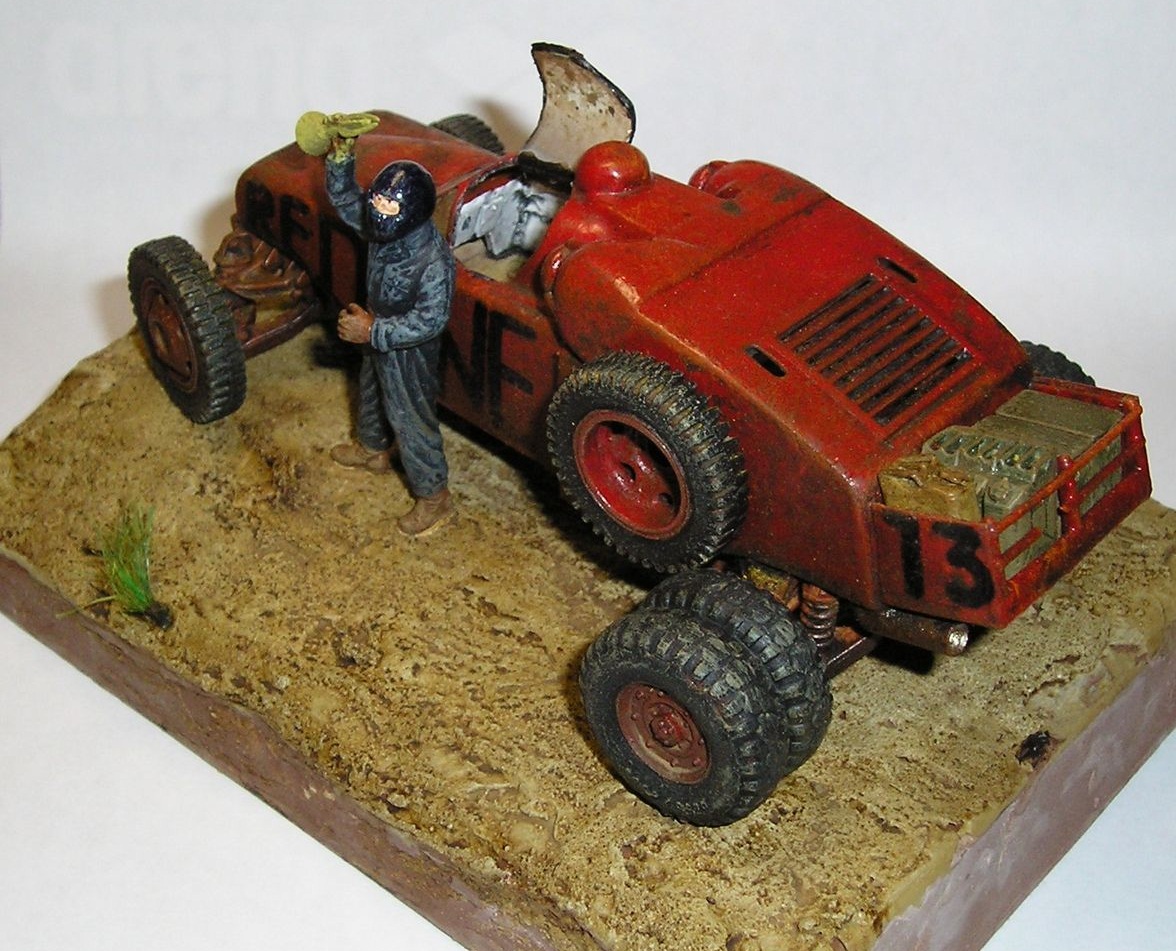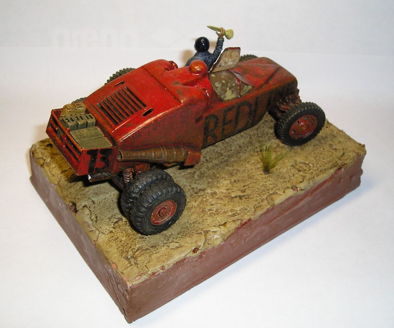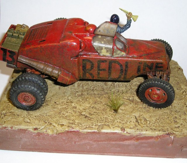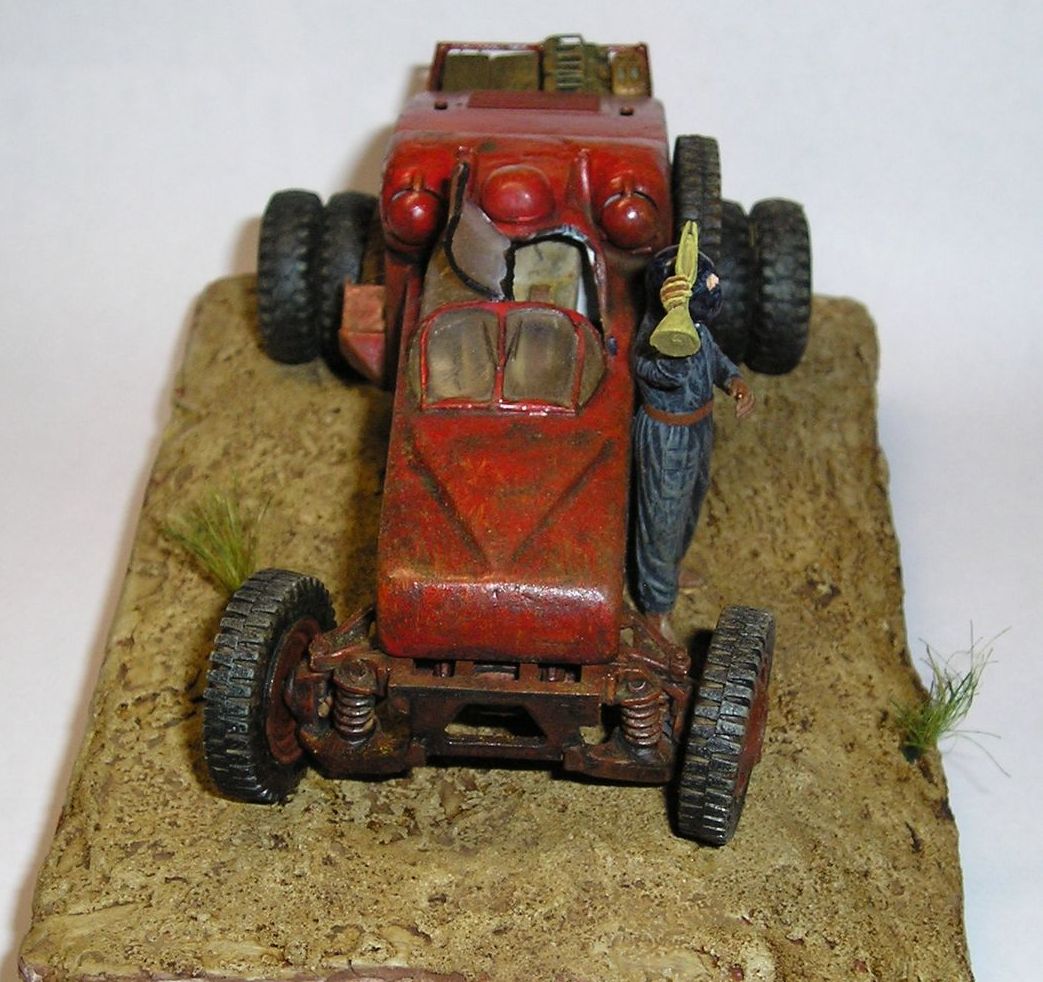Под впечатлением от мультфильма redline решил собрать футуристическую гоночную машину. Ходовая и задние колеса - от звездовского хаммера, передние колеса и запаска - от ЗиС 151, кабина - звездовский Ка-52, корпус из листового пластика. Фигурка - перепиленный танкист от ICM. Красил звездовским акрилом, корпус - глянцевой тамией. Брызги - масляная краска на уайт-спирите в несколько слоев.