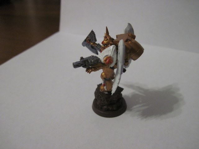 Плохо красите. Попробуйте сразу золотым не покрывать , раскрасить в оттенки красного-жёлтого-коричневого в затемнениями высветлениями, НММ в помощь. Только потом тончайшим слоем золота, и упаси Император, такое чувство как будто оно звездовское. Вобщем вам работать и работать