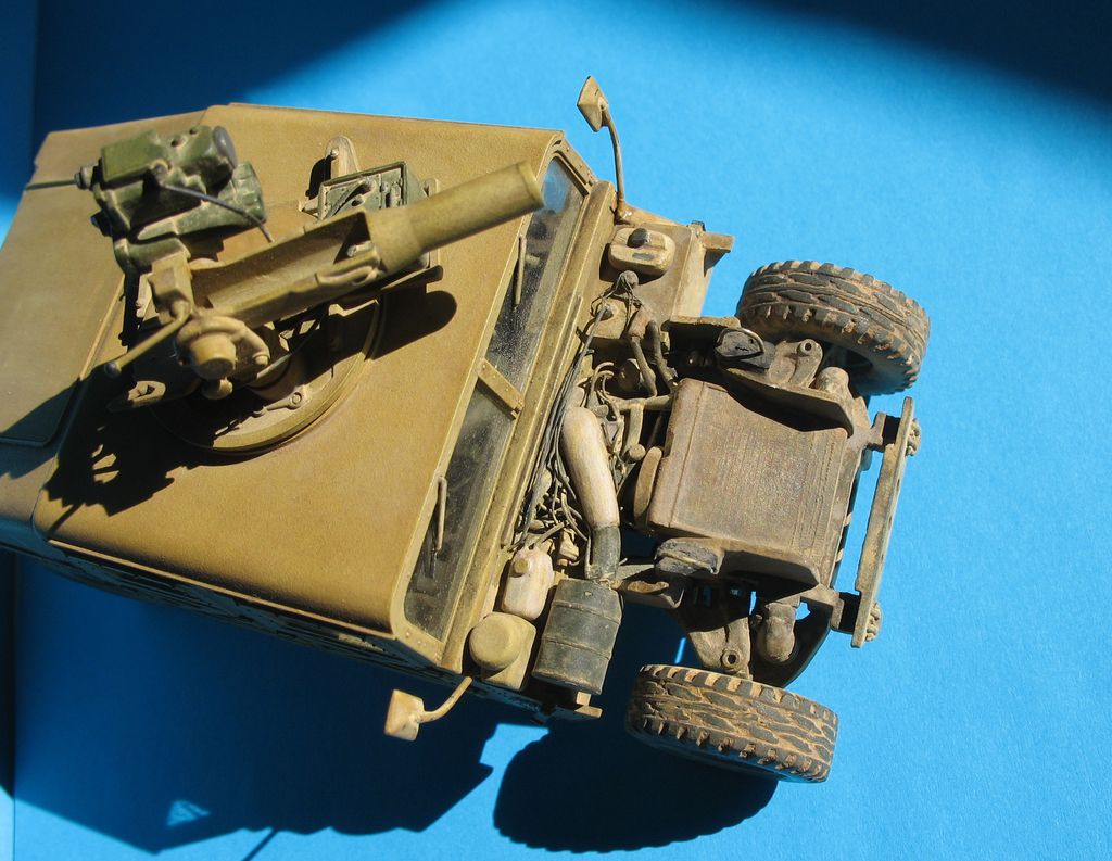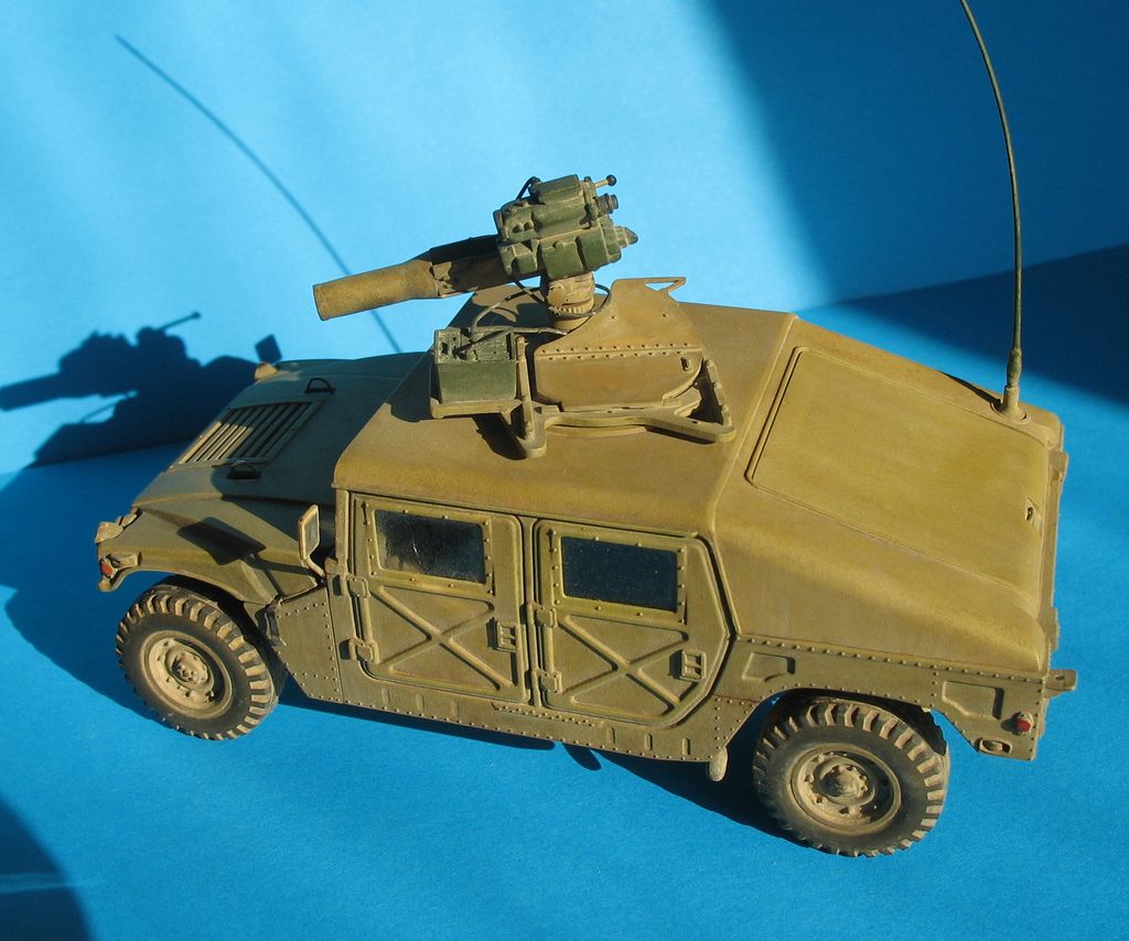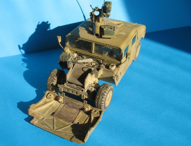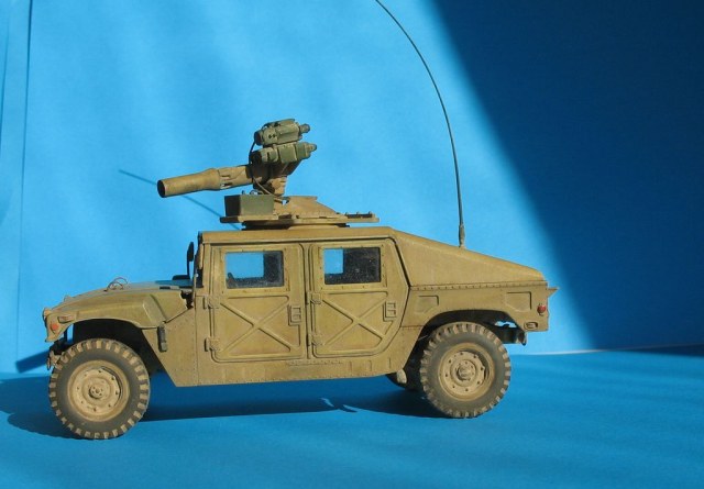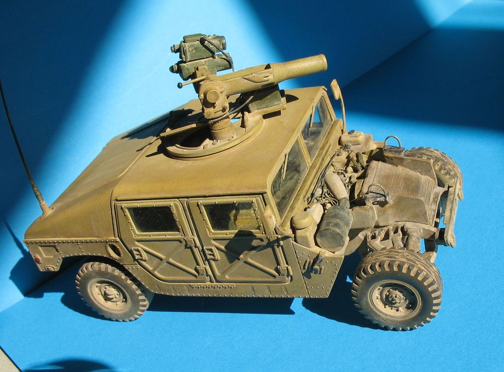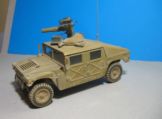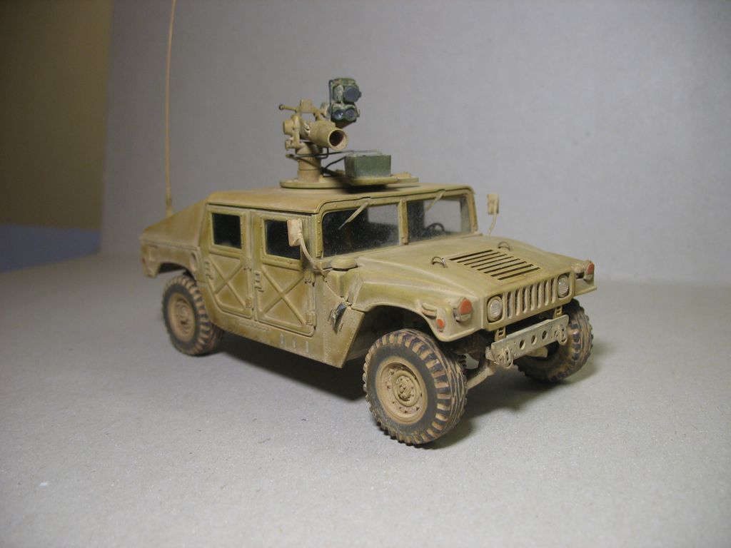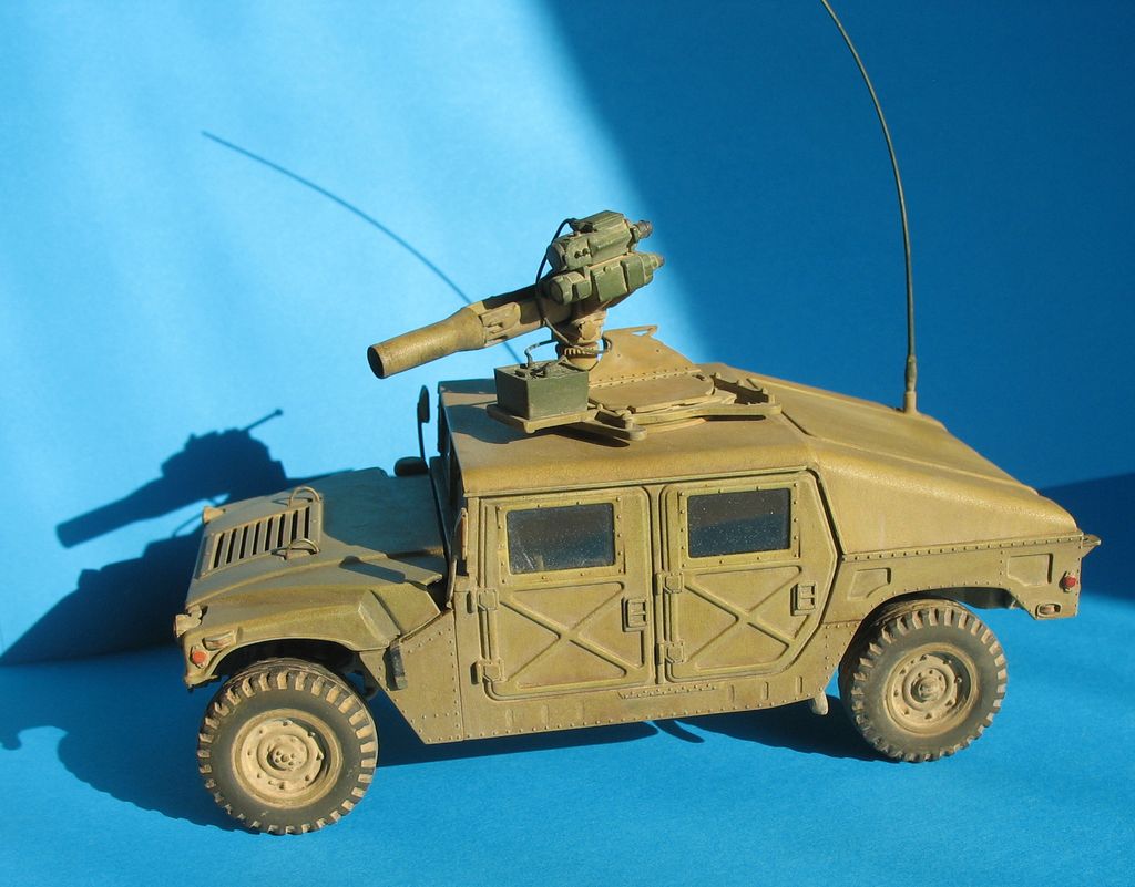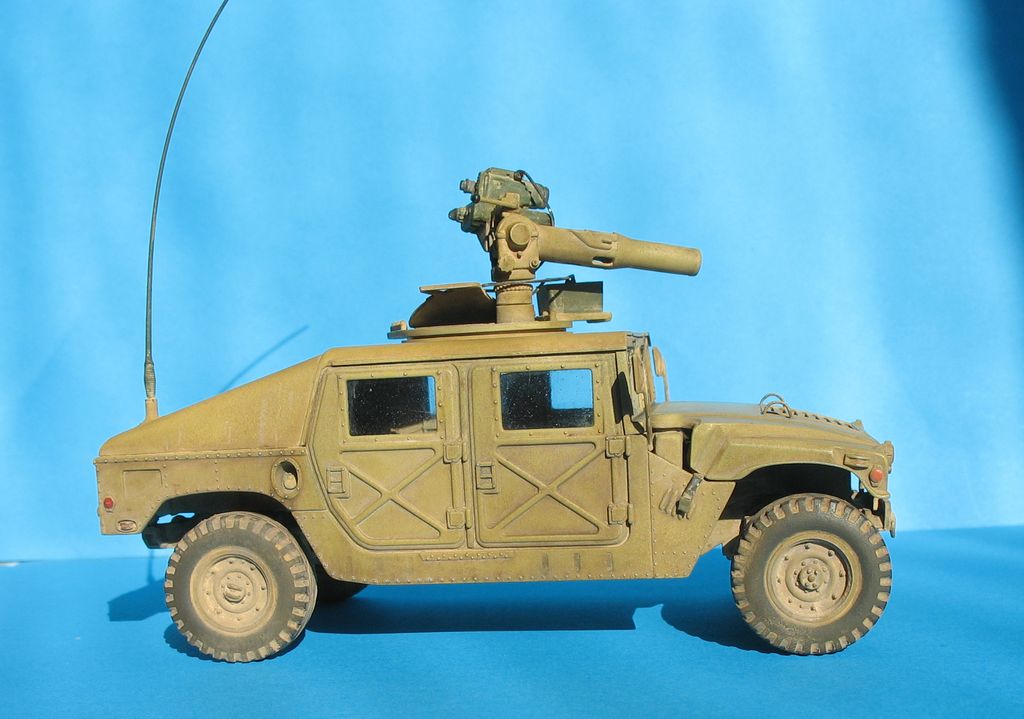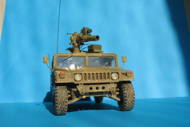 Модель от "Академии" всем известна, собиралась из (коробки) с небольшими, доработками: дворники из расплющенной проволоки,проводка к TOW, движок с нуля, штучки из капота торчат из проволоки,антенна тянутый литник,стекла из прозр.упаковки,стекла в приборе то же из нее, на зеркалах наклеена фольга,пружины из проволоки.