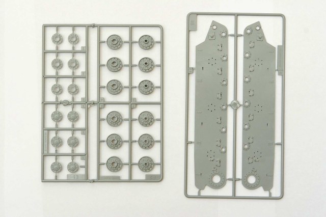 - Катки, как и должно быть, без ребер жесткости (как у звездовских дров) и с 6 отверстиями на диске. Справедливости ради нужно отметить, что катки, в отличие от некоторых других китов Трумпетера, просто идеальны. Единственное, что надо с ними сделать – пройтись сверлом соответствующего диаметра по отверстиям облегчения, чтобы убрать предательски залившийся туда пластик.