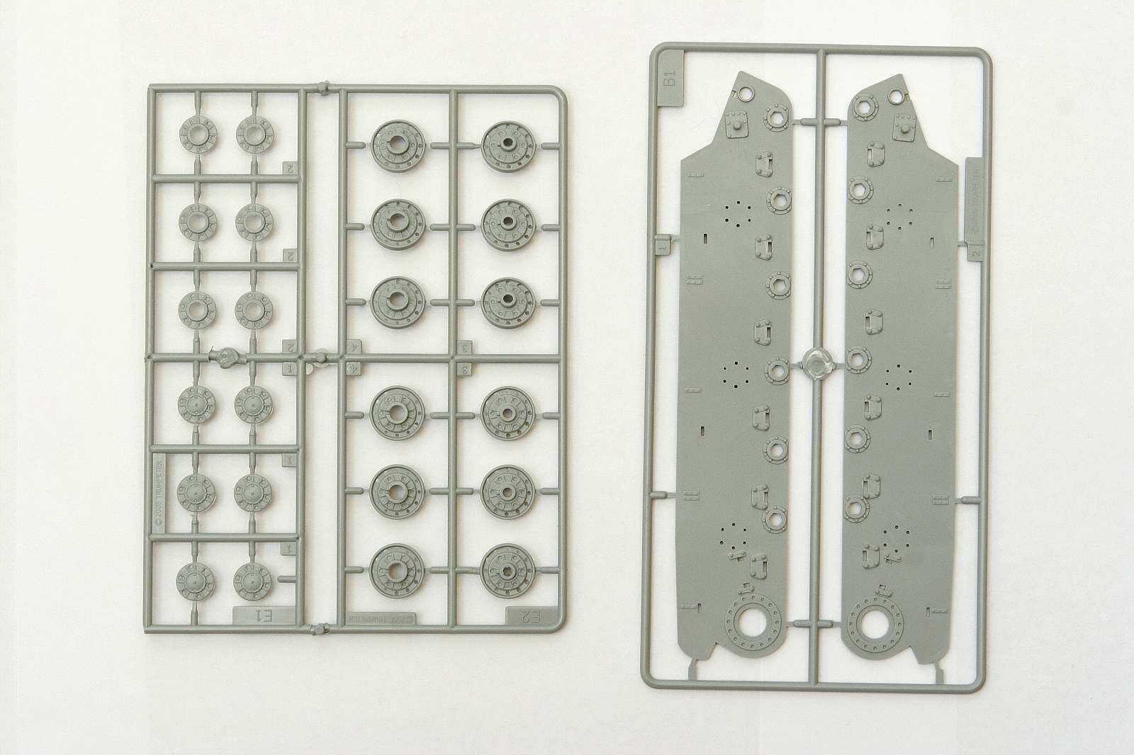 Тут – всё как всегда. Тот же серый мягкий пластик, что мы уже видели на «обычном» («советской конфигурации») КВ-2, то же достаточно неплохое качество литья. Однако (как и на всех других отливках Трумпетера) присутствует смещение половинок пресс-форм – весьма некритичное, но повозиться с модельным ножом в руках придётся. Особенно вязкой и нудной эта работа будет при обработке балансиров и опорных катков – т.к. там литьевой шов и смещение половинок находятся на самом видном (на готовой модели) месте. Лично у меня ушла почти неделя «медитативного» труда для приведения ходовой части в порядок. В остальном – ничего удивительного и необычного – свойственное Трумпетеру очень качественное, но не хватающее звёзд с неба литье.