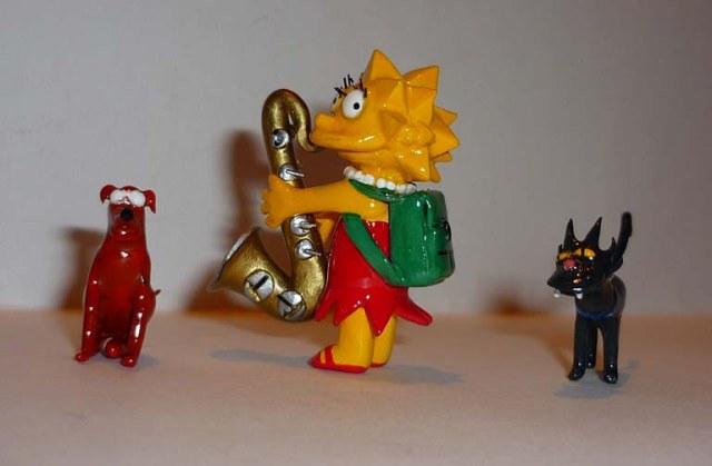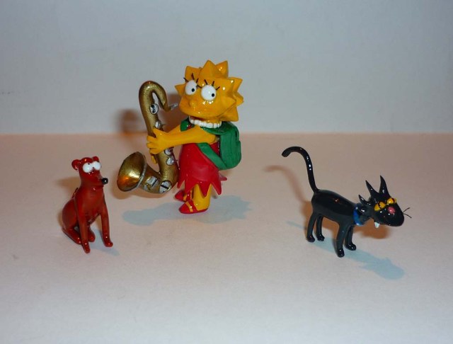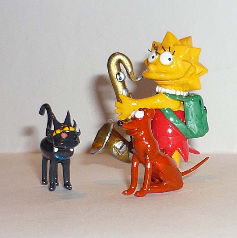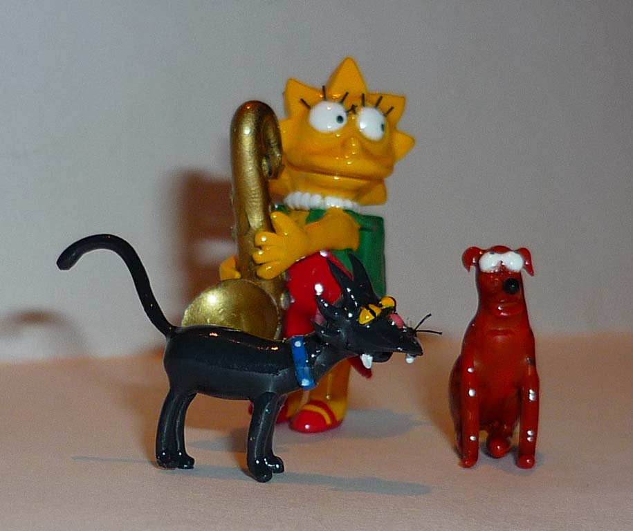 На этот раз это Лиза Симпсон с домашними животными - Маленьким помощником Санты (собачка) и Снежоком II (кот, соответственно).