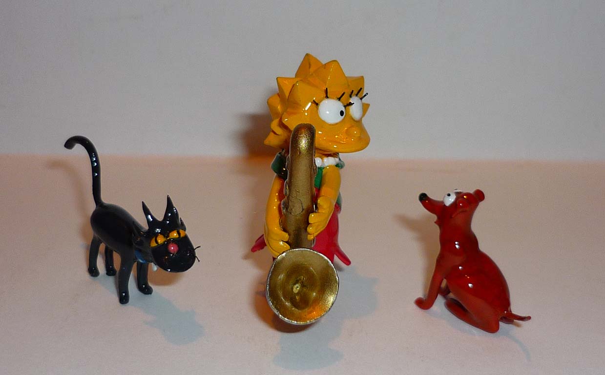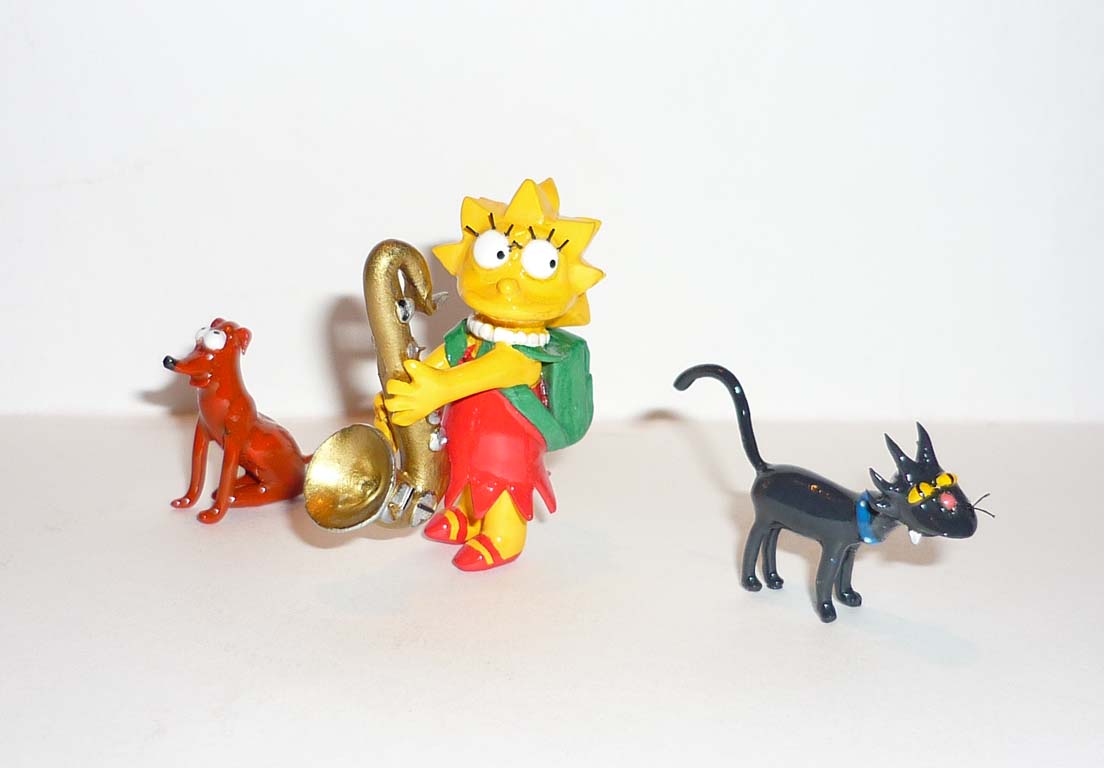 Питомцы хороши, но вот Лиза больше похожа на "опытный образец" из ранних версий Симпсонов. Небольшая придирка по матчасти - кот с шарфом- это Снежок Пятый, который из "политических" соображений был назван Снежком Вторым. Тогда и цвет шарфа должен быть бордовым...