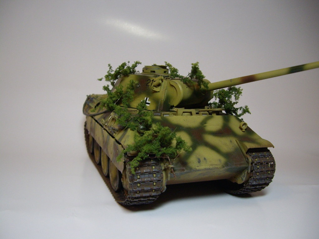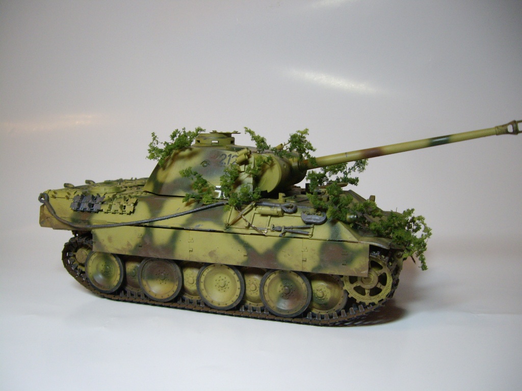 Коллеги, представляю последнюю работу, ICM-овская пантера. Период,в районе событий на курской дуге. Камуфляж выбрал из книги \"Пантеры на курской дуге\". Без привязки к конкретной машине, так сказать собирательный образ. В принципе из коробки, добавлен \"лес на броне\" Комментарии приветствуются.