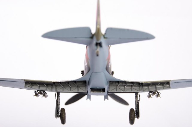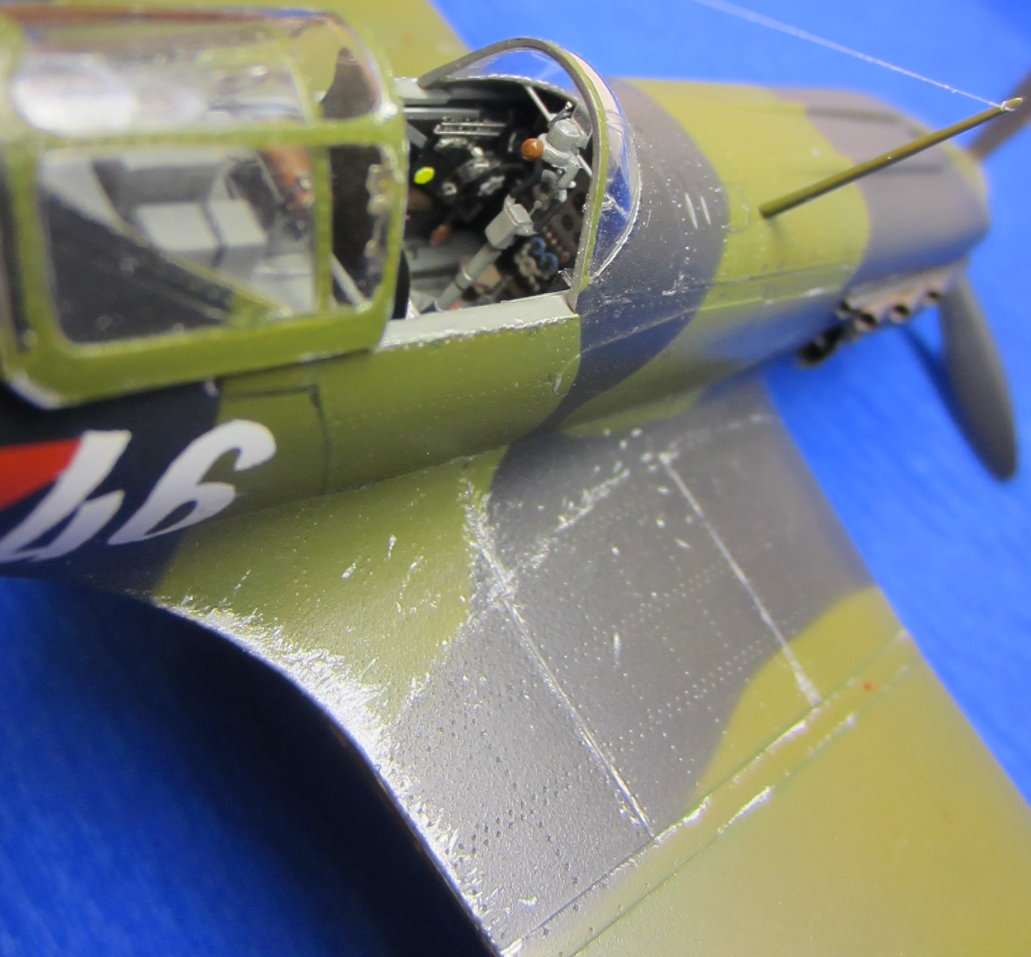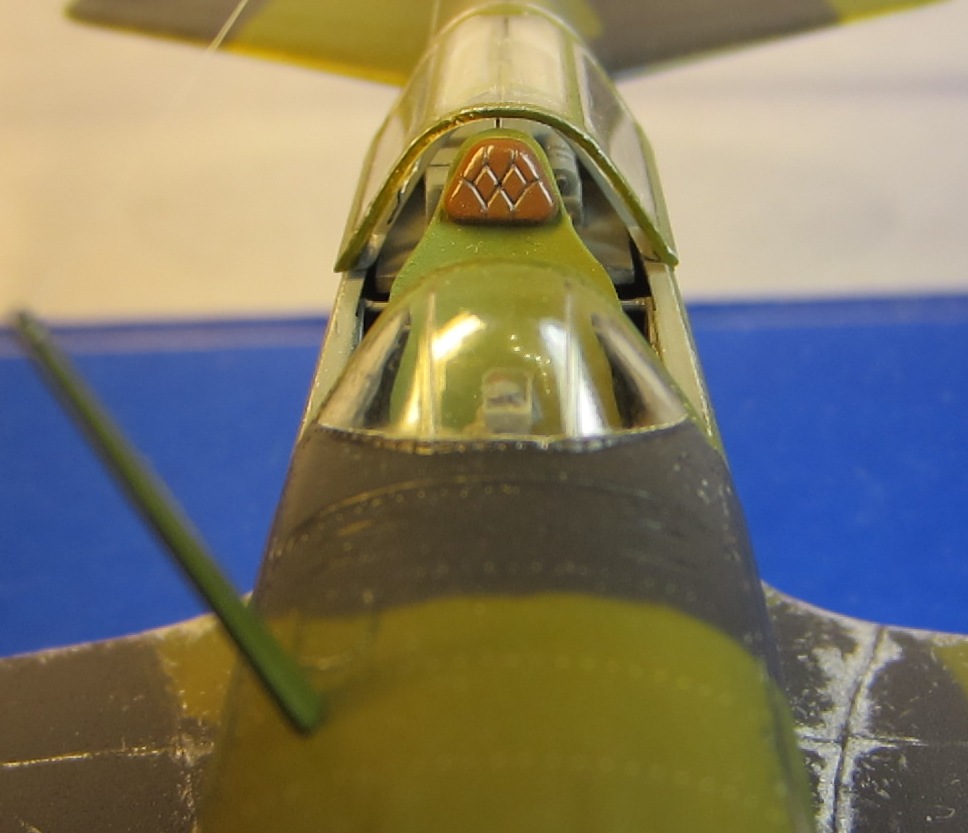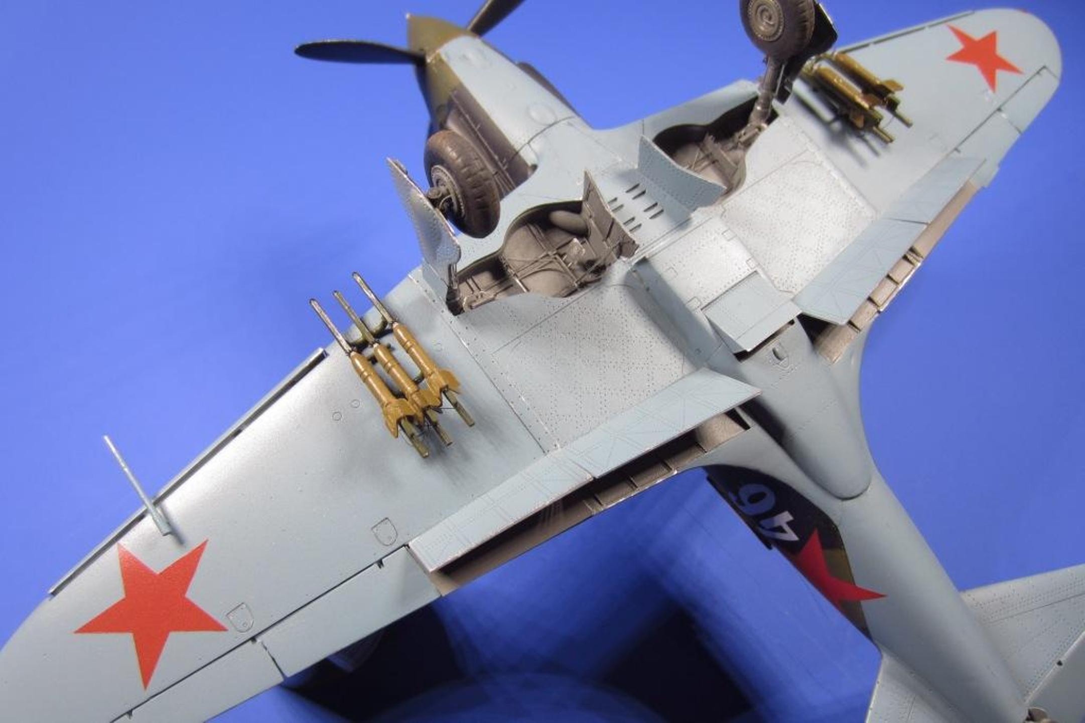 Стачивал до приемлемой толщины щитки шасси и воздухозаборники, чтобы смотрелись более масштабно. Срезал и сделал заново из тонкого листа алюминия обтекатель выхлопных патрубков, так же сделал из того же листа бронеспинку кресла пилота. Срезал «родные» отклоняемые поверхности и заменил на «НеОМЕГА». Прицел так же был немного доработан: срезал стекло прицела и заменил его тонкой прозрачной пленкой и сделал крепление к бортам фюзеляжа из литника. Пламегасители пулеметов – иглы от шприцов. Тормозные шланги, гидроцилиндр выпуска-уборки шасси, указатели положения шасси («солдатики») из тянутого литника. Направляющие РСов спаяны из проволоки. Проводка радиостанции – тонкая проволока. Стойка антенны выточена из зубочистки. Нить антенны сделал из зубной нити расщепленной до нужной толщины.