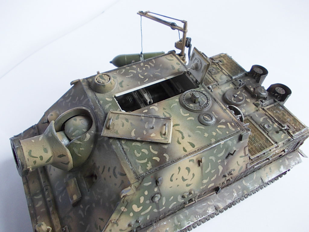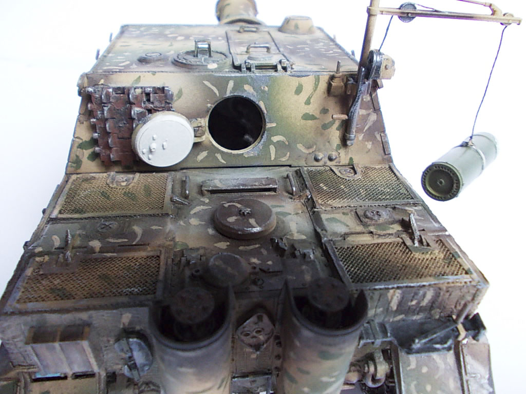по покраске: запятые нанесены были только на горизонтальные поверхности, если соотнести масштаб ваши запятые немцы шваброй наносили (но некоторые вполне масштабны, хотя на прототипе все запятые примерно одинаковые, или вы думаете немец, который их наносил, кисти менял, прям пикассо))), вся покраска оставляет двоякое впечатление, если ходовая покрашена на отлично, то в некоторых местах просто безобразно-подтёки на бортах рубки, передний бронелист без намёка на везеринг и т.п., по циммериту сами знаете)), про люки изнутри тоже подсказали