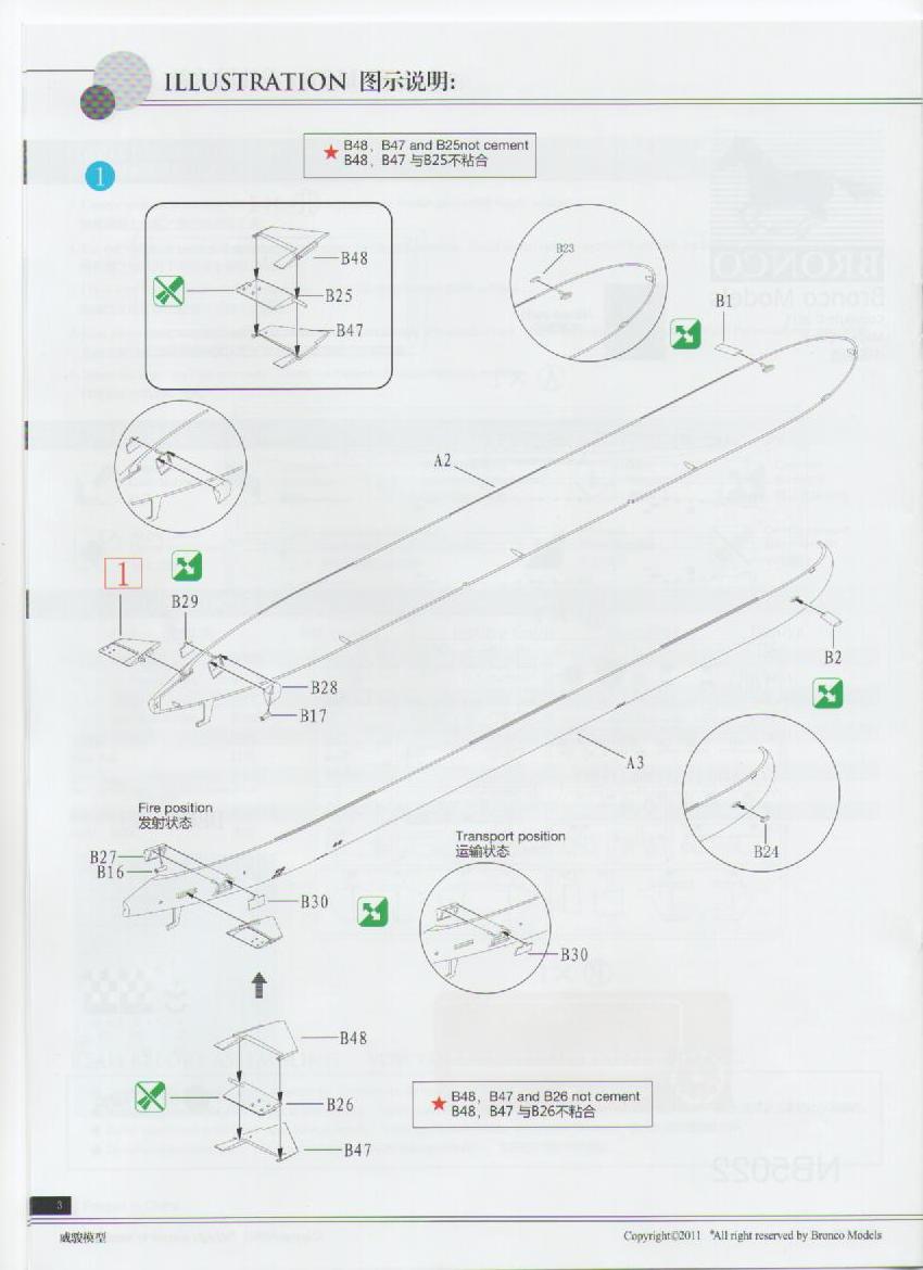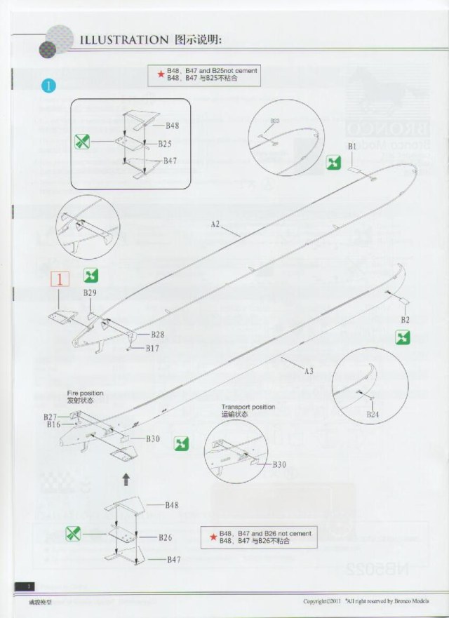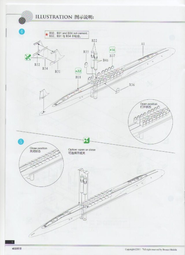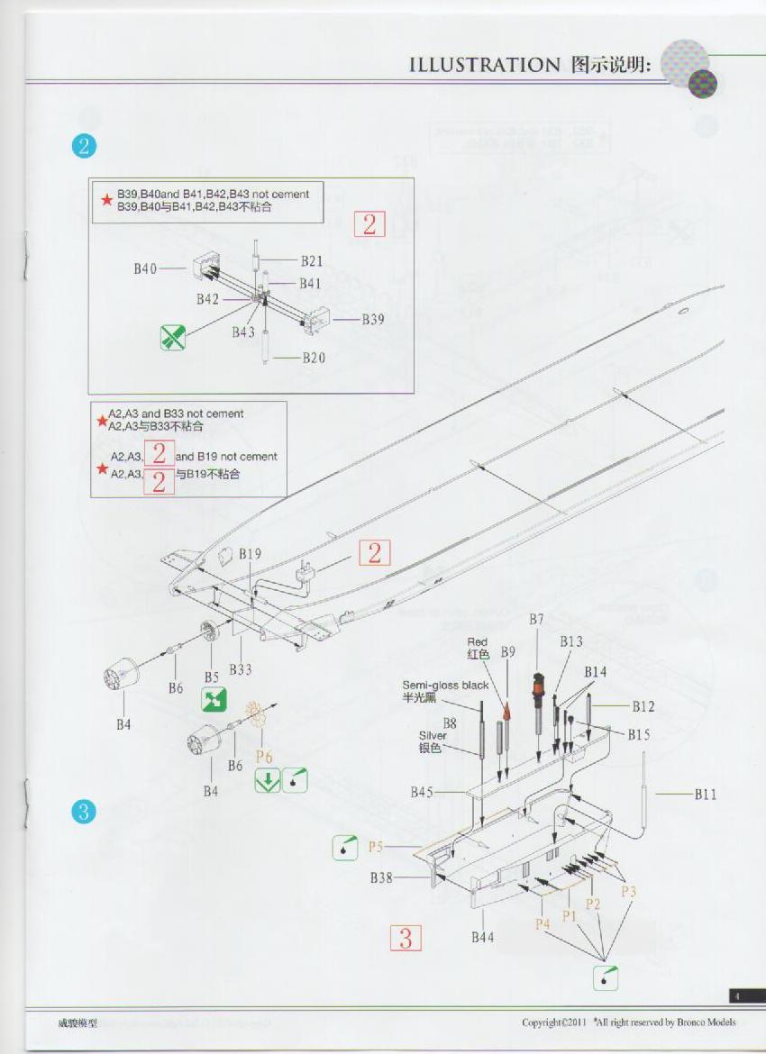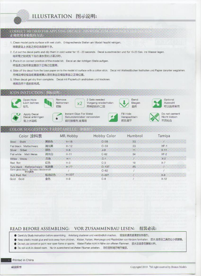 Инструкция дана в цвете и на ненаших языках: английском и китайском, что ни как не отразится на качестве сборки, т.к. картинки с интернациональными цифрами понятны всем. Инструкция по покрасе повторяет момент торжественного спуска лодки на воду.