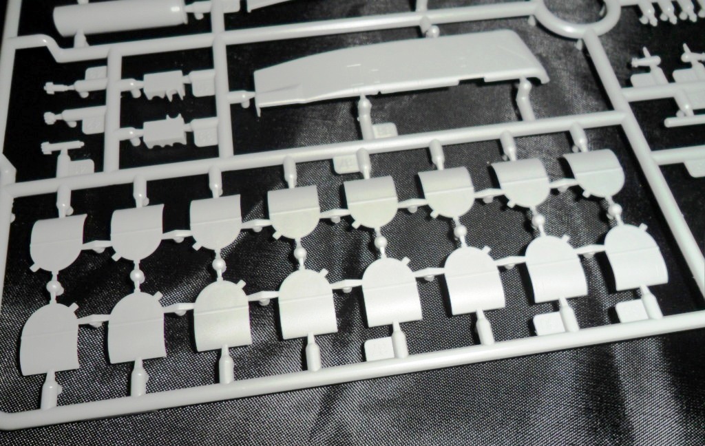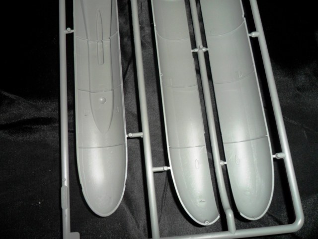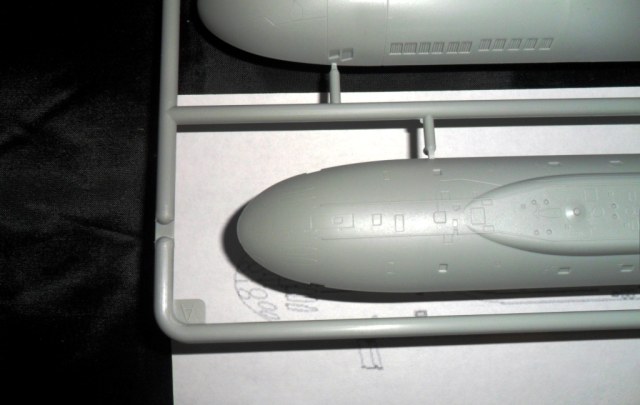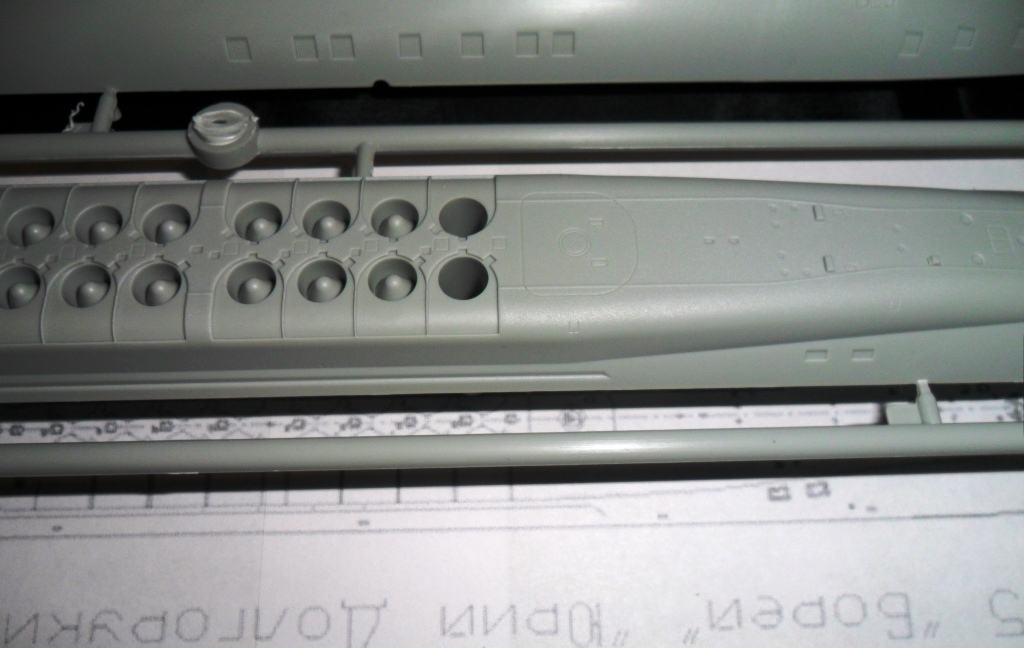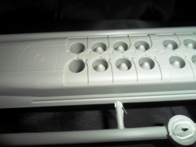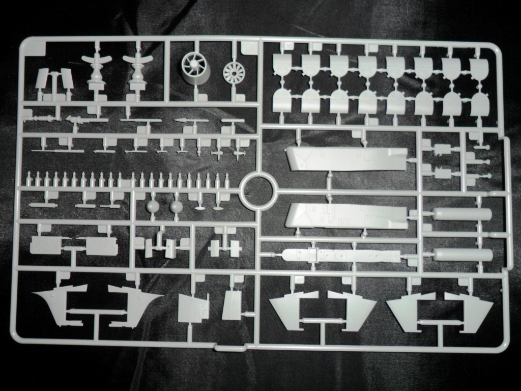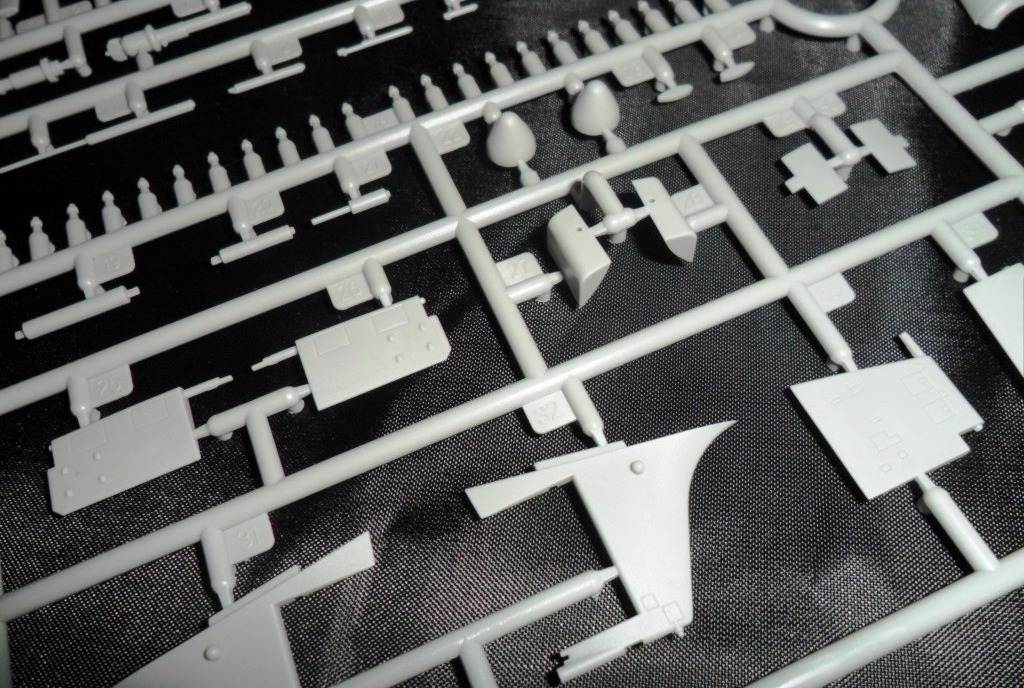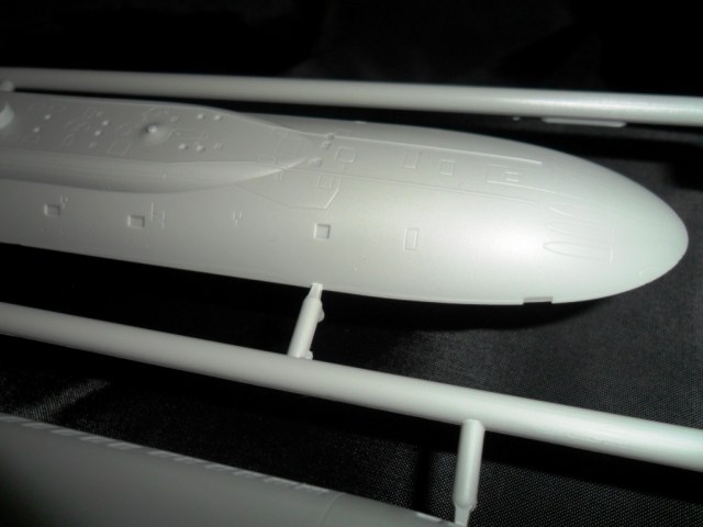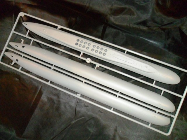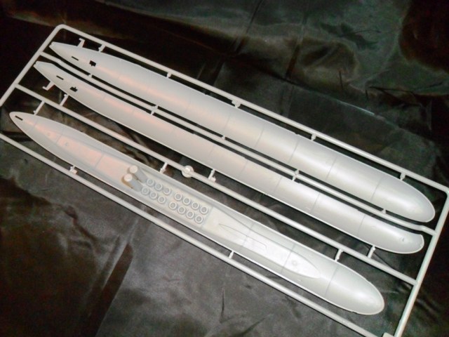 На самой большой литниковой рамке разместились три элемента корпуса подлодки, причем, производитель изготовил верхнюю часть модели по ватерлинию одной деталью (несомненный плюс для диорамщика), нижняя же часть корпуса представлена двумя деталями - левой и правой половинками. Ракетные шахты выполнены производителем в открытом виде, с видимыми головками ракет RSM-56 "Bulava", причем две шахты сделаны вообще полыми на всю высоту для размещения моделей самих ракет. Еще, на внутренних частях корпуса модели, отлиты ребра поперечной жесткости корпуса лодки, что должно облегчить сводимость половин при склейке.