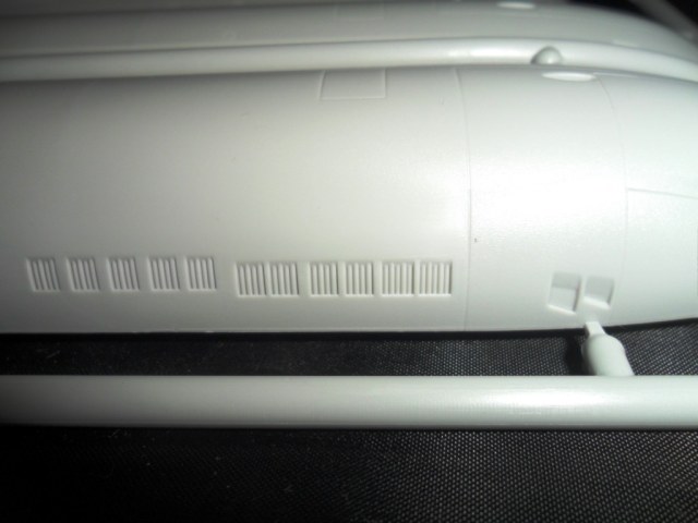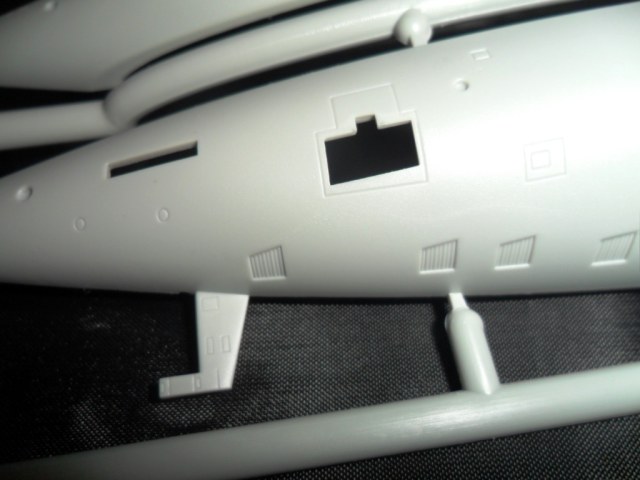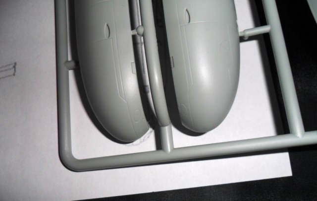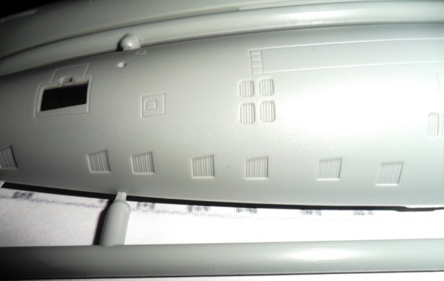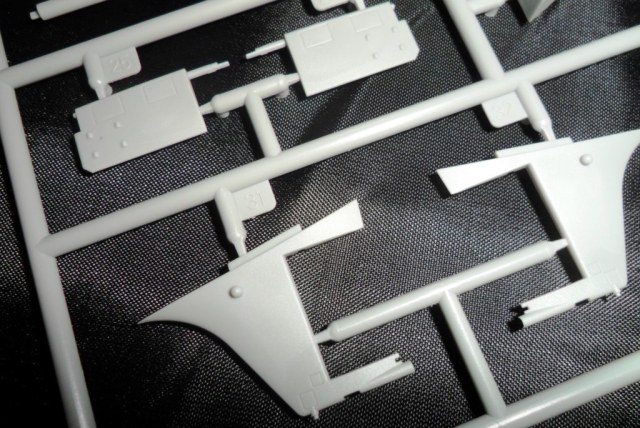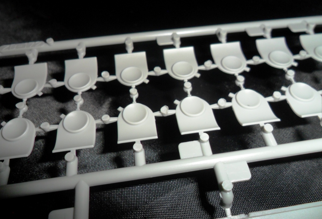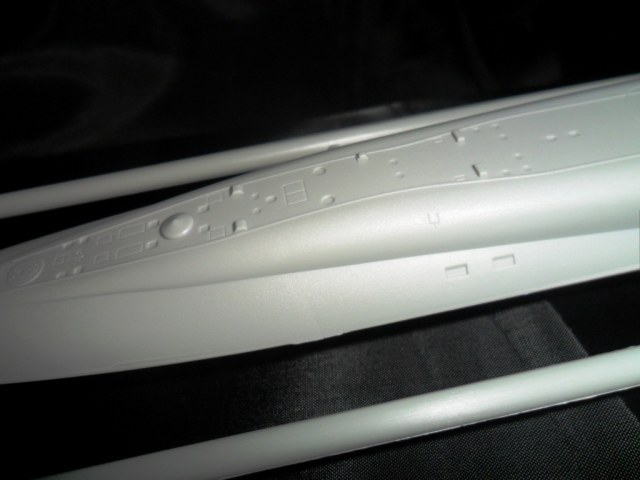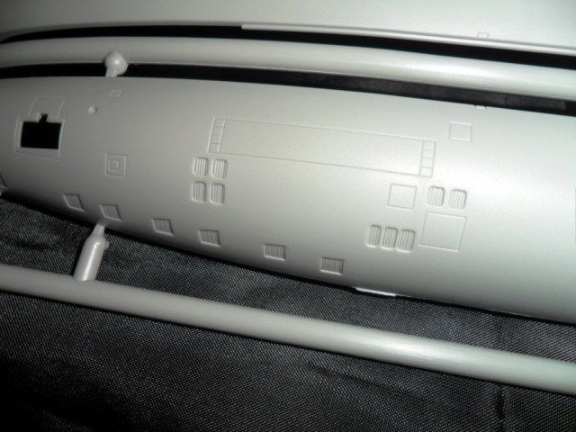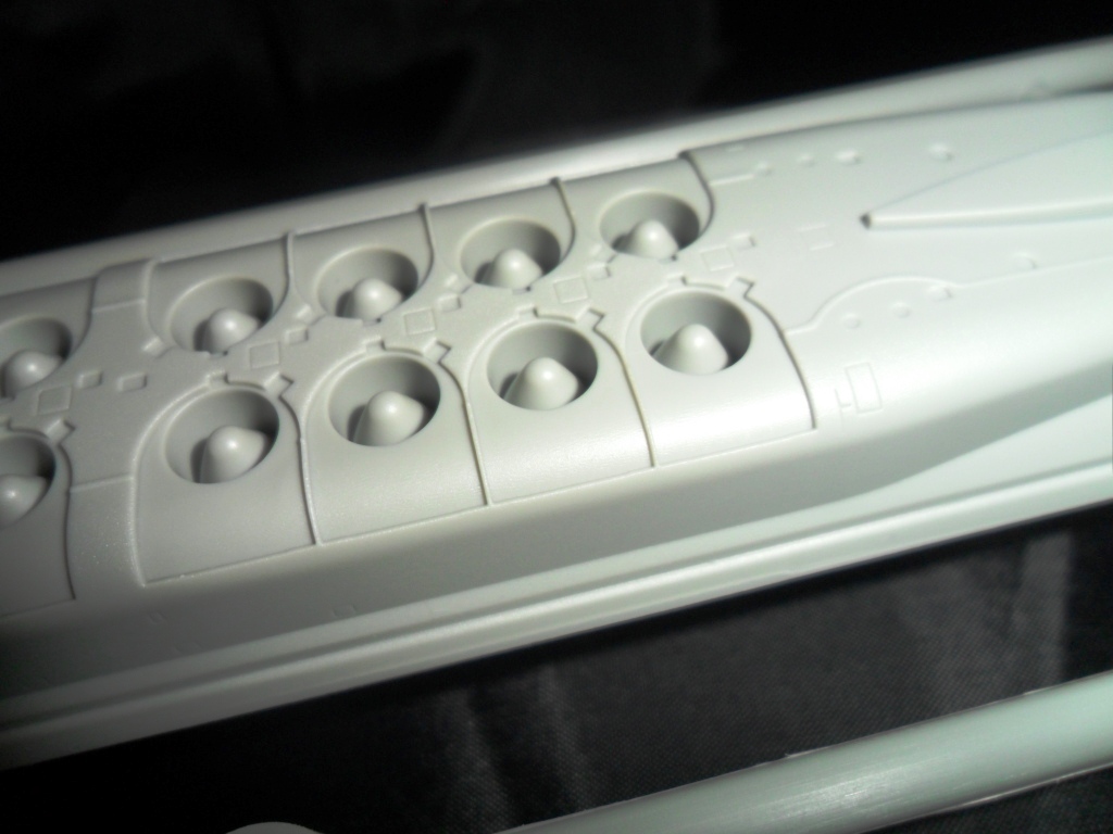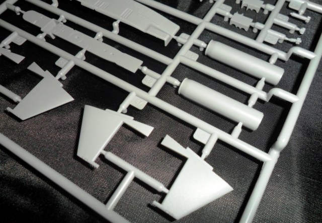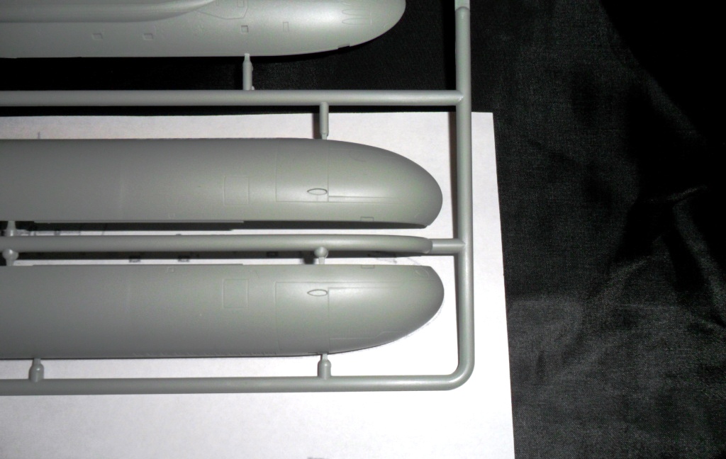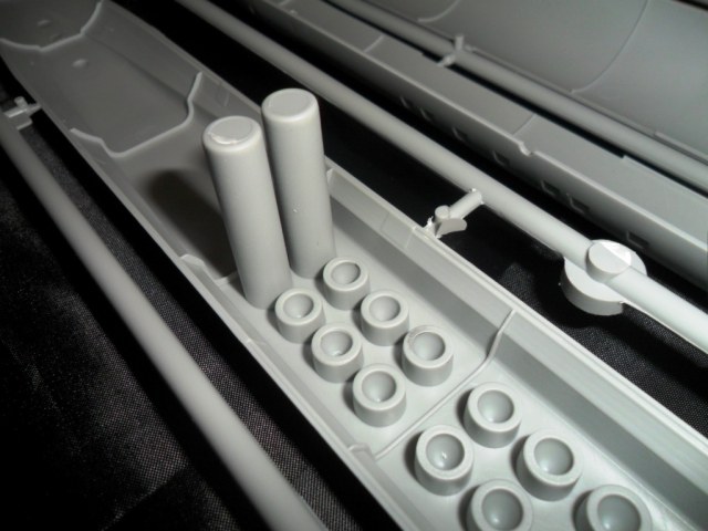 На самой большой литниковой рамке разместились три элемента корпуса подлодки, причем, производитель изготовил верхнюю часть модели по ватерлинию одной деталью (несомненный плюс для диорамщика), нижняя же часть корпуса представлена двумя деталями - левой и правой половинками. Ракетные шахты выполнены производителем в открытом виде, с видимыми головками ракет RSM-56 "Bulava", причем две шахты сделаны вообще полыми на всю высоту для размещения моделей самих ракет. Еще, на внутренних частях корпуса модели, отлиты ребра поперечной жесткости корпуса лодки, что должно облегчить сводимость половин при склейке.