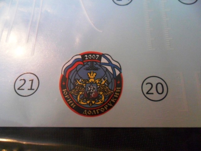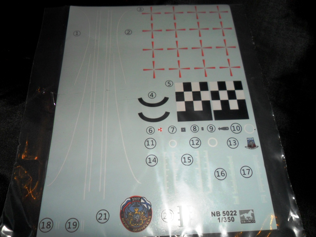 На листе с декалями сразу бросаются в глаза два черно-белых квадрата, на подобие шашек таксомоторов, но это не для самой лодки (да и как такое может быть), а для двух моделей ракет. Кроме того, на листе имеются изо,ражения эмблемы лодки, включая украшение обтекателя ГАС кот. было при торжественном спуске лодки на воду, а так же различные марки диферентовки, КВЛ, люков и.т.д..
