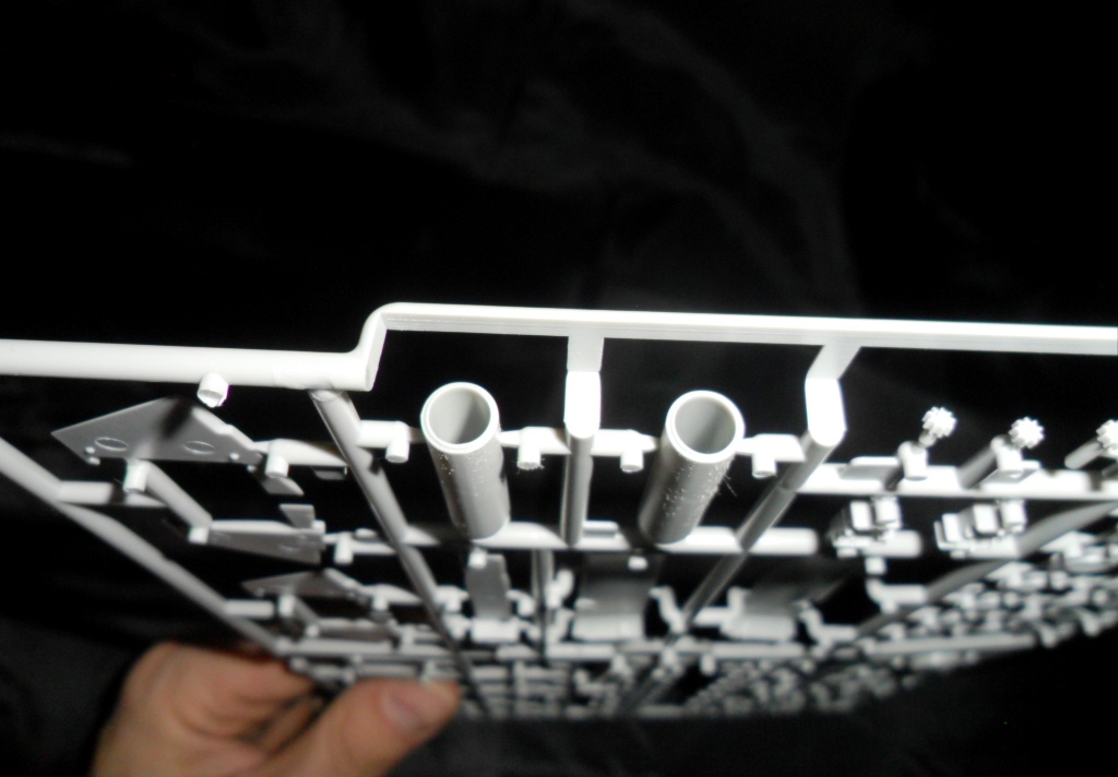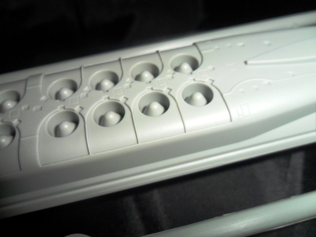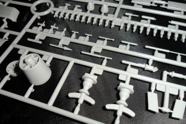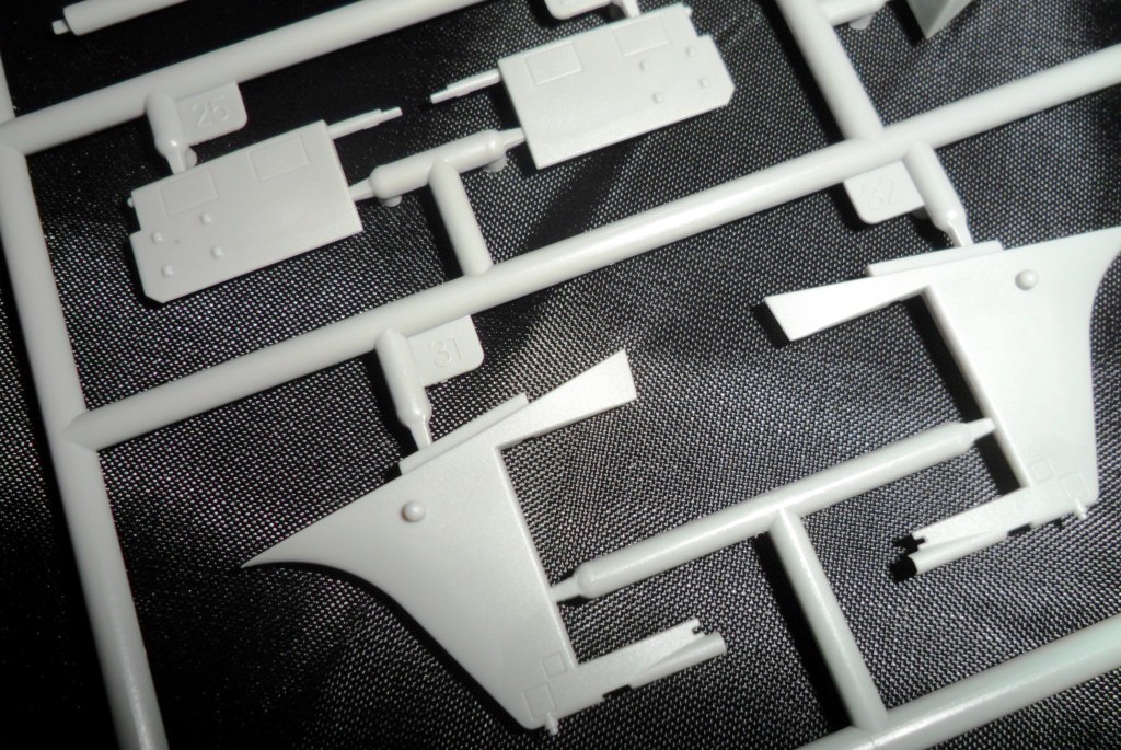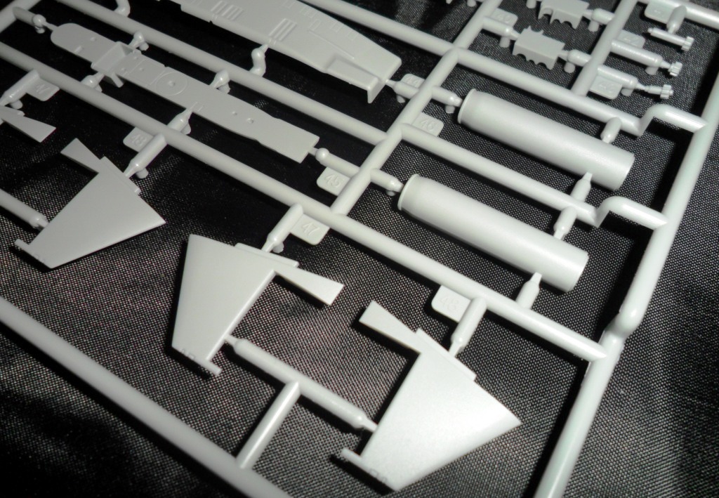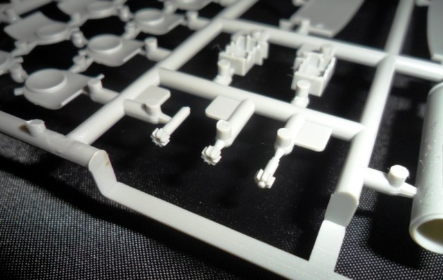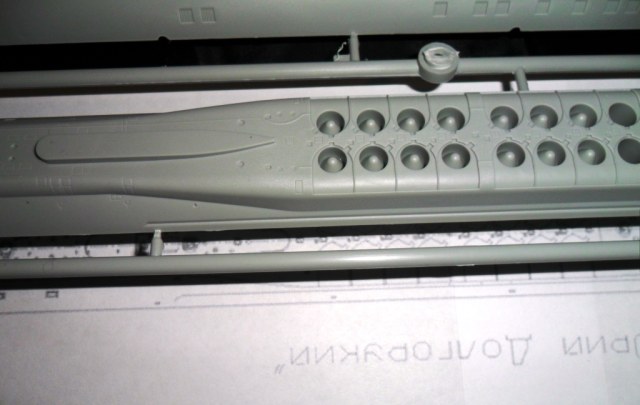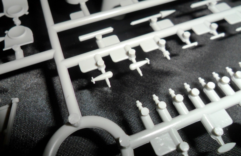 На второй литниковой рамке разместилась вся мелочева: элементы рубки, крышки ракетных шахт, различные ВУ, рули, и.т.д. . Что интересно; производитель предусмотрел такую мелочь, как поворотные элементы кормовой группы рулей. Носовые рули глубины можно сделать выдвинутыми или убранными (имеются и рули и заглушки). Совсем не понятно как ,совершенно без облоя и утяжин, у фирмы получилось отлить целиком цилиндры ракет Булава да еще полыми внутри???