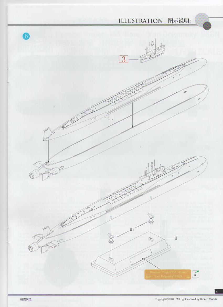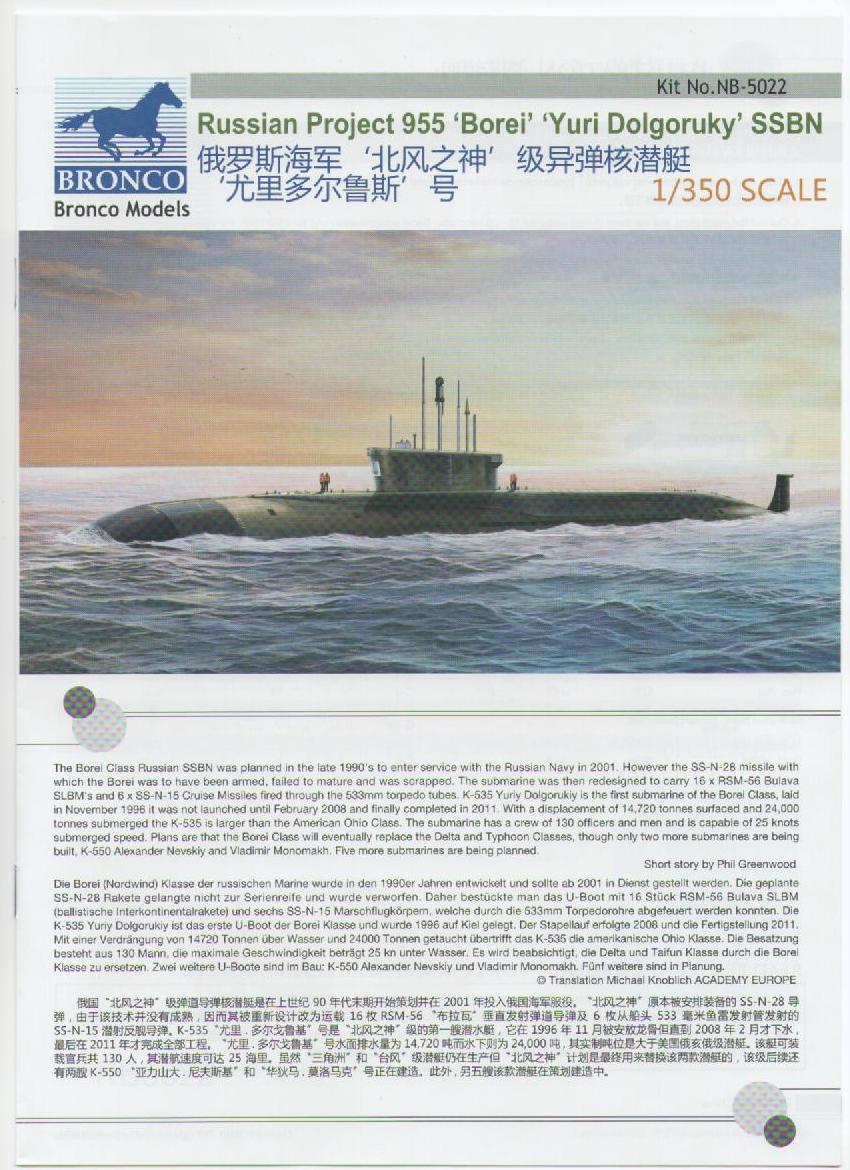 Представляю Вашему вниманию очередную новинку модели подводной лодки класса "Борей" в масштабе 1:350 от китайского производителя "BRONCO". Чуть раньше Данила (Dard77) уже делал обзор подобной модели, но от фирмы "Hobby-Boss", так что подробней о прототипе можно прочитать там, я же остановлюсь на деталировке этого набора.