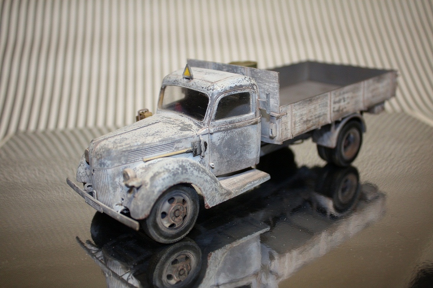Краска акрил от тамии. Хотел изобразить потертости зимнего "камо". Делал первый раз при помощи лака для волос. Вариант расскраса получился скорее послезимний... По планам прицепить Pak-40 и загрузить кузов. Вроде всё...