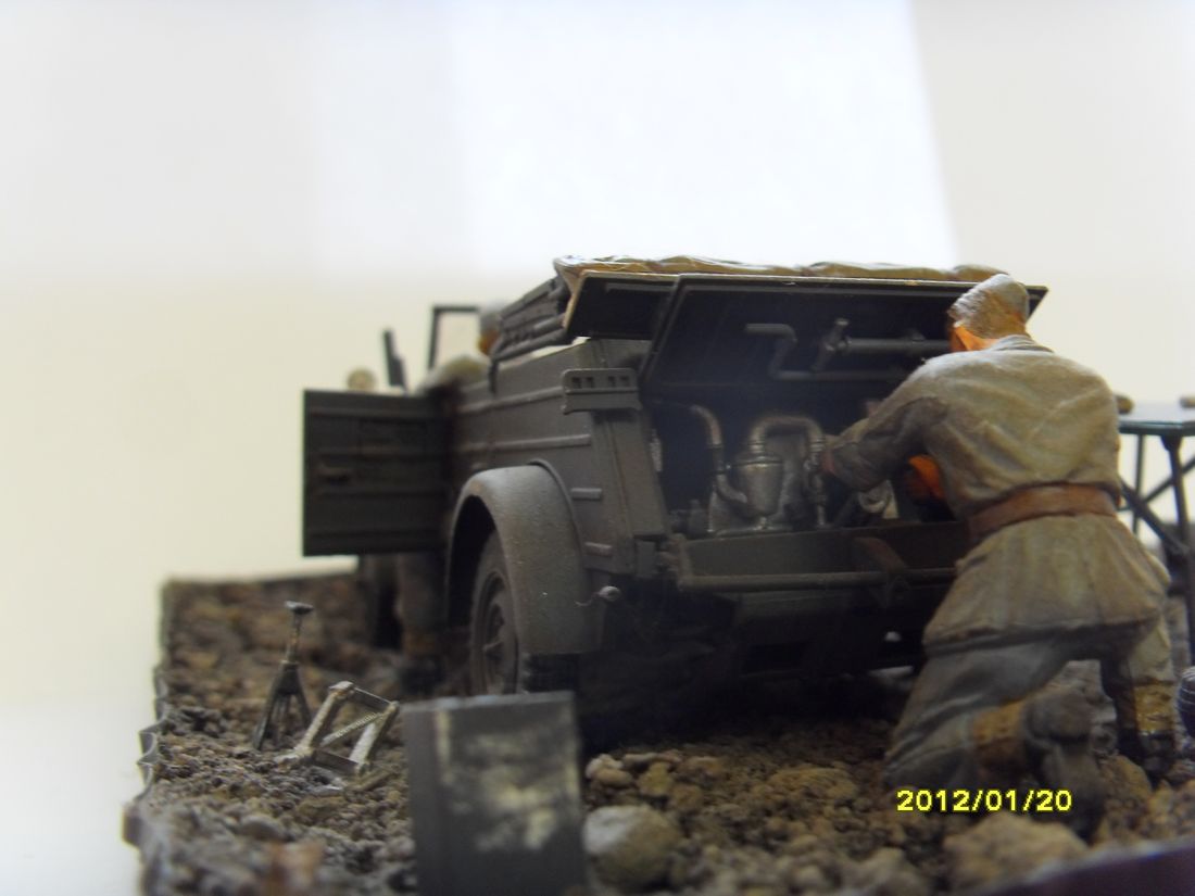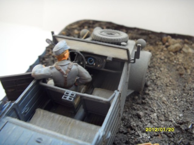 Видите ли Влад... Так, как водитель одет в китель м-43 (43-года выпуска) да еще и с гетрами, которые ранее лета-осени 43 на фронте и не встречались, да и кепи то же самое, то сам аппарат никак не может быть серым панцер-грей. Тамия позиционировала сей кит на период с 1943 и далее... Тут либо менять персонажей, либо перекрашивать тачку. Вообще, цвет гетр, амуниции здорово мимо кассы - увы.