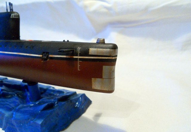 Покраска эмалями Revell и Звезда. Нижняя часть корпуса покрыта акриловым глянцевым лаком Revell. Верхняя - матовым Tamya, стравленным из баллона. Ржавчина - смывка MiG.