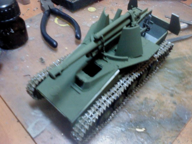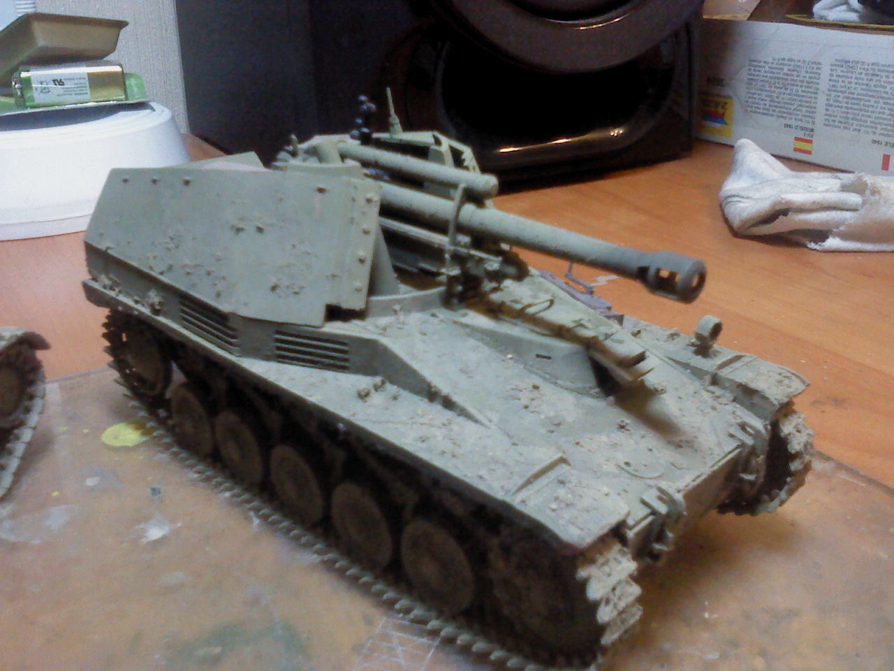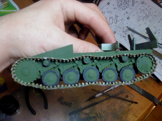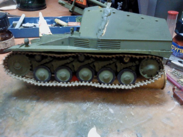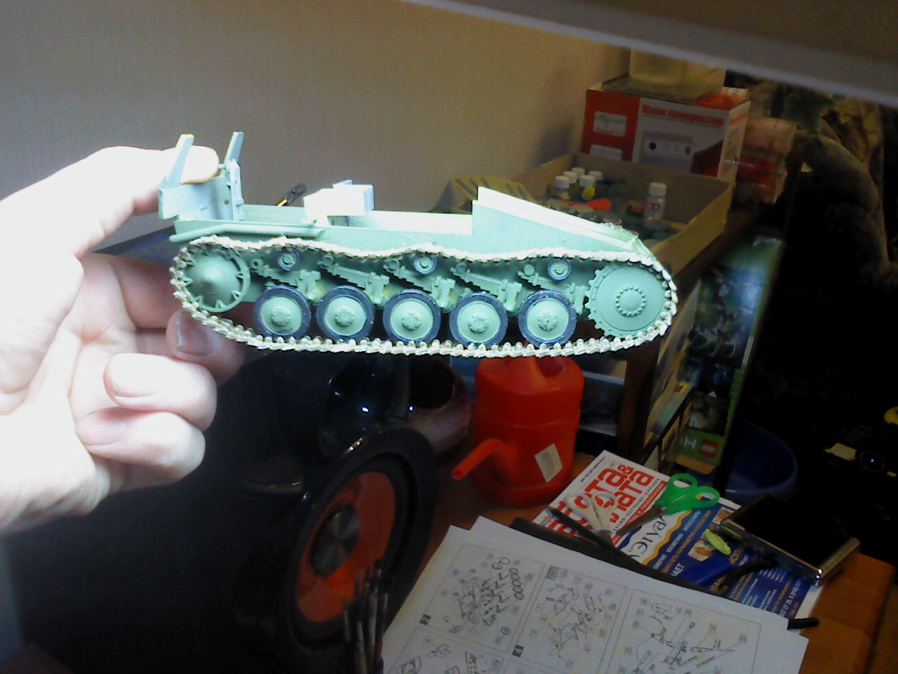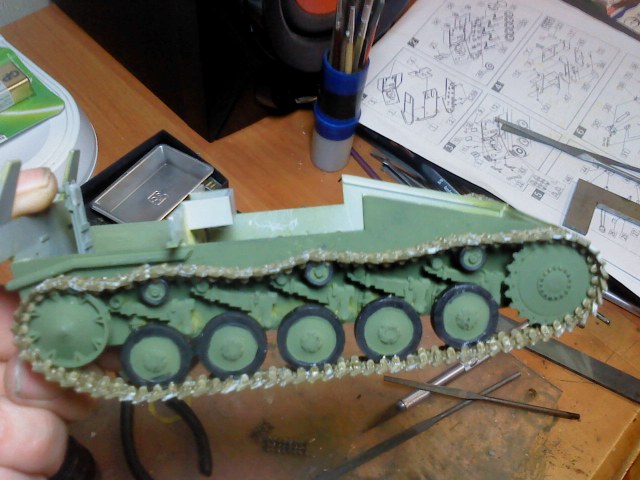 привет друзья и гости процесс сборки насекомого от АРК моделз был довольно сложен так как все выполнено на базе фирмы АЛАН а у них катки не встают в траки, пришлось все подпиливать заново сделать валы крайних опорных катков по обеим бокам, много подпиливать и подгонять но в целом вышло неплохо получил то что хотел
