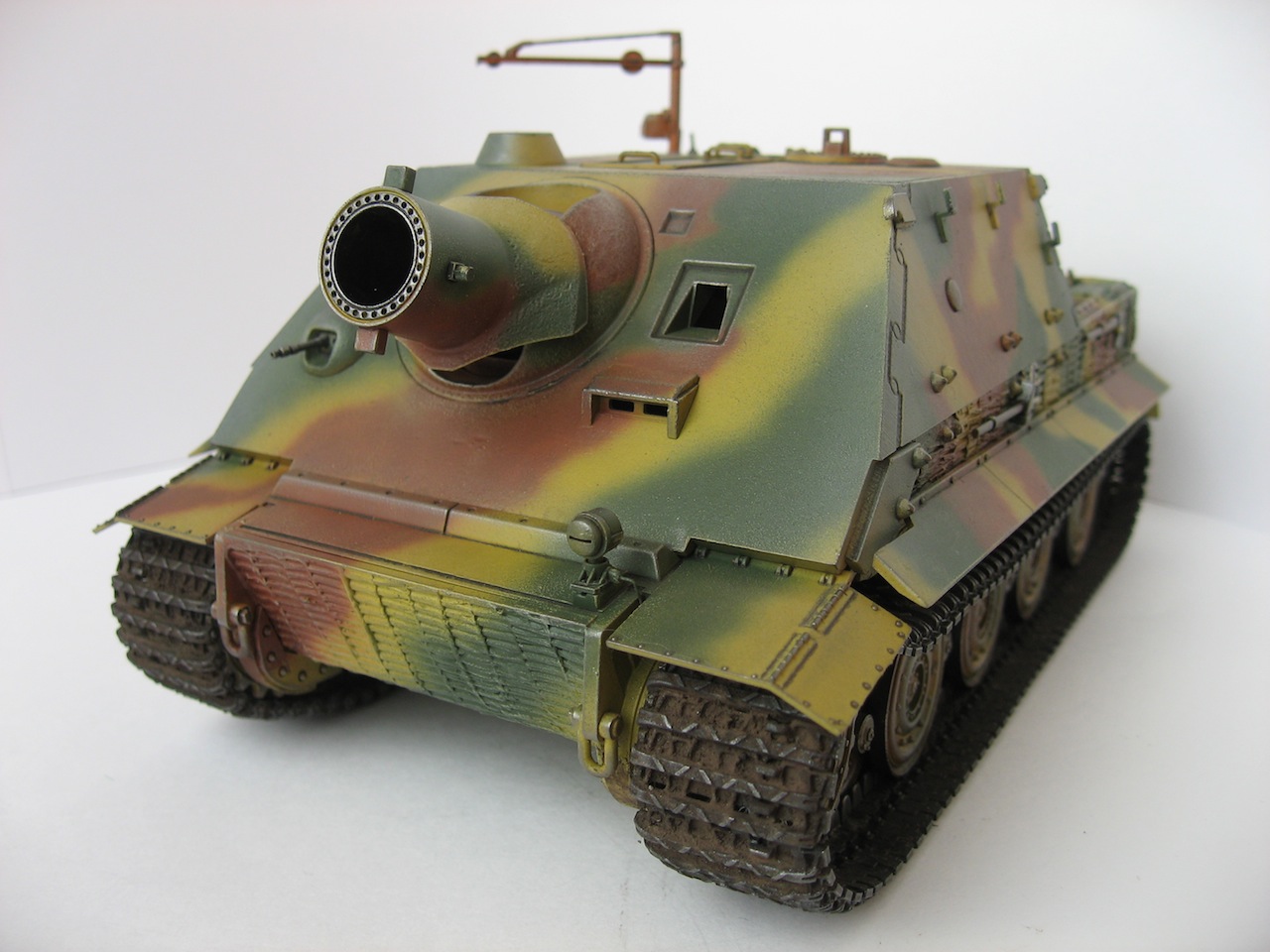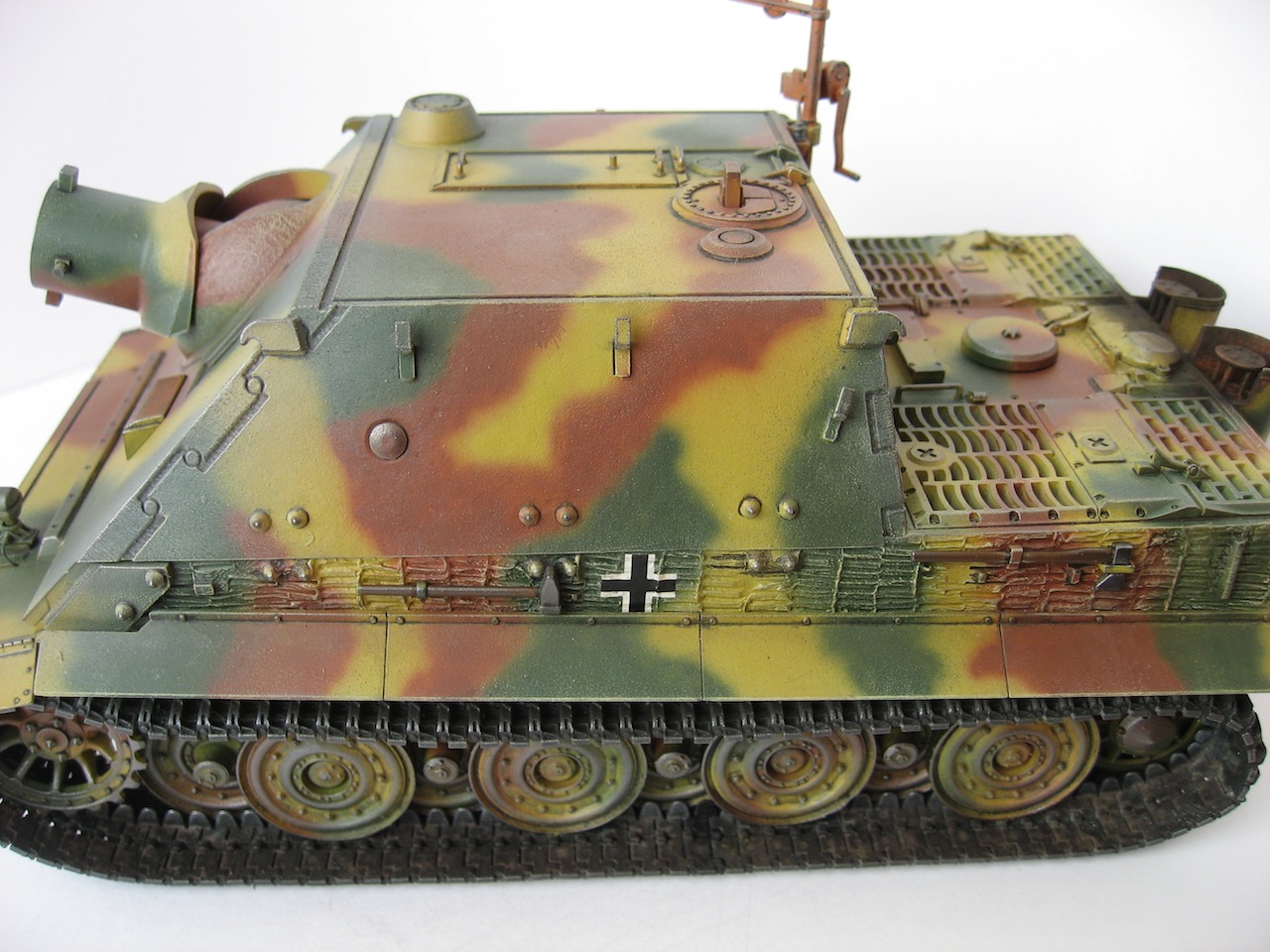 Тамиевский штурмовой тигр. Собирал из коробки. Ничего не добавлял. Циммерит делал тамиевской двухкомпанентной шпаклевкой и пробкой от Кока-Колы. Красил эмалью Тамия. Загрязнял ходовую пигментами MIG.
