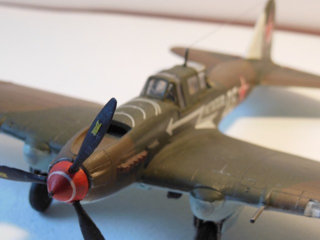 странный окрас! почему вместо черного коричневый?!! АНО не накрашены... нет пулемета в кабине стрелка... нет антенны.. модель явно не закончена...