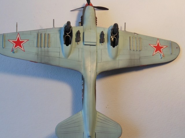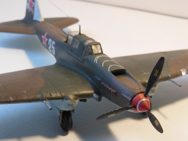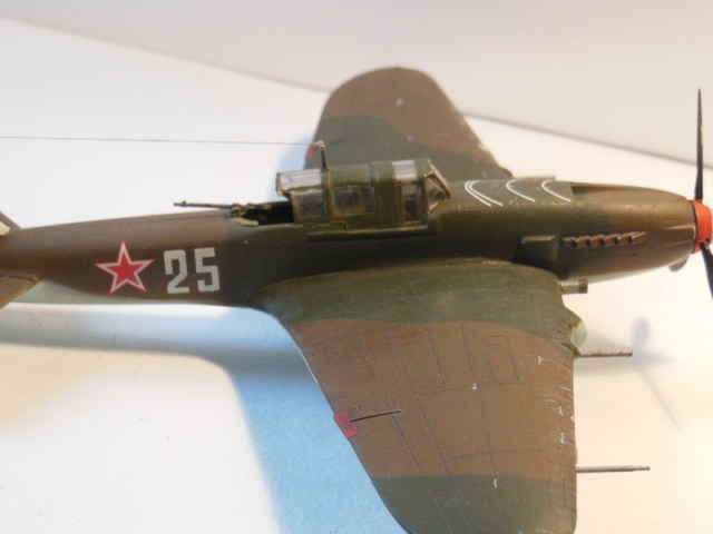 Представляю вашему вниманию очередную модель ил-2. Собирал в течении недели. Сборка затруднений не вызывала. Стыковка деталей хорошая. Шпаклёвки ушло мало. Верх окрашен кистью акрилом от "Звезды", а низ окрашен аэрографом эмалями супер от той же "Звезды". Уже после сборки обнаружил, что стойки шасси установлены не правильно, но переделать их уже нельзя.