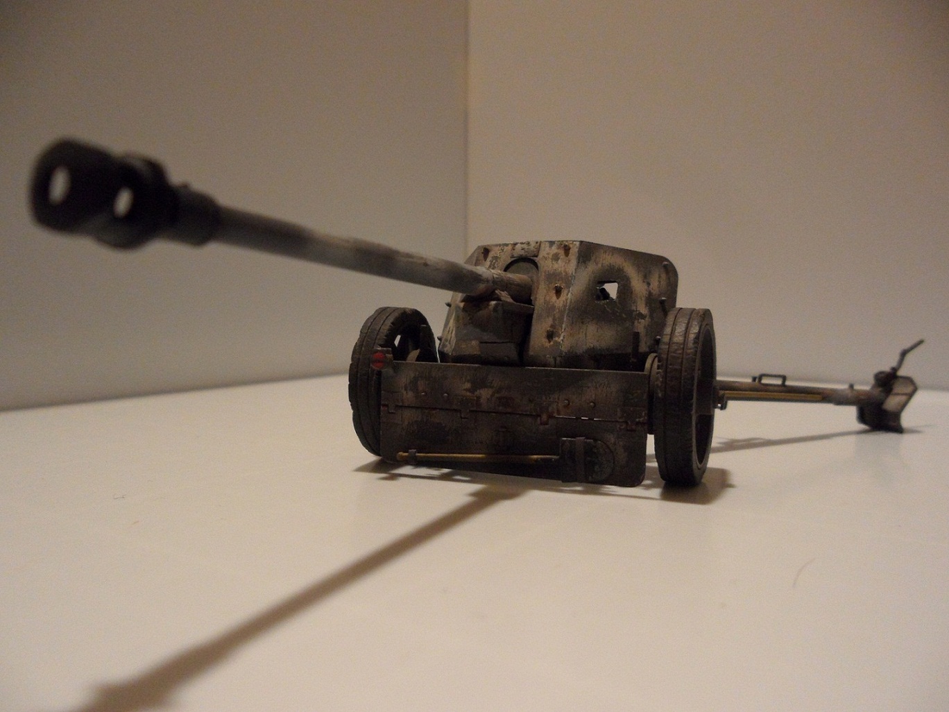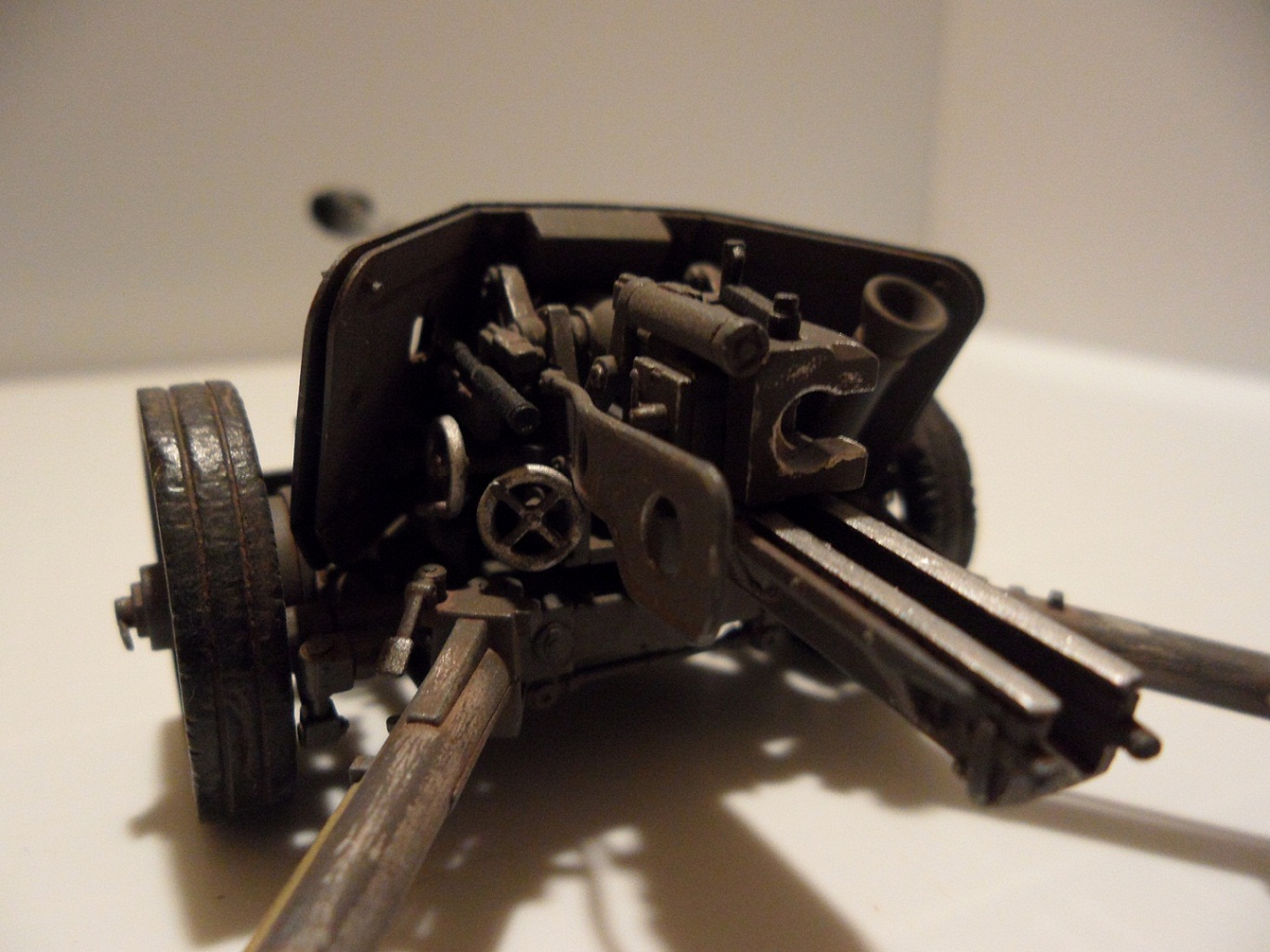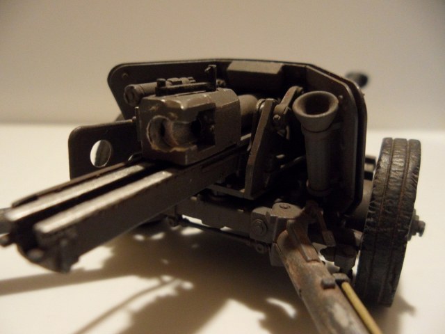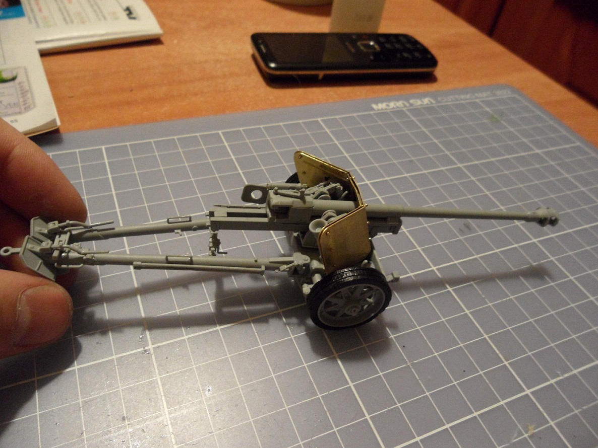 Приветствую! Модель собиралась из коробки. Набор дает травленый бронещит, три варианта по сборке колес и дульного тормоза. Так же даются фигурки солдат, которых собирать пока не умею...))