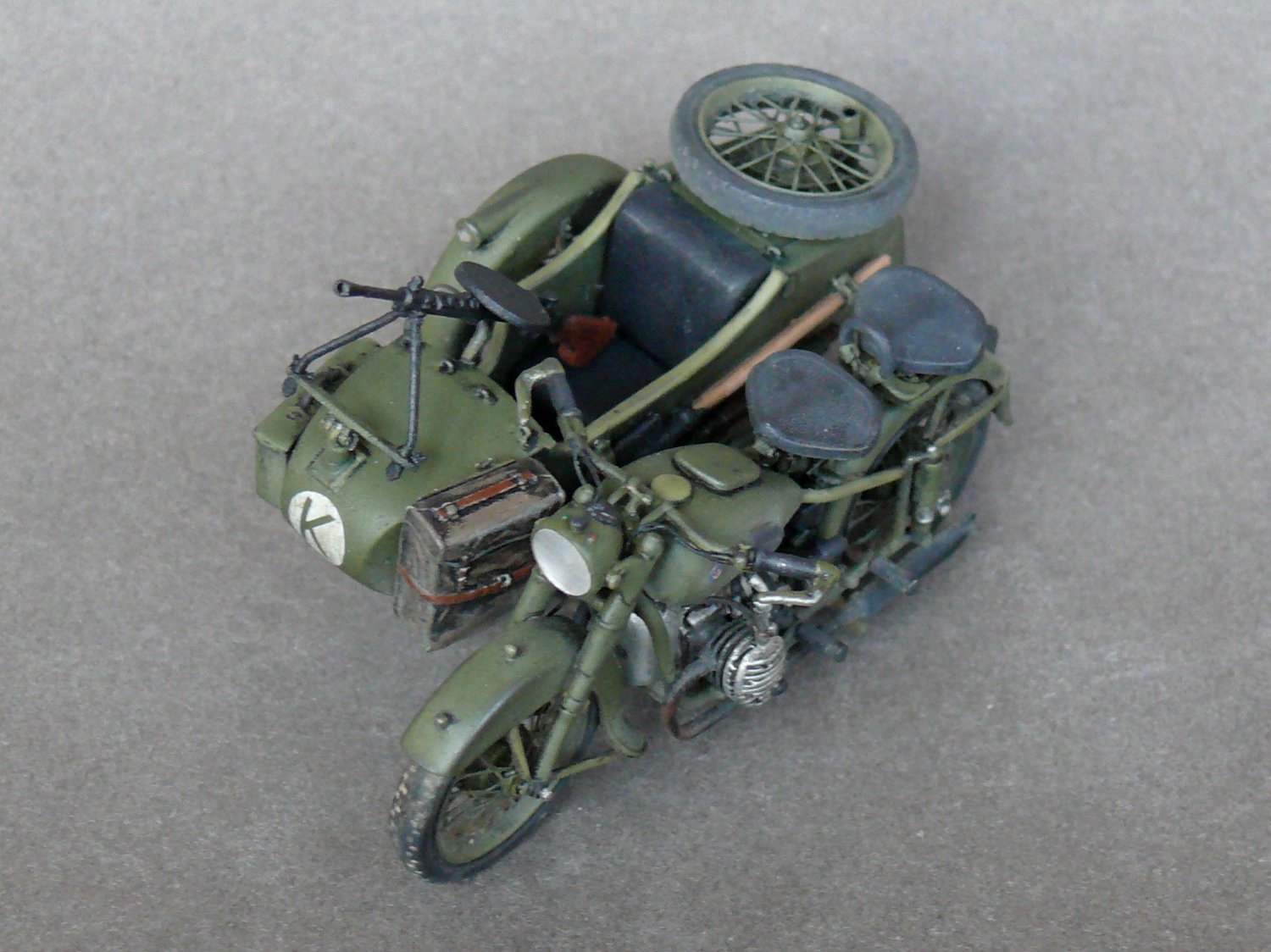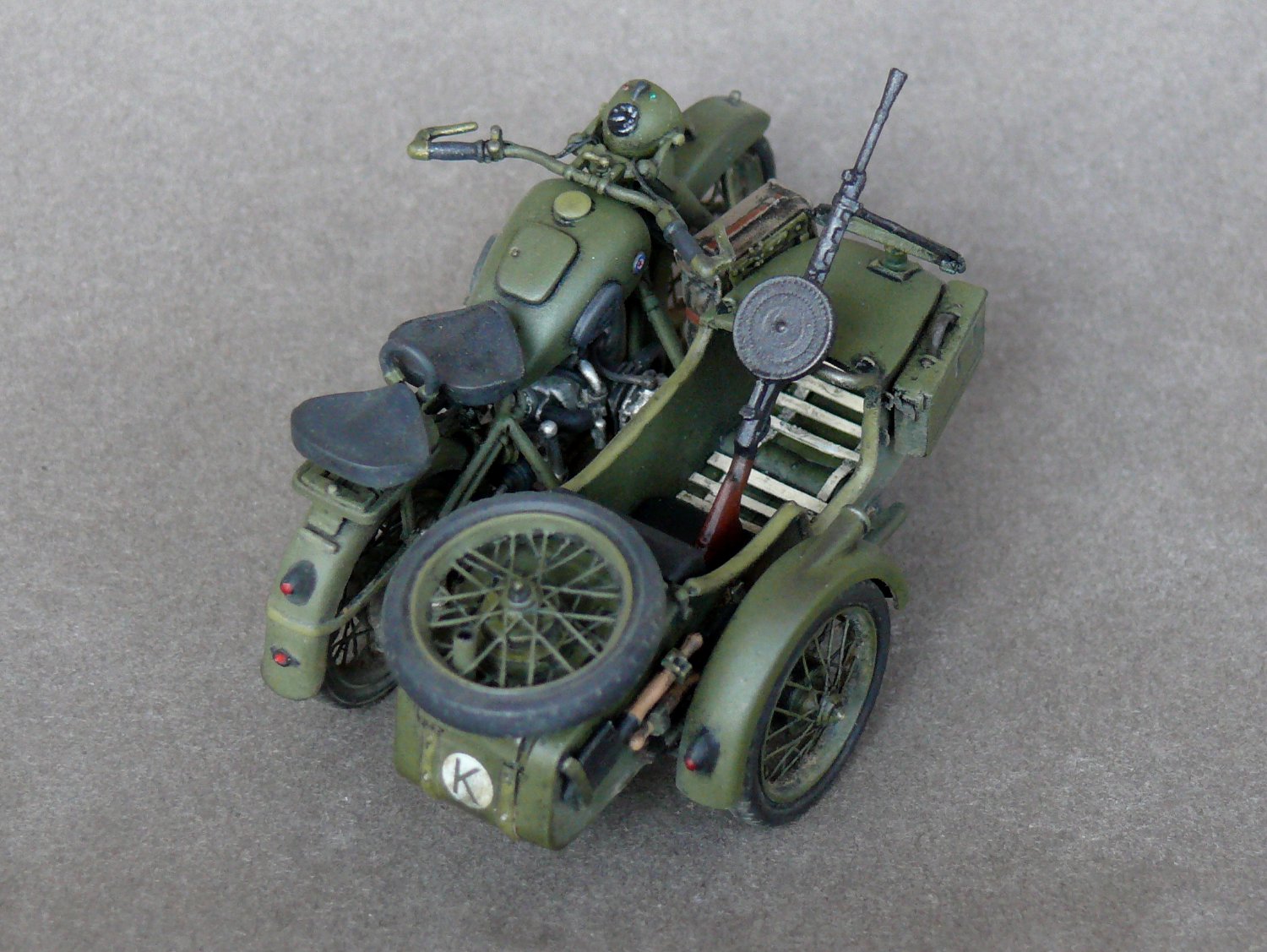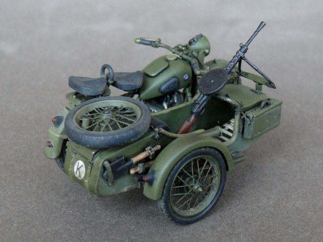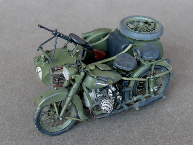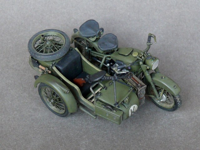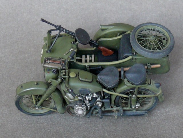 Педставляю новинку от Звезды в моем исполнении.Сам по себе великолепый Кит был разбавлен травлеными спицами и фарой Эльф,сделаны топливопроводы и краник бензобака,тросы и провода на свечи,такдже настил в коляску. Приятного просмотра.