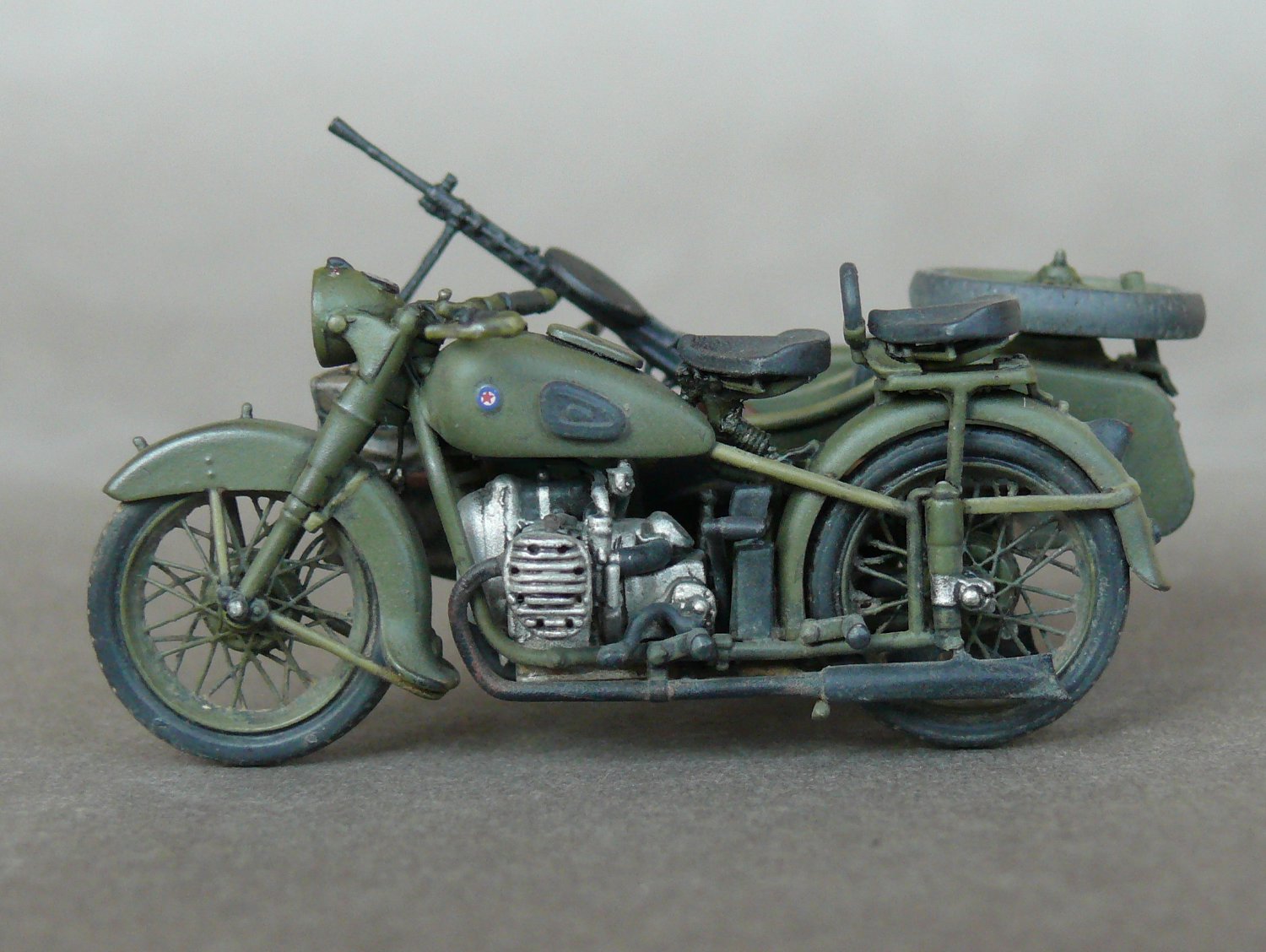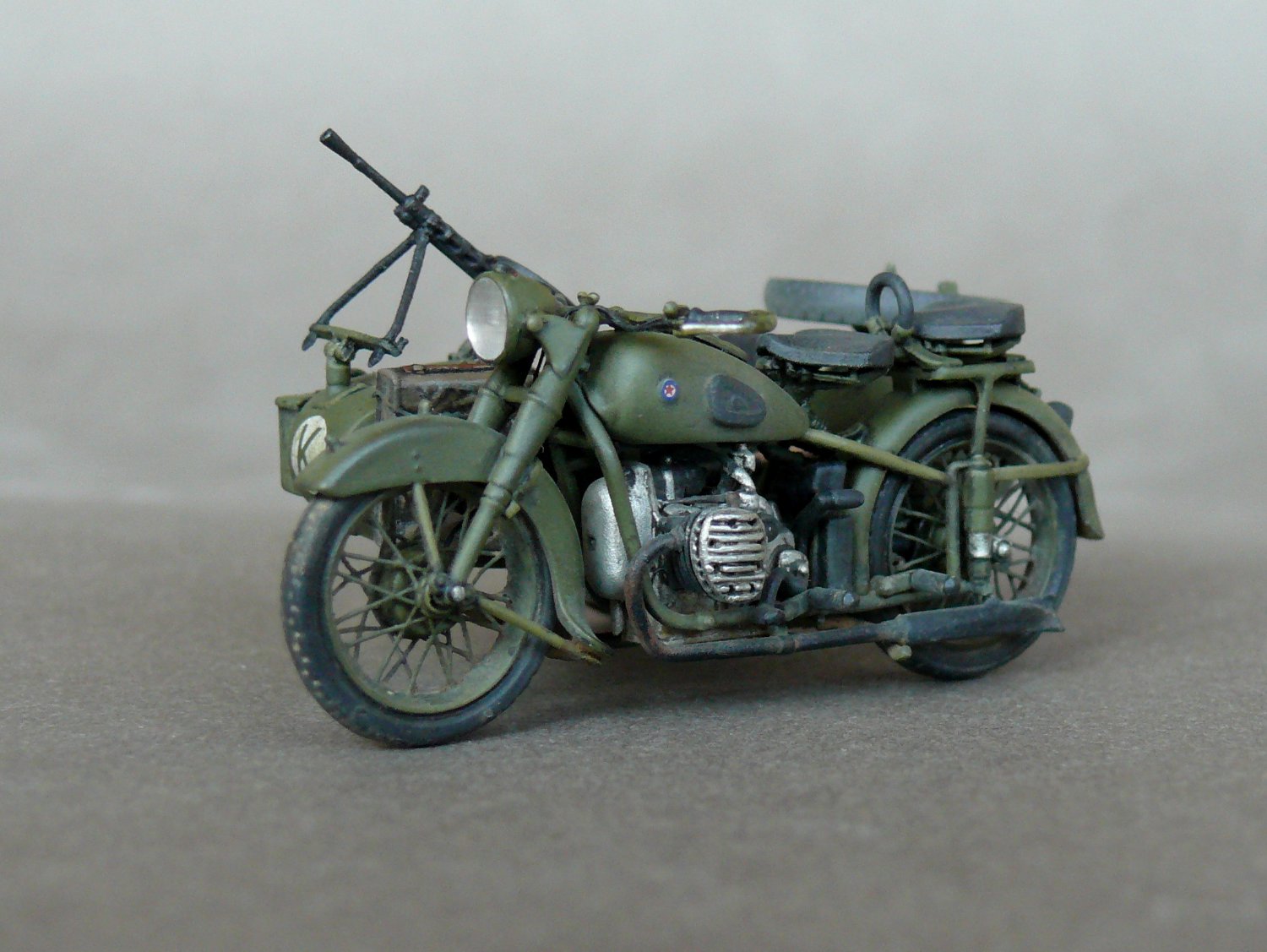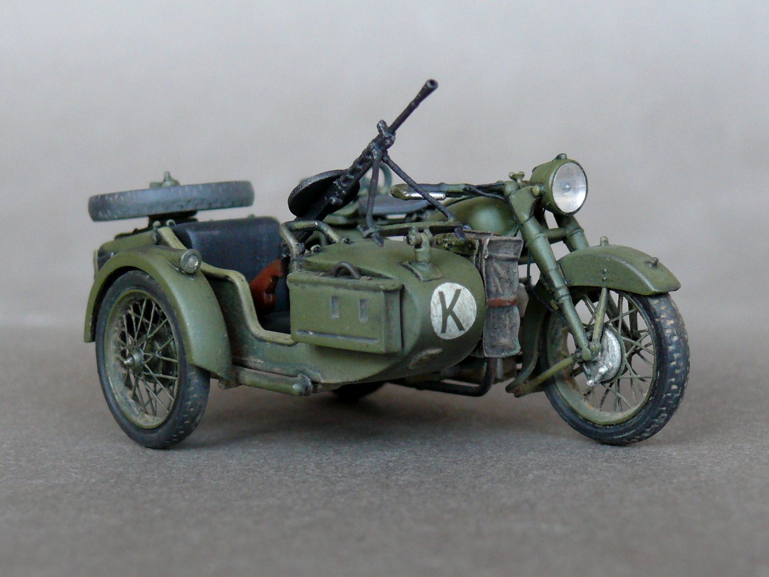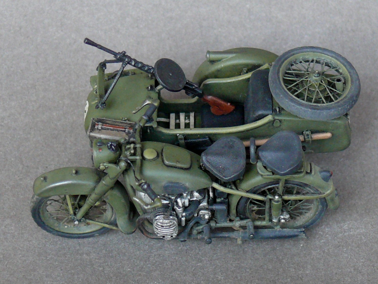 Педставляю новинку от Звезды в моем исполнении.Сам по себе великолепый Кит был разбавлен травлеными спицами и фарой Эльф,сделаны топливопроводы и краник бензобака,тросы и провода на свечи,такдже настил в коляску. Приятного просмотра.