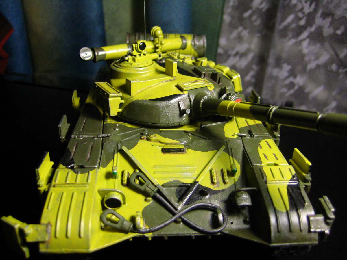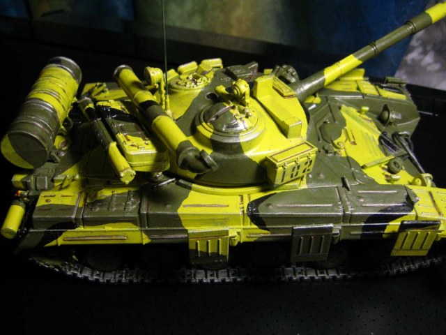 Видны ломаные границы камуфляжа. Некрасиво. Лучше красить по "маскам" - вырезать границы пятен из малярного скотча, или из газет, которые потом намочить и на танк приклеить, или даже выкладывать их из нелипучего скульптурного пластелина. Можно и жидкие маски использовать. Вонь страшная, но полезно и эффективно.