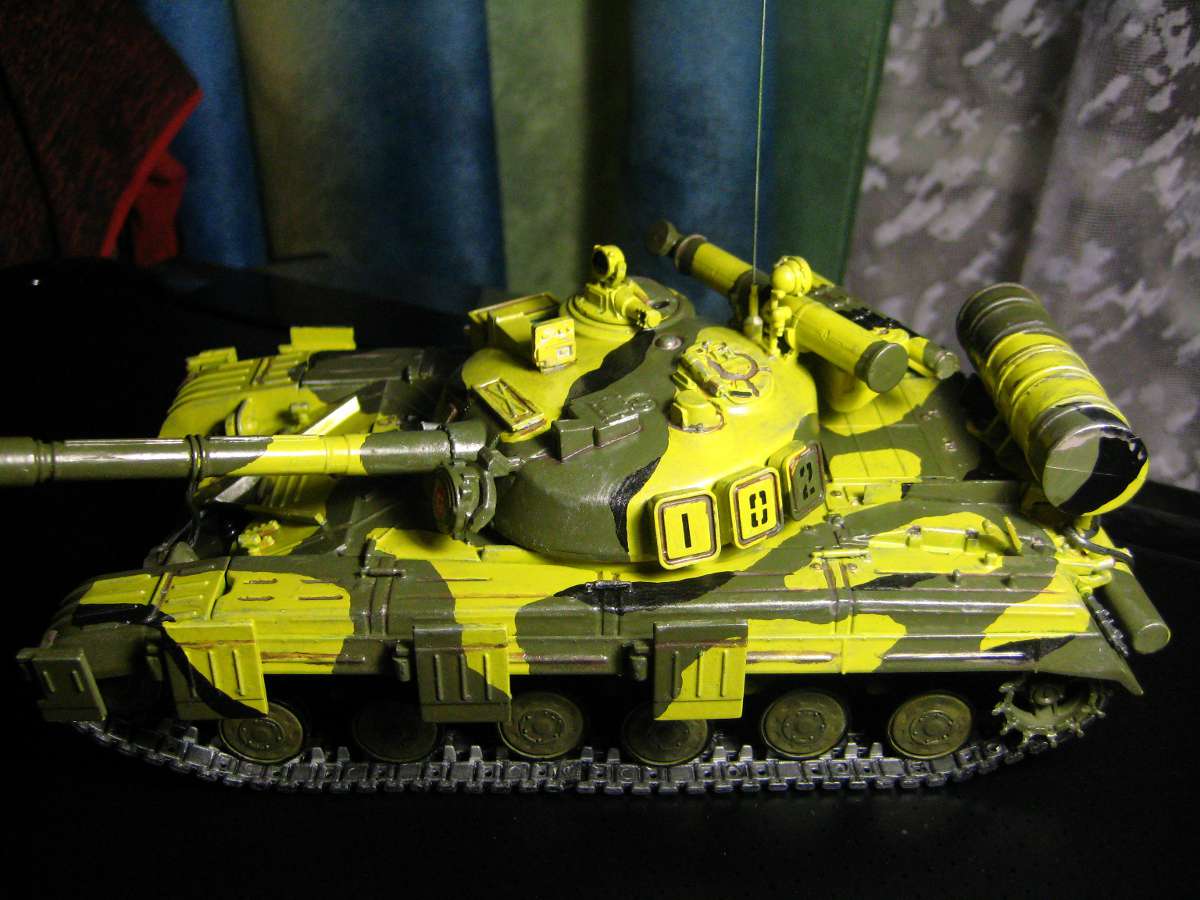 у т-64 нет резиновых бондажей на катках, они полностью метелические! гусли вообще не крашеные, на бревне, трубе ОПВТ и на дополнительных бочках швы видны...Строевые номера мышины белым цветам наносятся... Но для первой машины неплохо конечно же, с уважением!