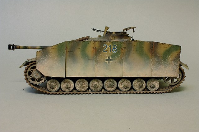 - Циммерит был изготовлен из шпаклевки. По-началу он был имитирован шпаклевкой Polyester Putty фирмы Tamiya, но затем оказалось, что на четвертых Штугах он имел немного другую фактуру - и я решил переделать его, нанося рельеф плоско заточенным черенком кисточки. Тут потребовалась другая шпаклевка - очень долго искал наиболее подходящюю, в итоге остановился на Эпоксилине;
