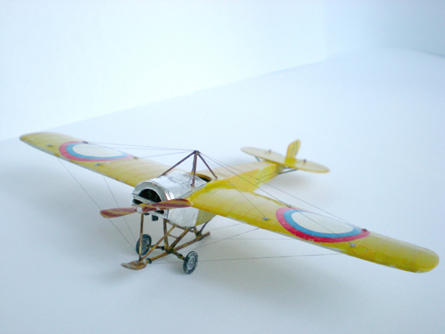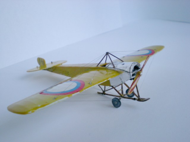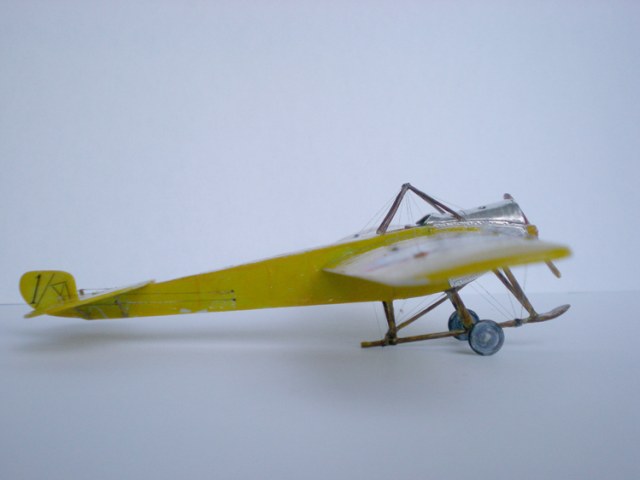 Сборка совсем недурственная. Насчет окраски - в цвет не попали. Да и блеску, кажись, многовато. Возьмите белую, много раз стираную тряпку, пропитайте ее обычным мебельным лаком и увидите, как выглядела обшивка на самолетах времен зари авиации. Касательно облезшей краски в описании уже упомянуто. Модель перед окраской следовало загрунтовать. Кокарды на крылья нанесены абсолютно напрасно, на самолете Петра Нестерова (а номер на хвосте соответствует ему) кокард не было.