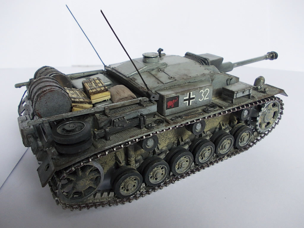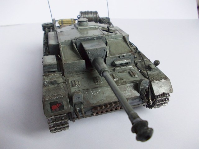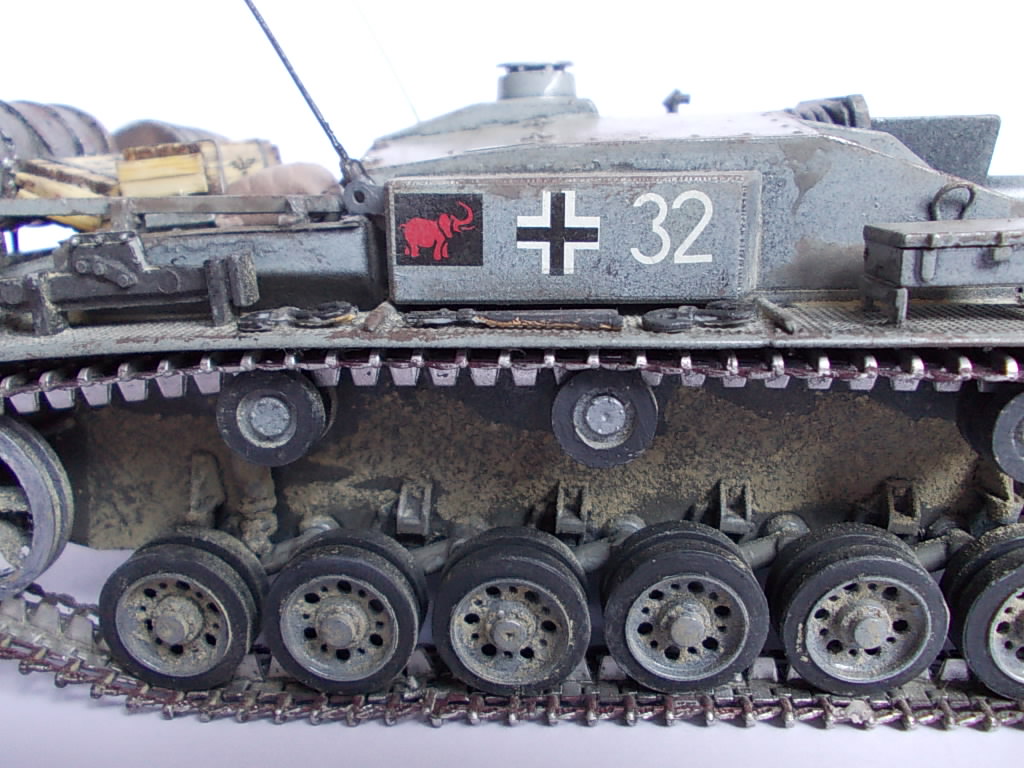 Довольно приятная работа, но есть одно существенное "но" - с декалями Вы, к сожалению, повторили все косяки Звезды. У 203-го батальона штурмовых орудий слон был белым ... Да и спереди тактические обозначения (батальонные и батарейные) наносились не на крылья (там были только белые полосы, да и то не всегда), а на лобовую плиту.